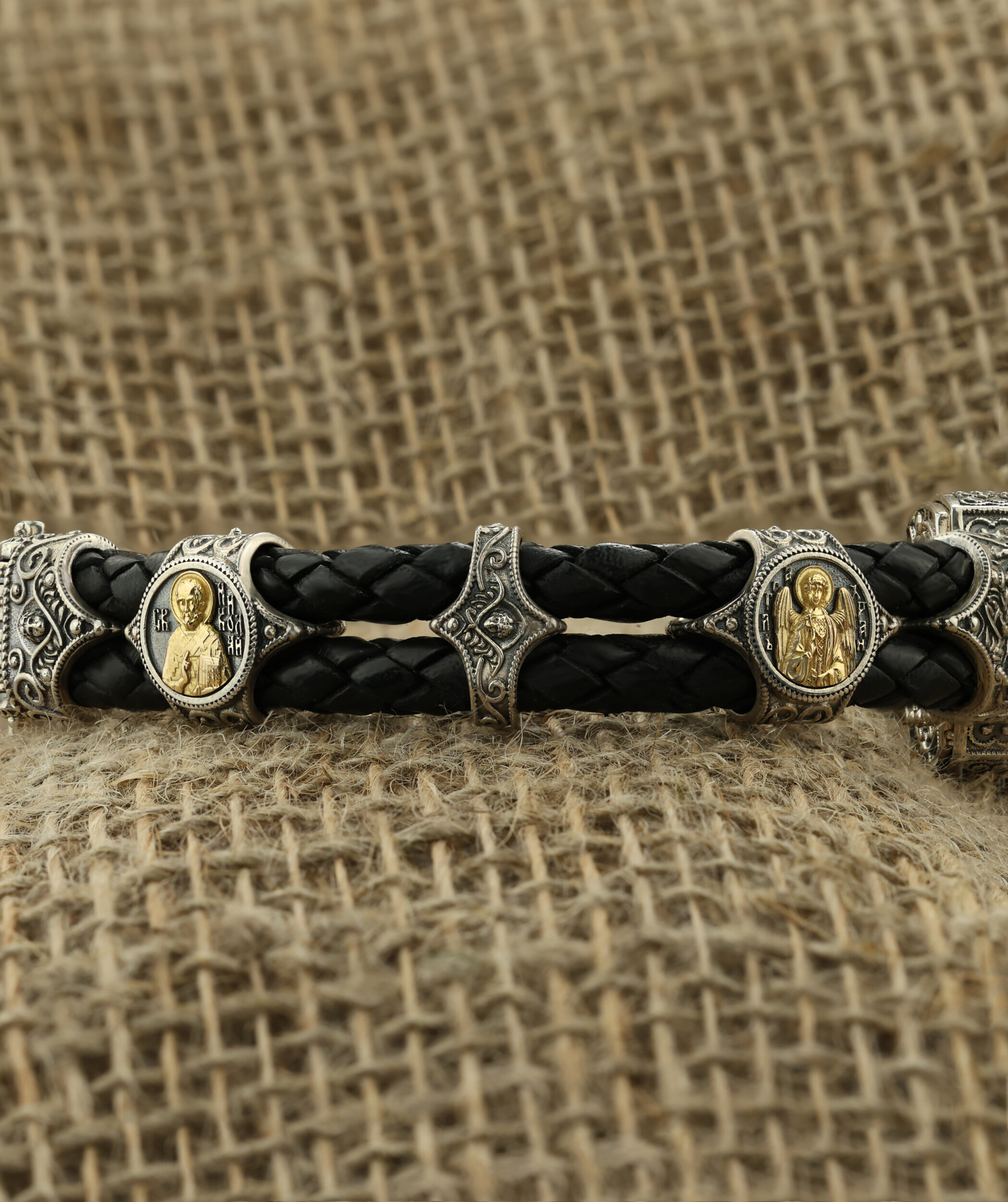 Браслет из серебра и золота c кожаным шнурком