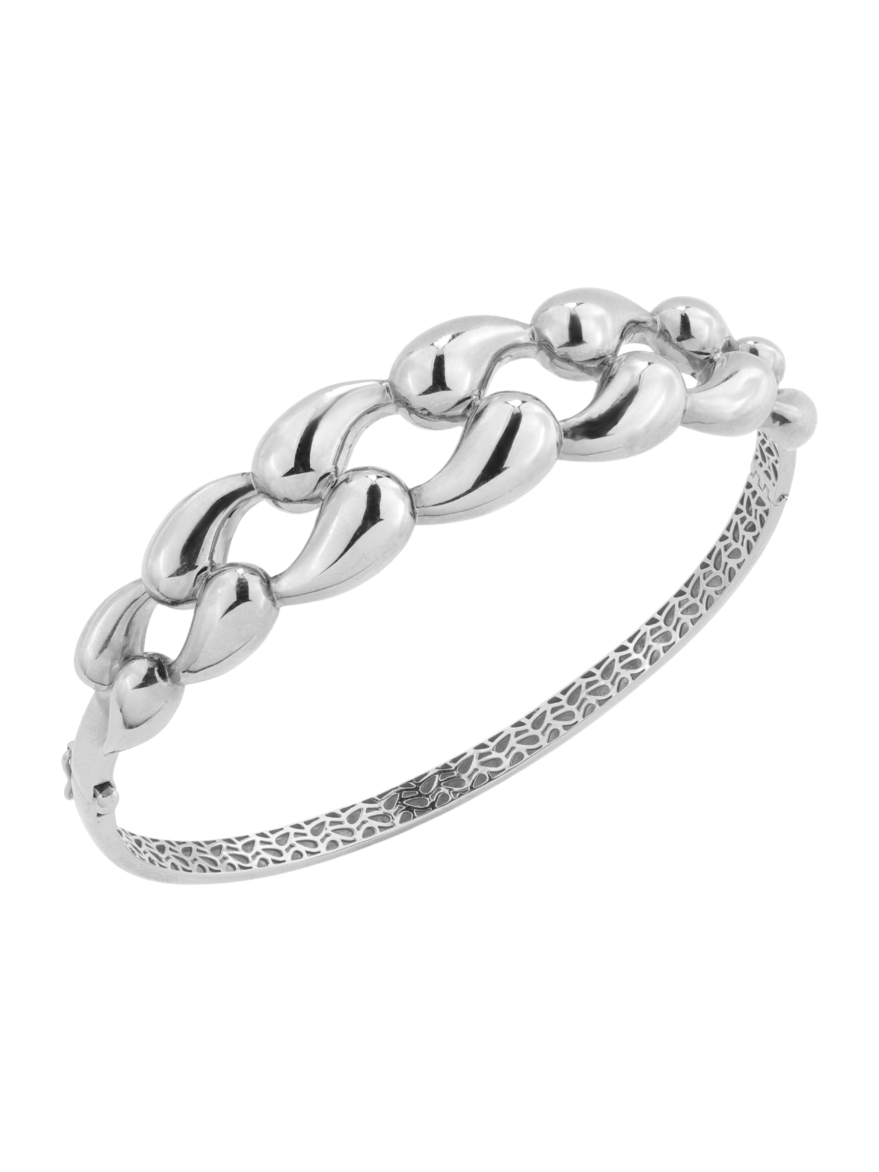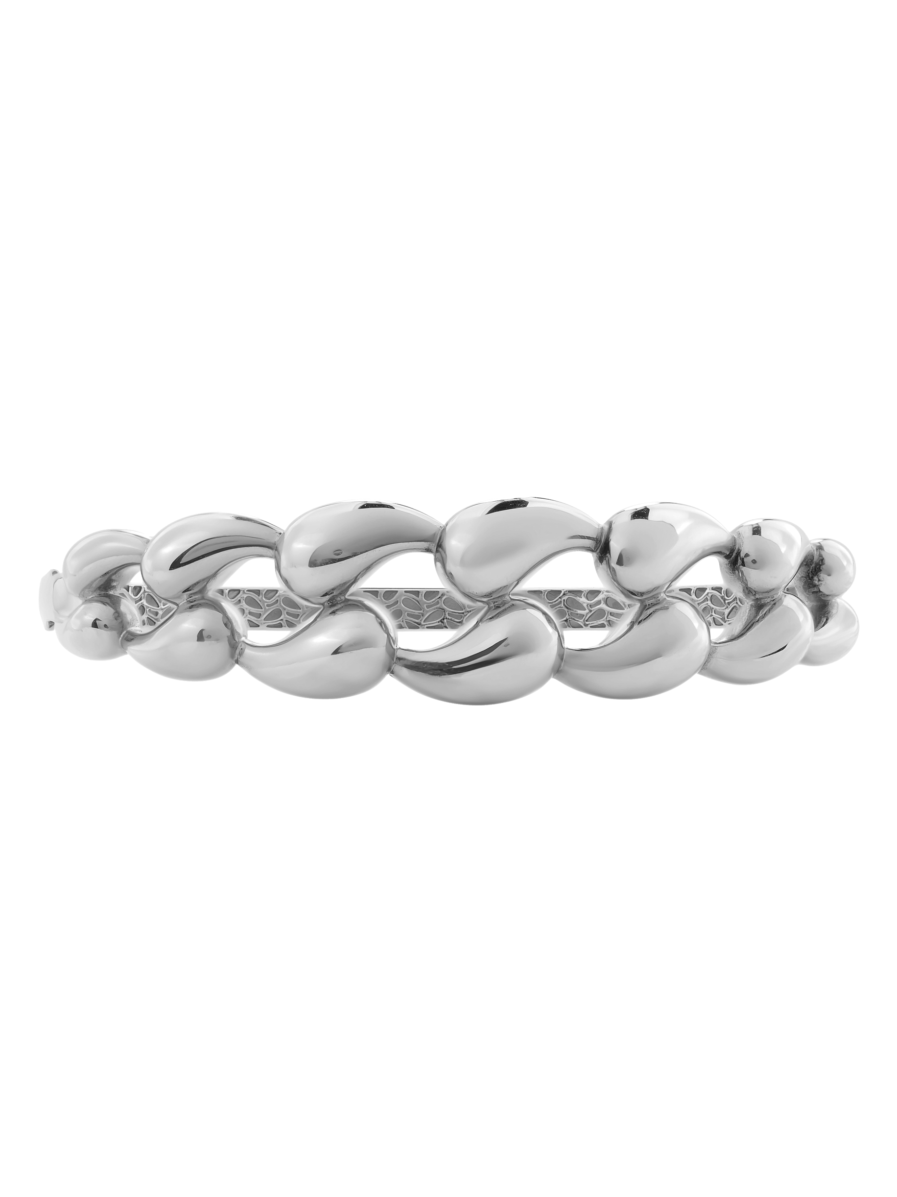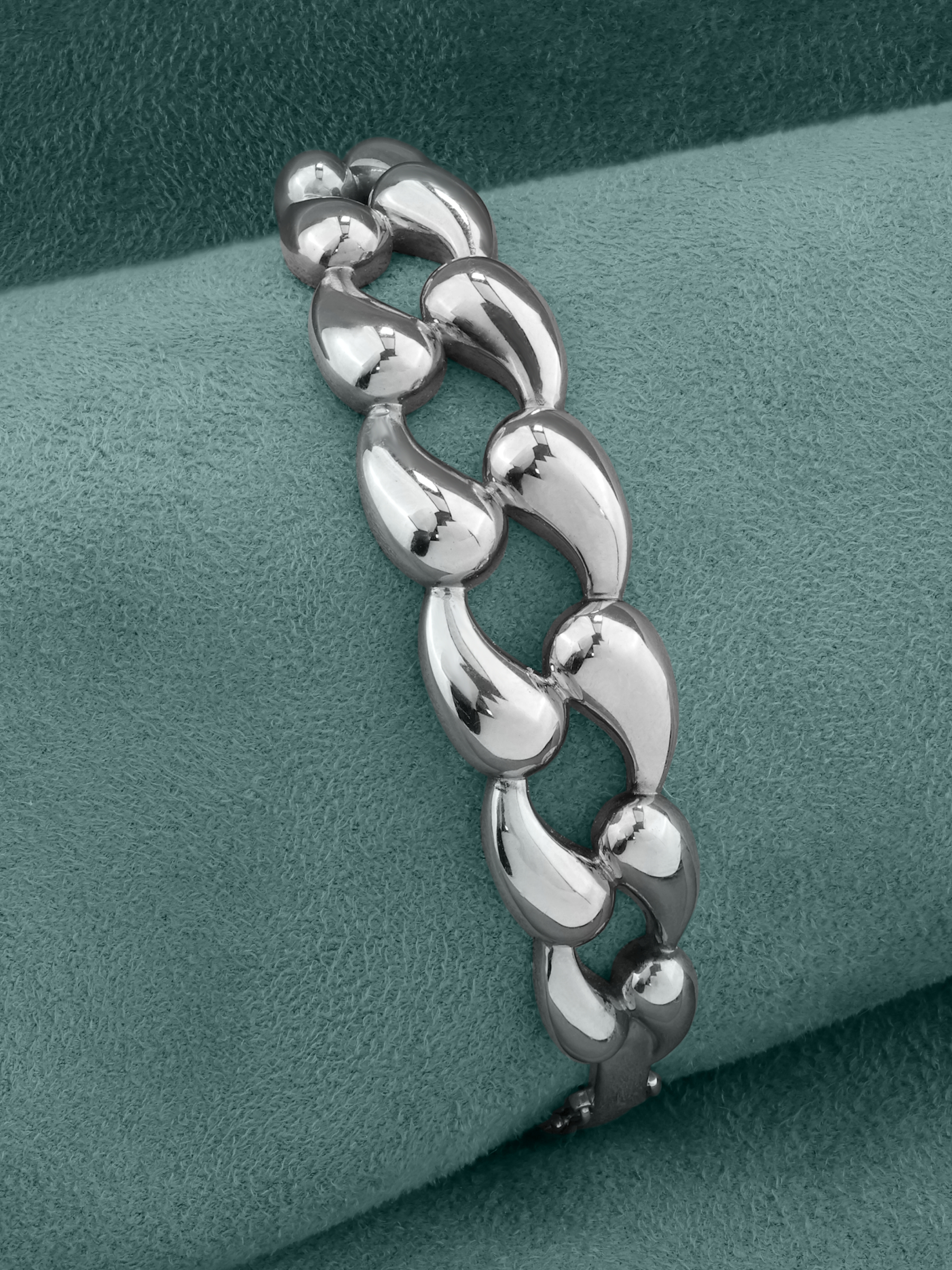 Элегантный и лаконичный браслет из белого золота 585 пробы — это воплощение сдержанной роскоши и безупречного вкуса. Модель выполнена в узнаваемом итальянском стиле, где внимание к деталям и плавность линий играют ключевую роль. Массивные, гладкие звенья создают динамичный объем, приковывая взгляд своим благородным блеском и игрой света на отполированной поверхности металла.