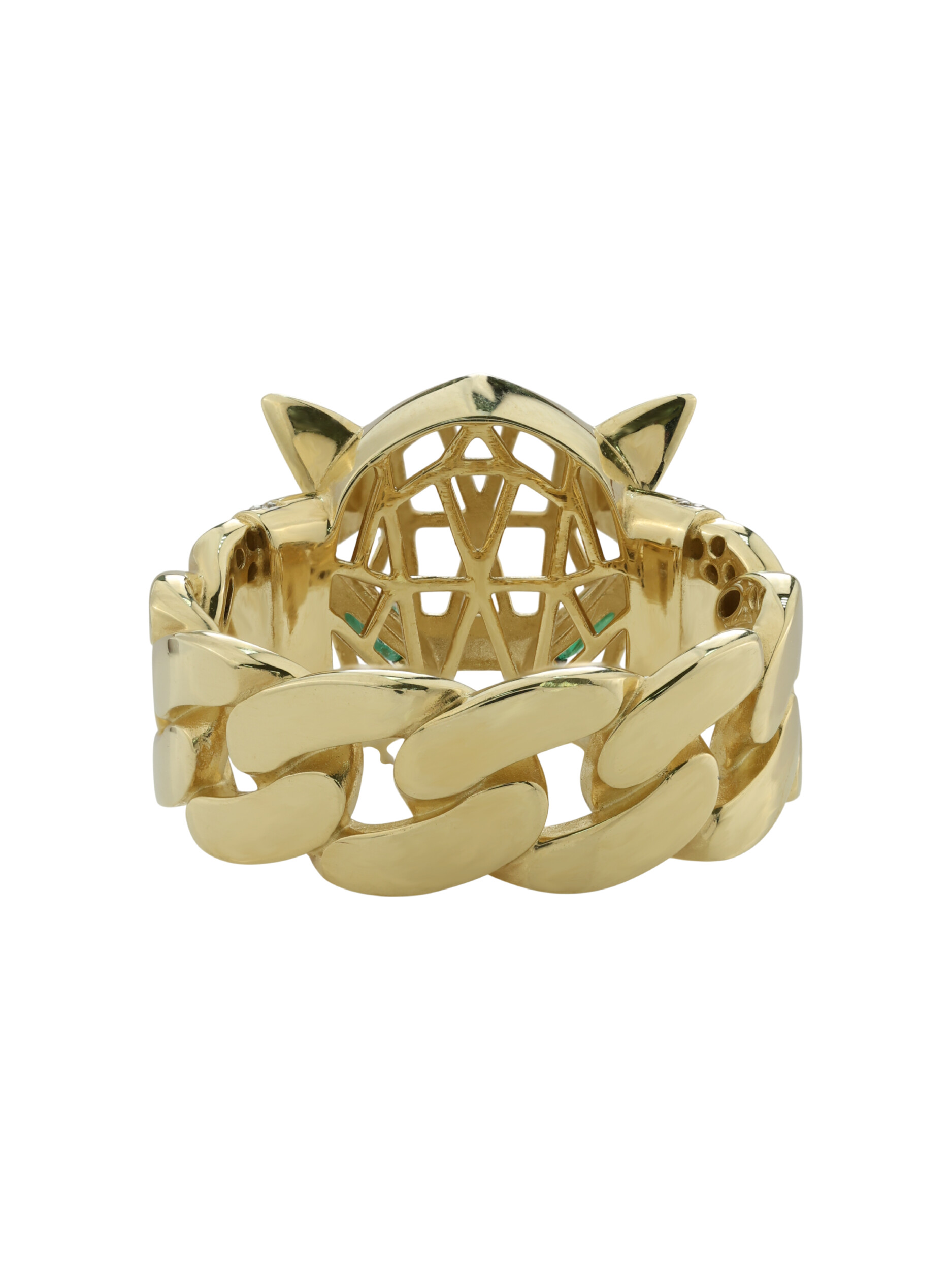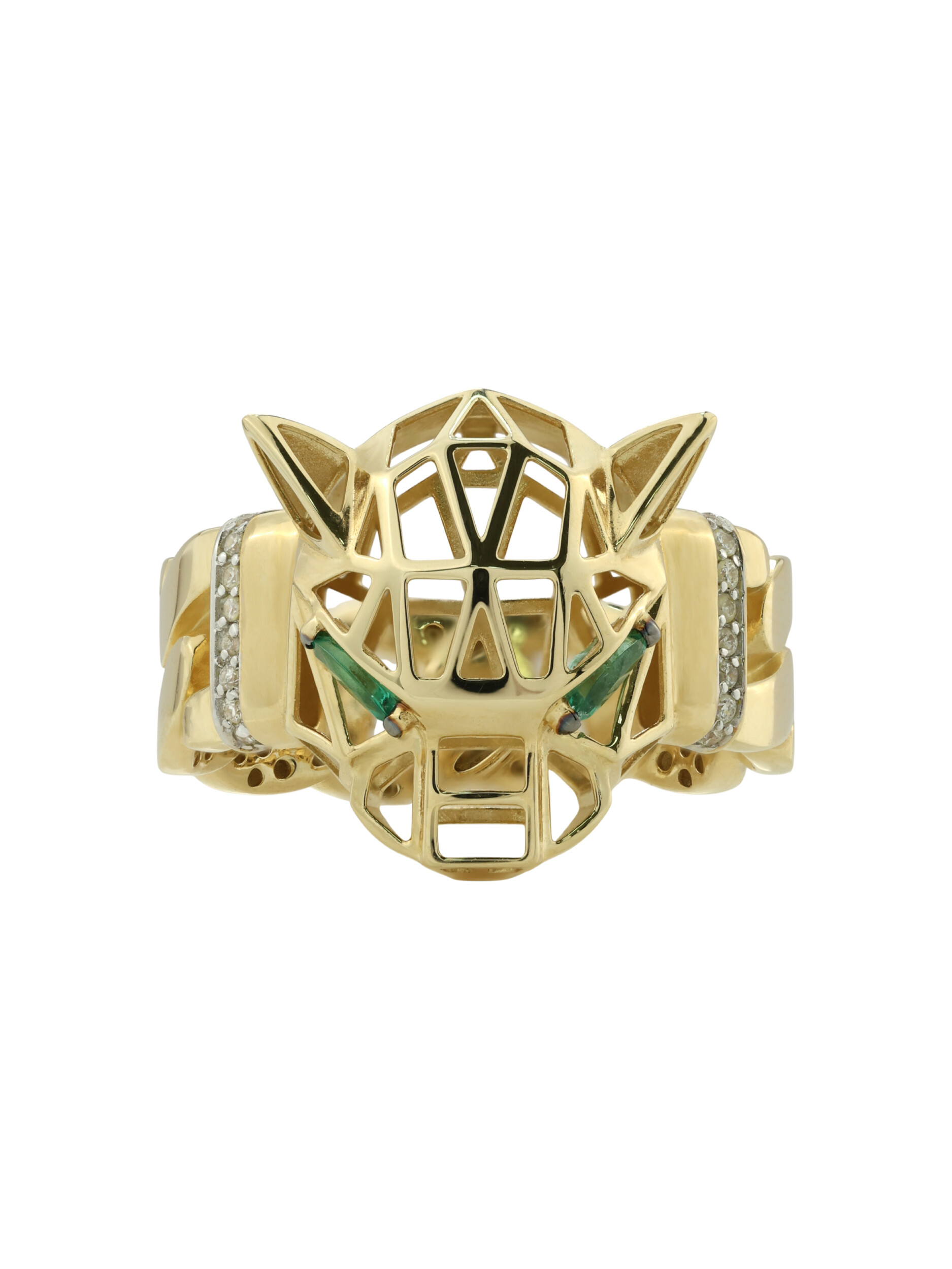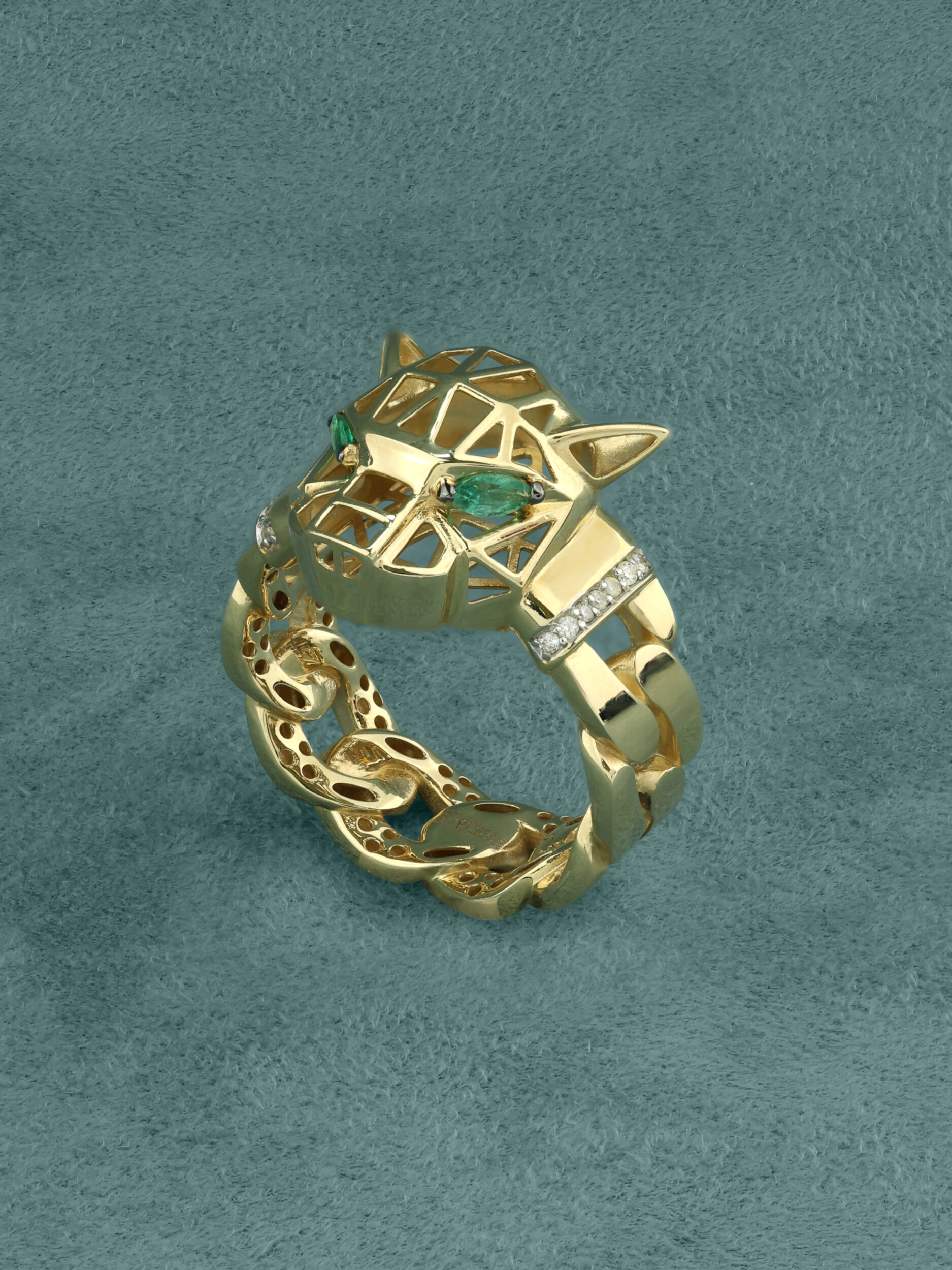 Центральный элемент композиции — пронзительный взгляд дикого зверя, который формируют изумруды глубокого зелёного цвета в огранке маркиз. В дополнение к ним в отделке использованы 18 вставок из сверкающих бриллиантов круглой огранки, которые добавляют изделию благородного блеска. Тонкое сочетание лимонного золота и классической палитры камней делает этот аксессуар поистине роскошным.