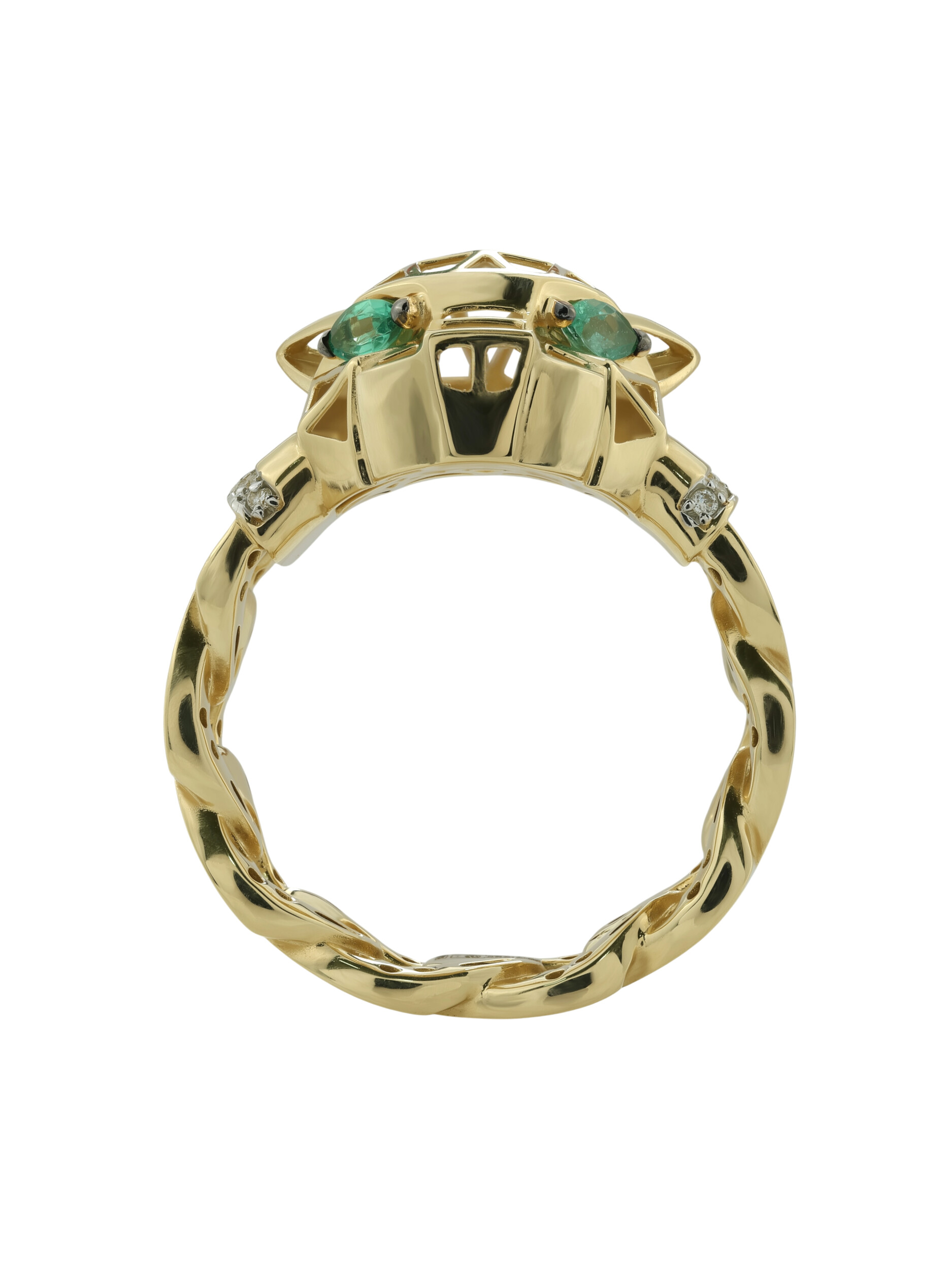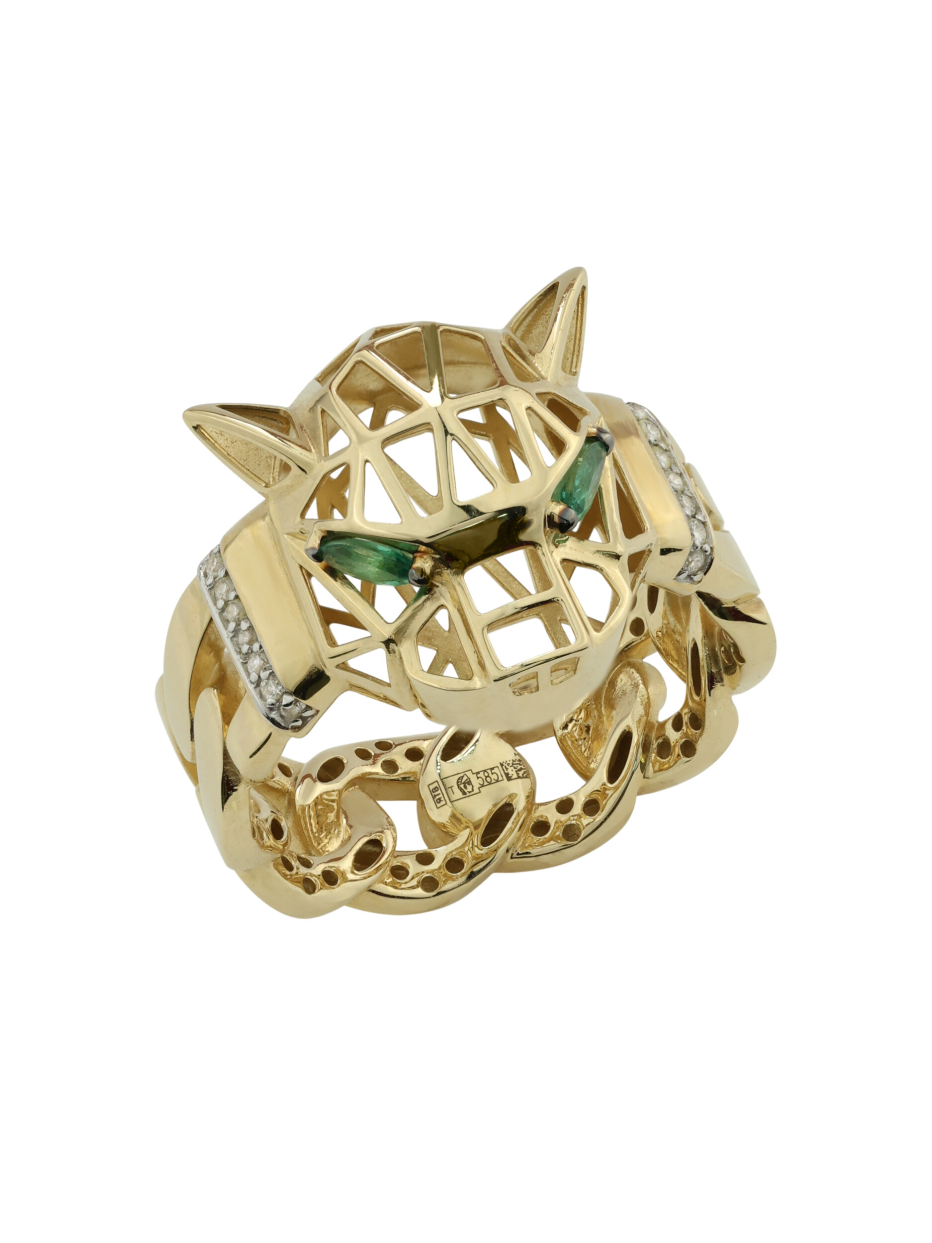 Кольцо с дизайном пантеры или пумы выполнено с высокой детализацией. Широкая шинка изделия стилизована под массивную цепь, что придает украшению современный и дерзкий характер. Кольцо из лимонного золота с бриллиантами и изумрудом представлено в размерах 16.5, 17, 17.5, 18, 18.5. Данная модель также может стать частью комплекта, дополнив ваш ювелирный гардероб. Это украшение создано для тех, кто ценит неординарные решения и высокое качество исполнения.