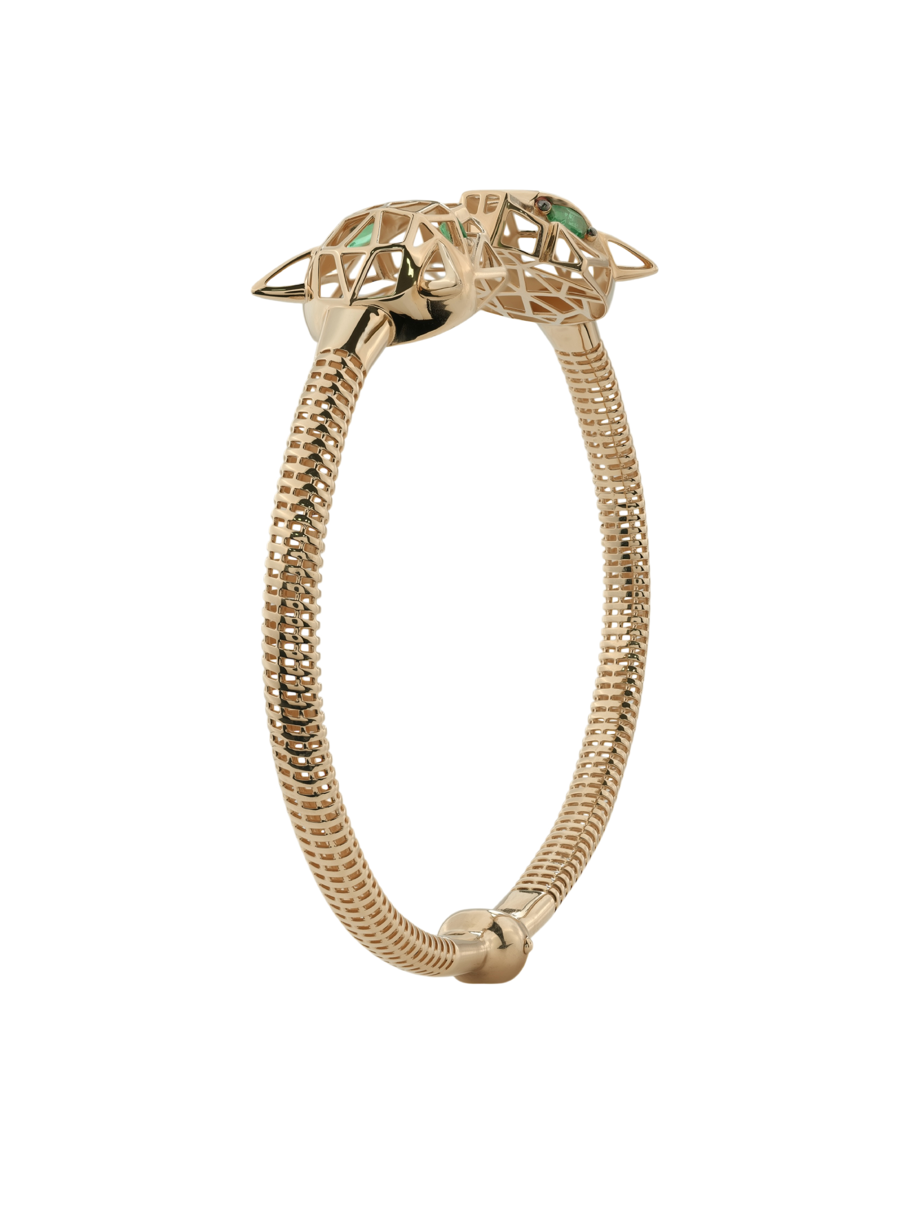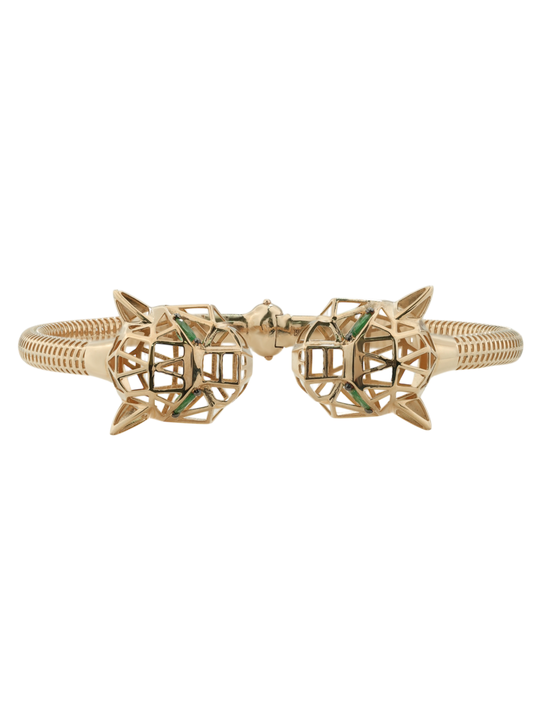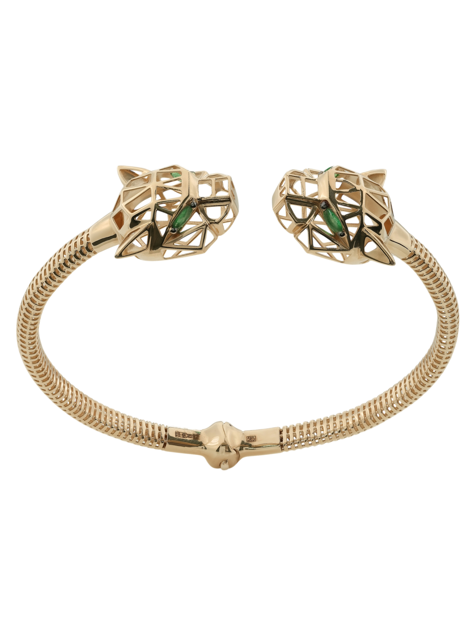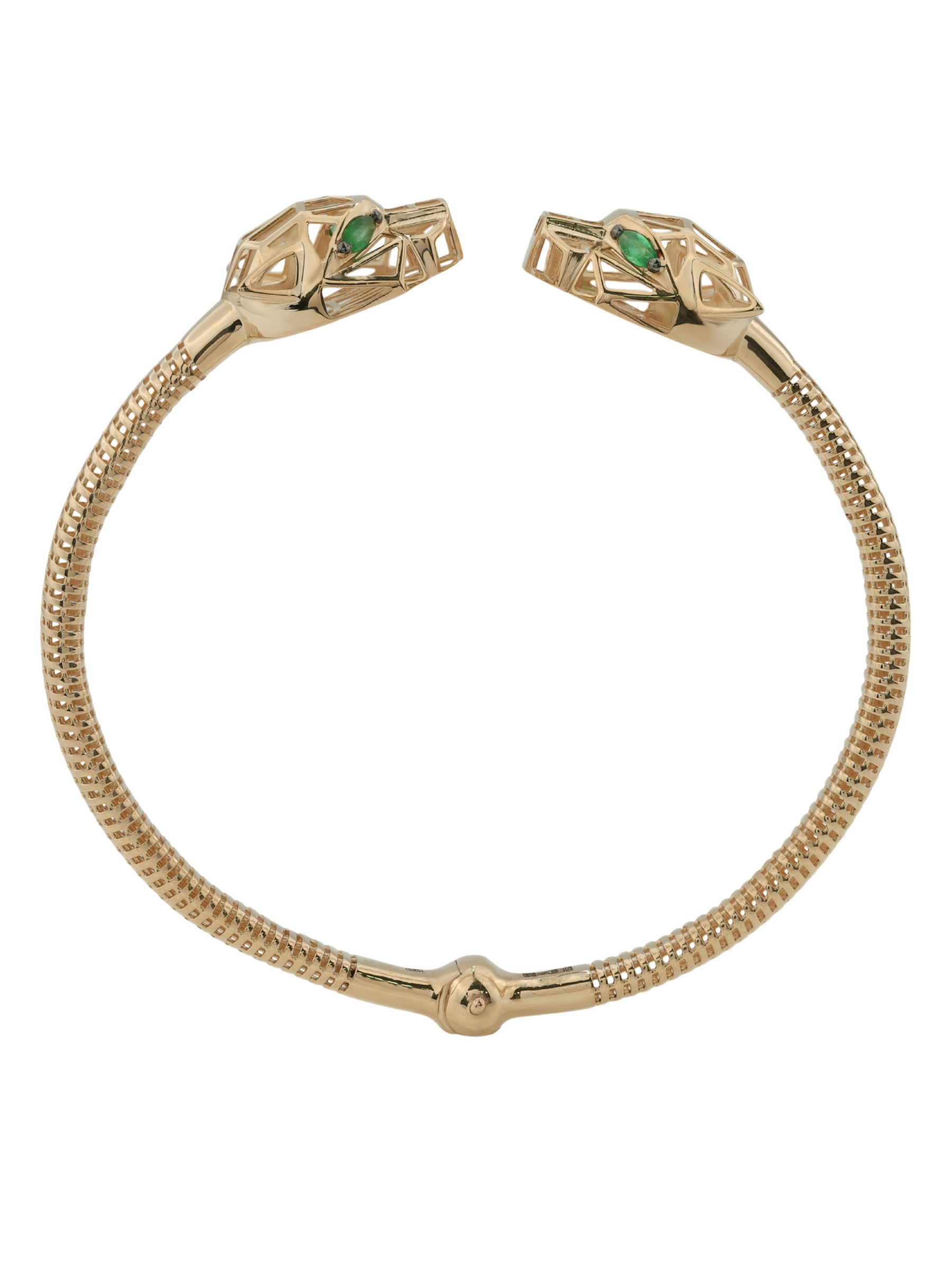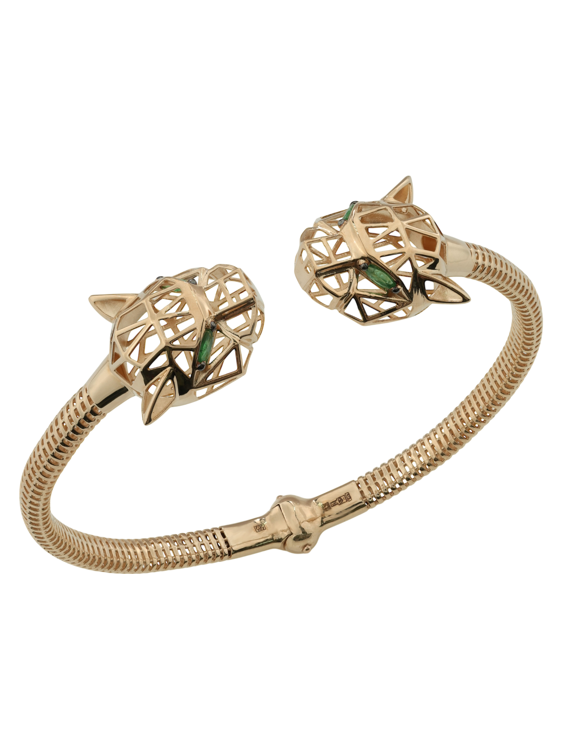 Особую выразительность украшению придают 12 вставок из натурального изумруда. Яркий зеленый цвет камней в огранке формы маркиз подчеркивает глубину и благородство красного металла. Браслет обладает универсальным характером и подходит как для женщин, так и для мужчин, которые ценят уникальные аксессуары. Высокое качество исполнения и продуманная конструкция делают это изделие прекрасным выбором для завершения вечернего образа или создания запоминающегося повседневного стиля.