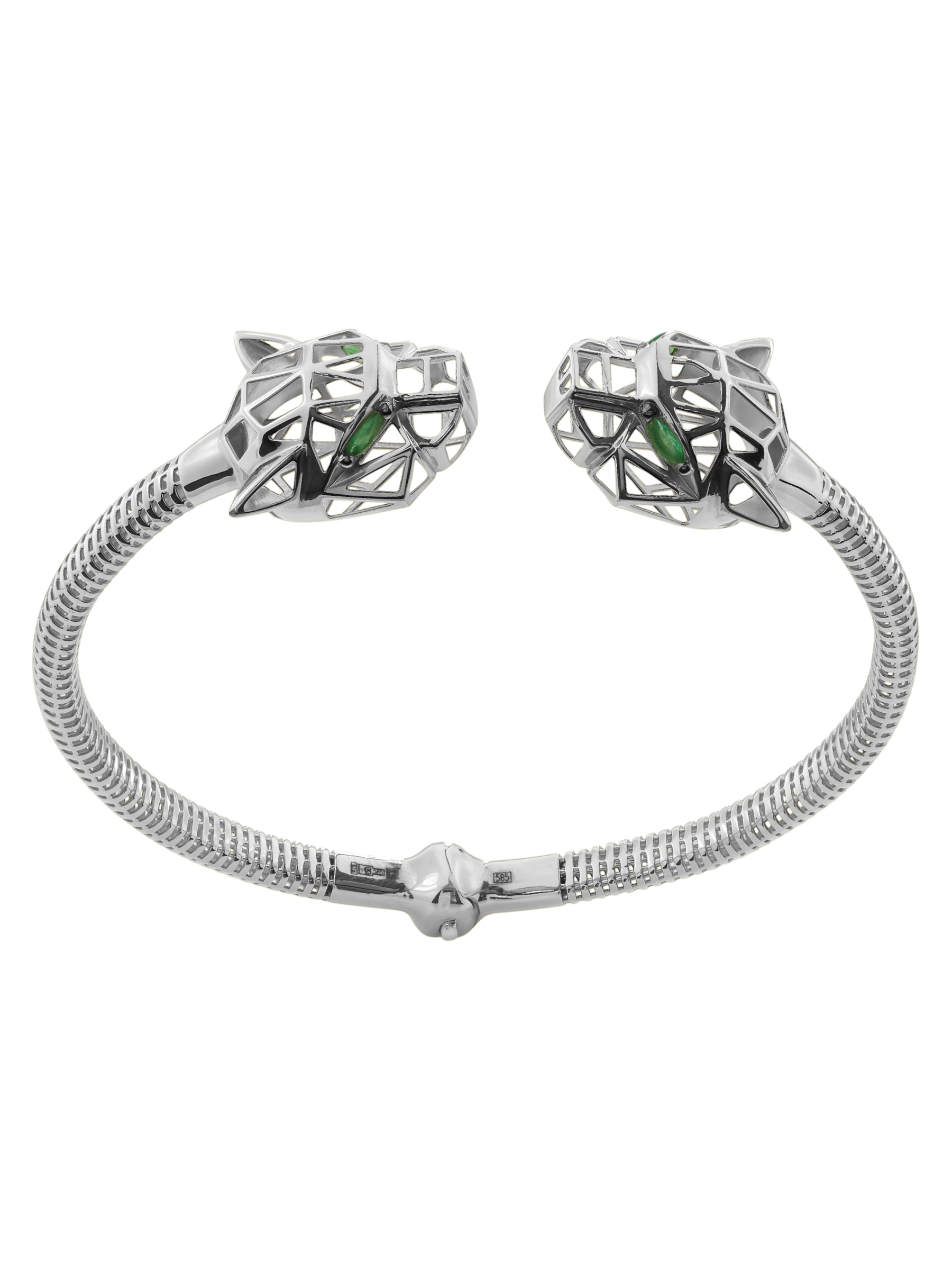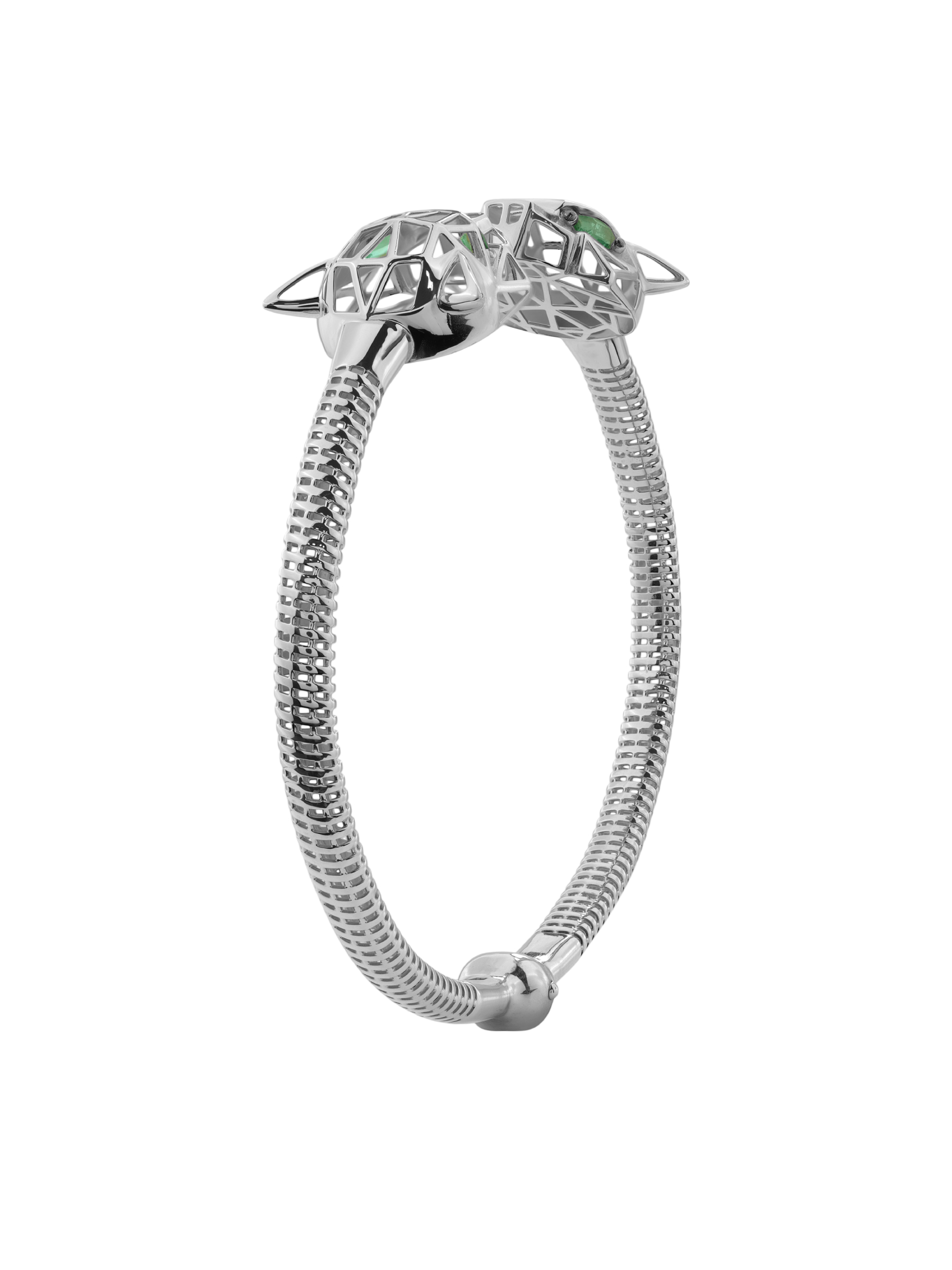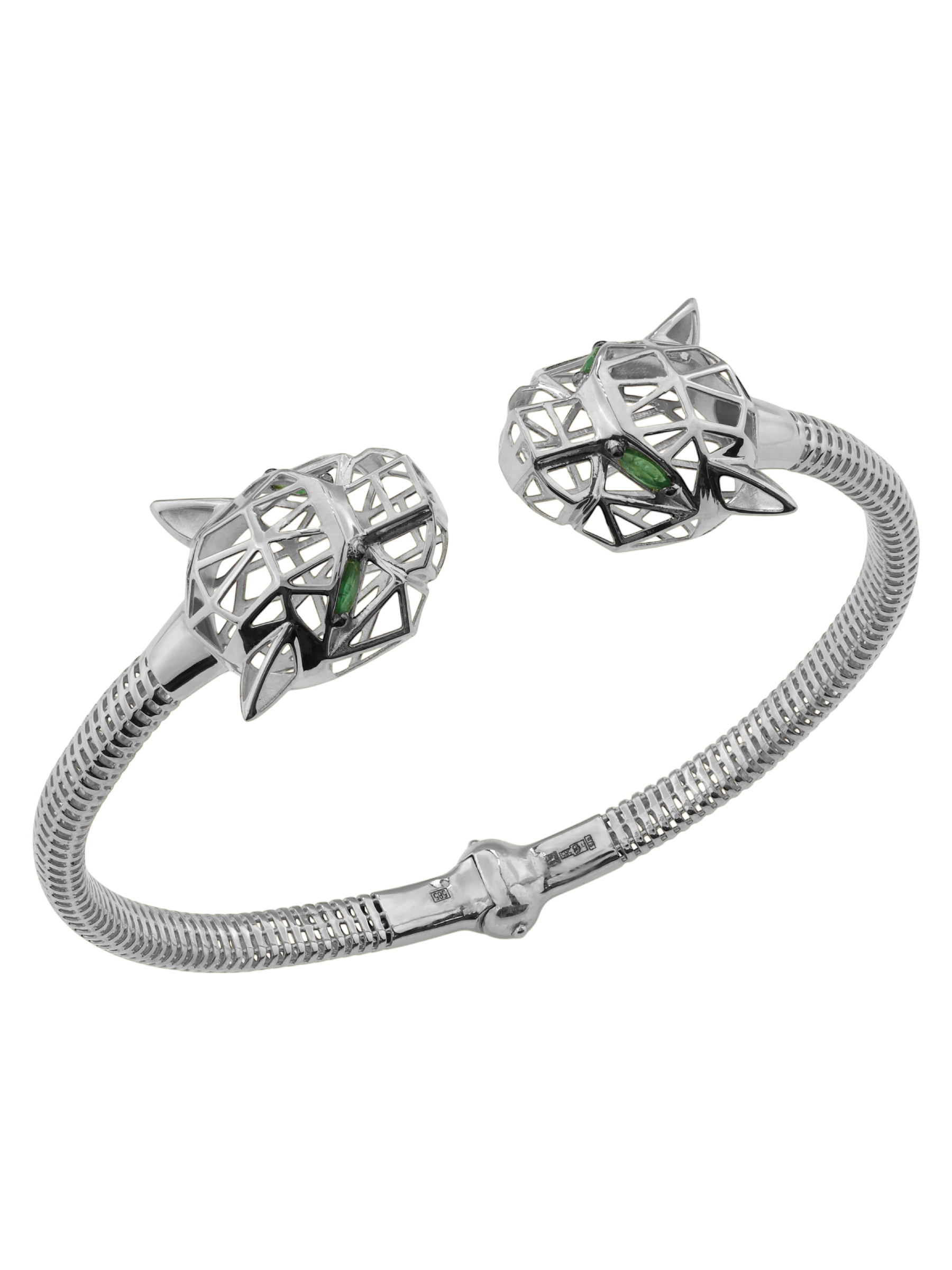 Центральным акцентом ювелирного изделия выступают 12 вставок из изумруда насыщенного зелёного цвета. Драгоценные камни огранки маркиз завораживающе сверкают, подчеркивая хищный нрав дизайна. Качественная обработка металла и продуманная до мелочей форма создают ощущение безупречного стиля. Браслет комфортно сидит на запястье и легко вписывается в самые разнообразные образы — от повседневных до вечерних, а также прекрасно сочетается с другими украшениями из комплектов данной серии.