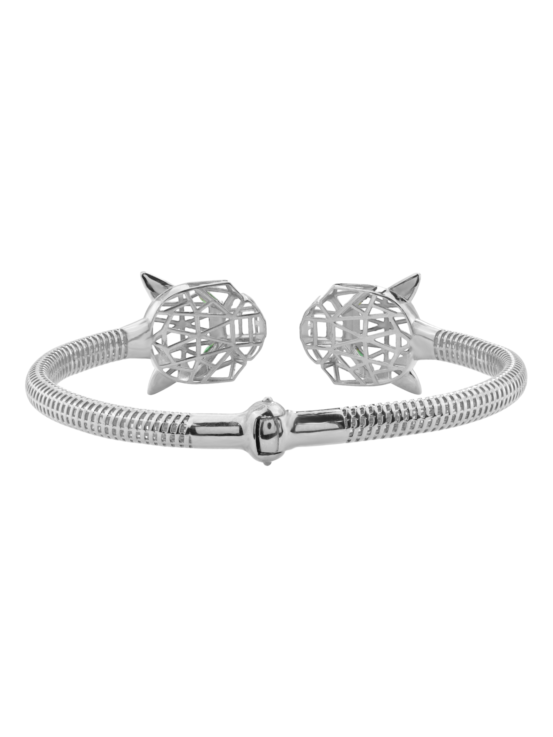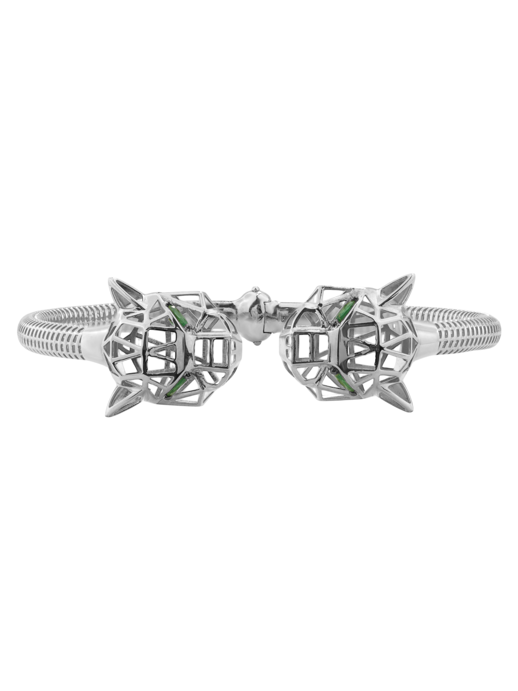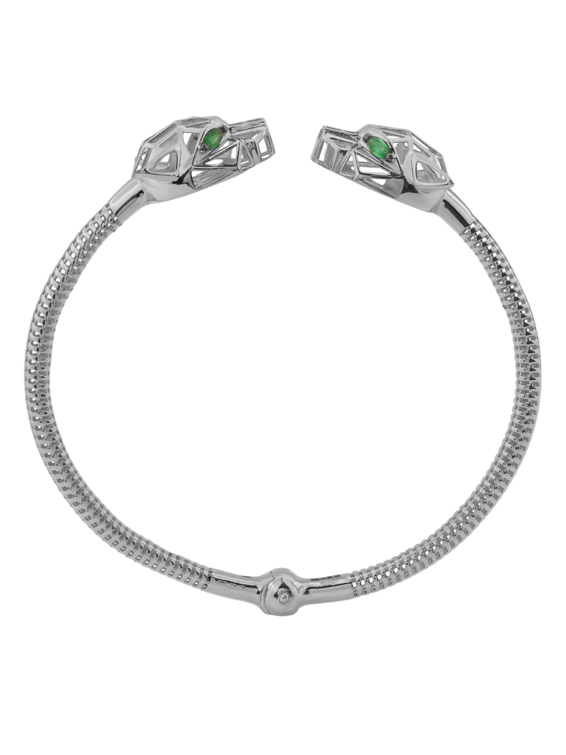 Центральным акцентом ювелирного изделия выступают 12 вставок из изумруда насыщенного зелёного цвета. Драгоценные камни огранки маркиз завораживающе сверкают, подчеркивая хищный нрав дизайна. Качественная обработка металла и продуманная до мелочей форма создают ощущение безупречного стиля. Браслет комфортно сидит на запястье и легко вписывается в самые разнообразные образы — от повседневных до вечерних, а также прекрасно сочетается с другими украшениями из комплектов данной серии.