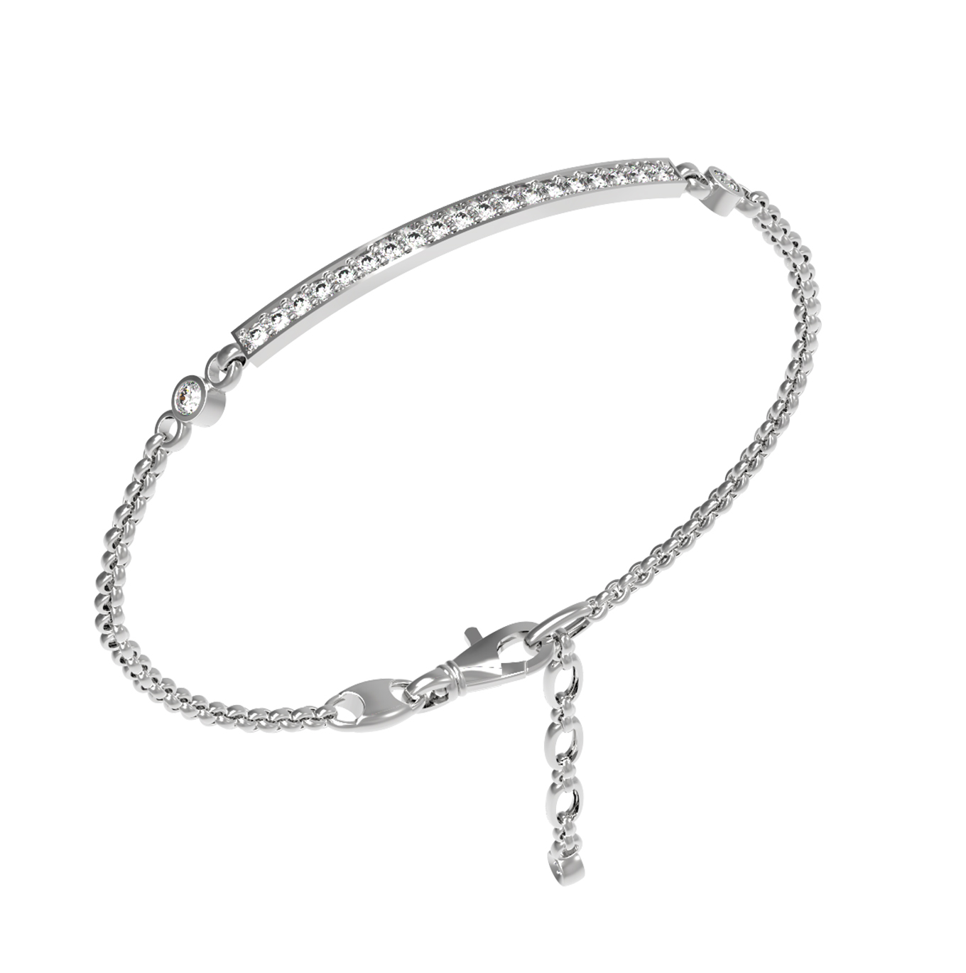 Центральным элементом композиции является декоративная планка, инкрустированная сияющими камнями, дополненная отдельными вставками. Всего в изделии использованы 23 бриллианта круглой формы с белым цветом вставок, которые при каждом движении руки создают игру света. Тонкая цепочка браслета гармонично поддерживает общую эстетику, делая его комфортным для повседневного ношения или дополнения вечернего образа.