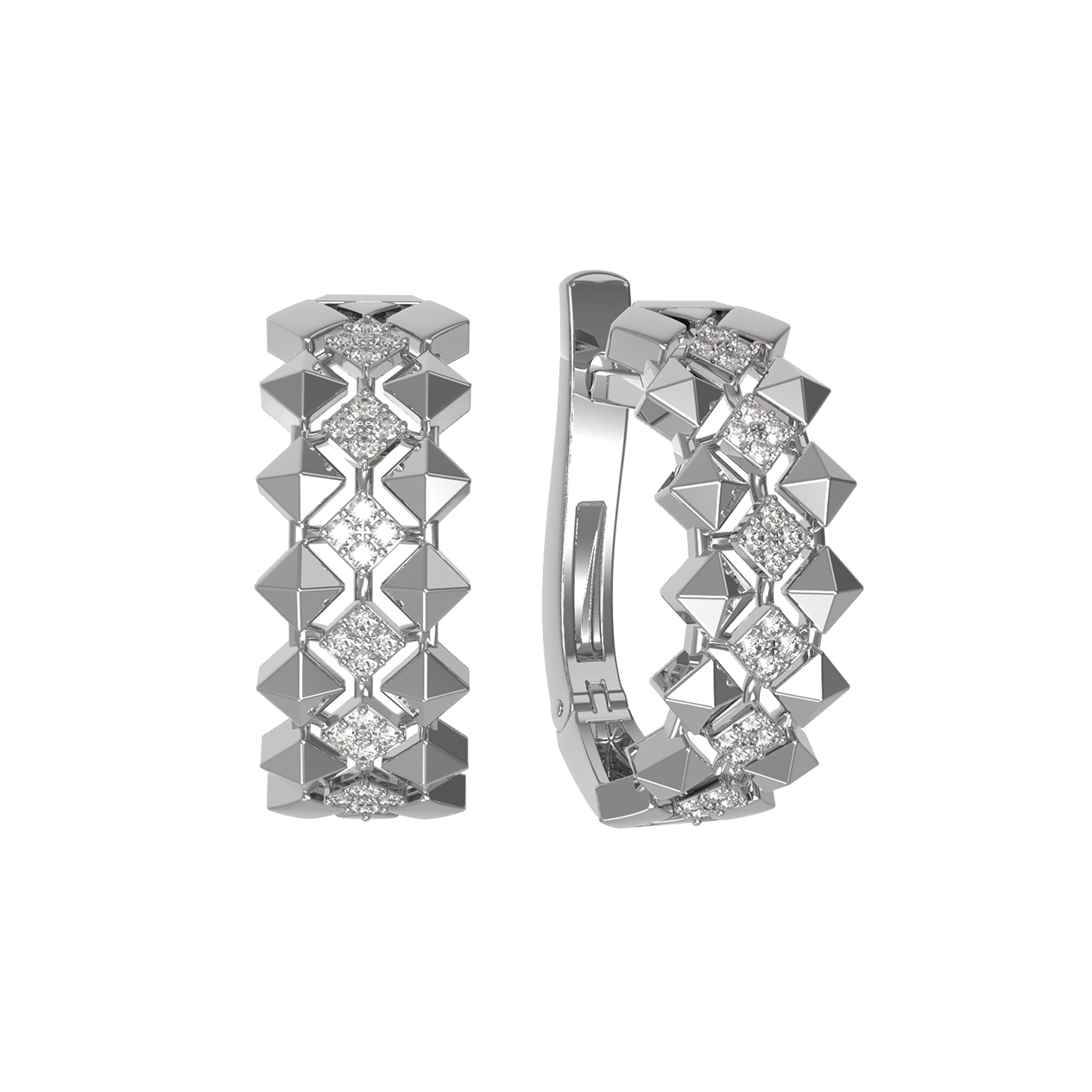 Эффектные серьги из белого золота 585 пробы — яркий образец ювелирного мастерства из коллекции De Luxe Бриллианты — Pyramids. Геометрическая эстетика пирамидальных элементов создает динамичный и современный образ, притягивающий взгляды своей строгостью и блеском. Контрастное сочетание четких граней драгоценного металла и мерцания камней делает это украшение универсальным аксессуаром, подходящим как для женщин, так и для мужчин.