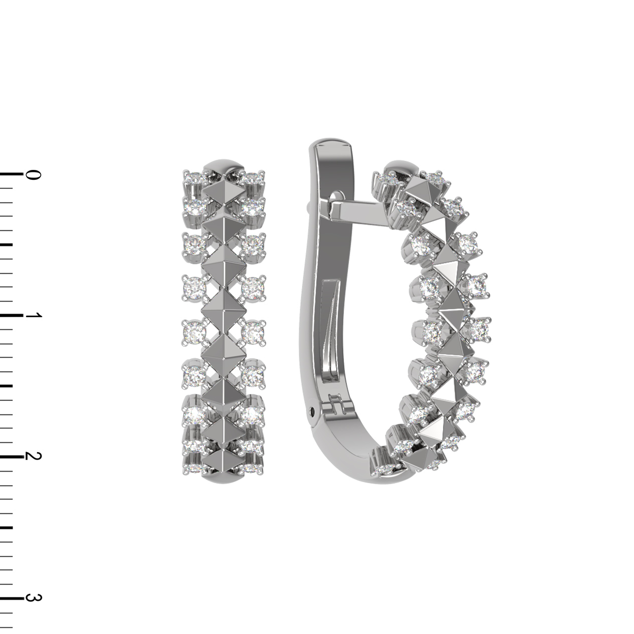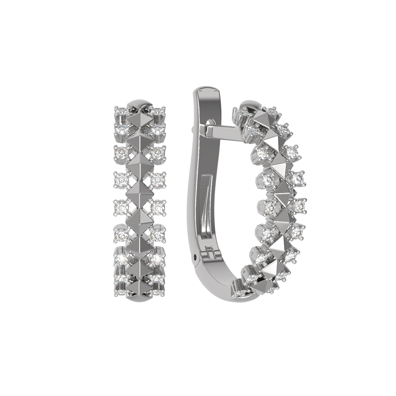 Лицевая сторона серег инкрустирована 36 бриллиантами круглой формы с классическим белым цветом вставок. Огранка камней позволяет максимально раскрыть их игру при попадании света. Геометрический орнамент, напоминающий пирамидальные структуры, придает украшению современный вид и динамику. Белое золото холодного оттенка служит идеальной оправой для сверкающих бриллиантов, усиливая их чистоту и сияние.