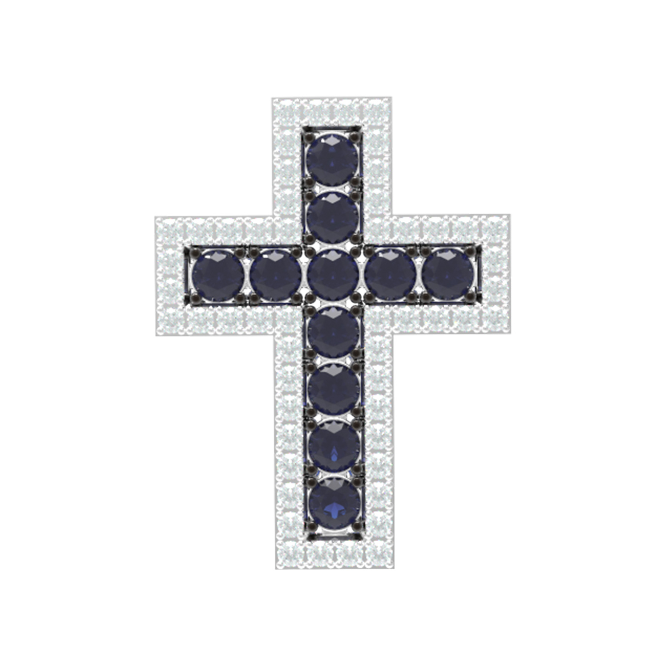 Композиция украшена 63 вставками круглой формы: благородными сапфирами синего цвета и сверкающими бриллиантами белого цвета. Контрастное сочетание холодного блеска металла и насыщенного оттенка сапфиров создает выразительный визуальный акцент, привлекая внимание к деталям. Тщательно продуманный дизайн делает этот крест универсальным аксессуаром, который подходит как для женщин, так и для мужчин. Благодаря своему лаконичному исполнению, изделие гармонично сочетается с другими украшениями и может стать частью изысканного ювелирного комплекта.