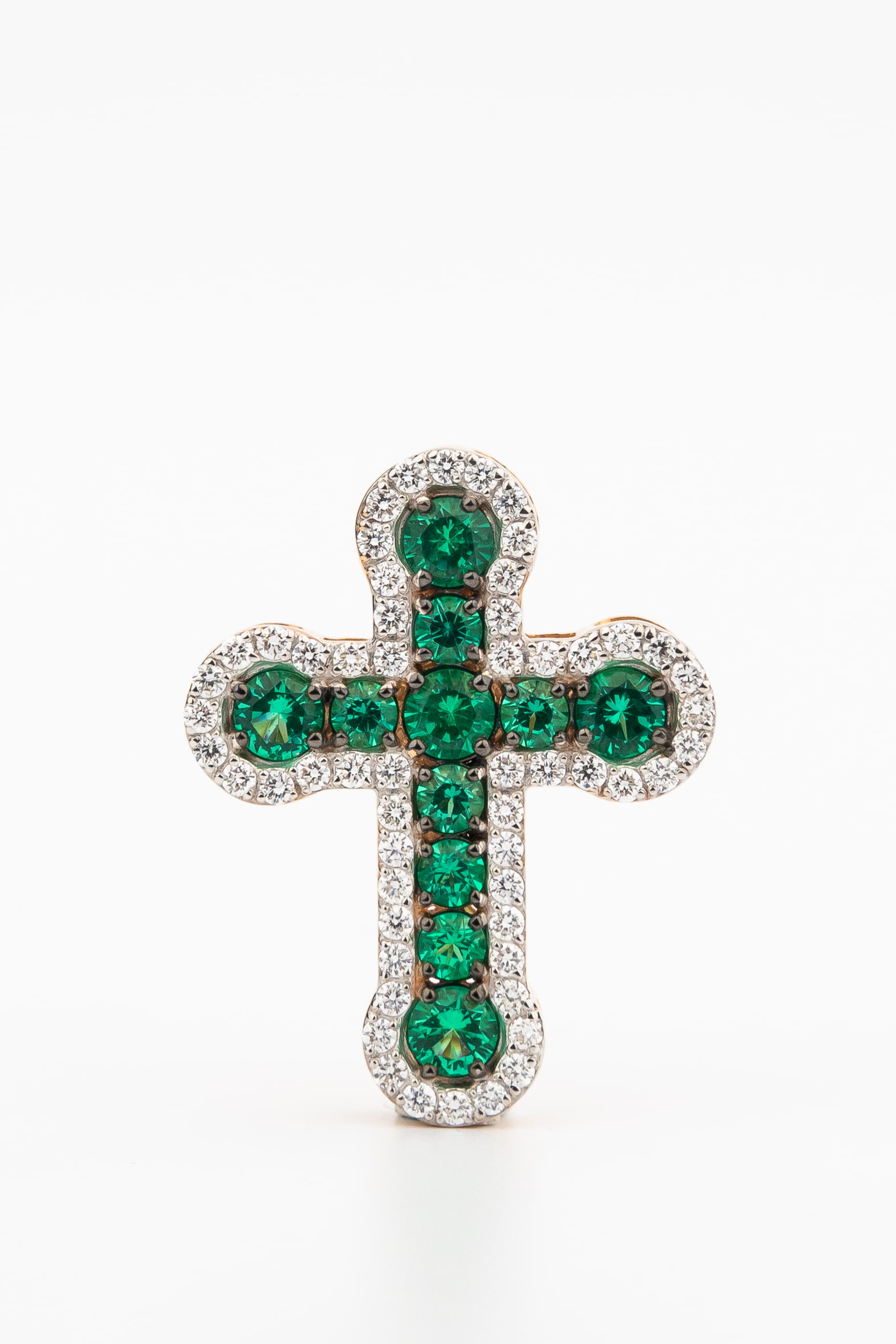 Центральным элементом композиции является искусное сочетание драгоценных вставок: глубокий зеленый цвет изумрудов в обрамлении сияющих белых бриллиантов. Всего в украшении использовано 67 камней круглой формы, которые великолепно переливаются при любом освещении, приковывая восторженные взгляды. Каждая деталь продумана до мелочей, чтобы подчеркнуть значимость изделия и его премиальный статус.