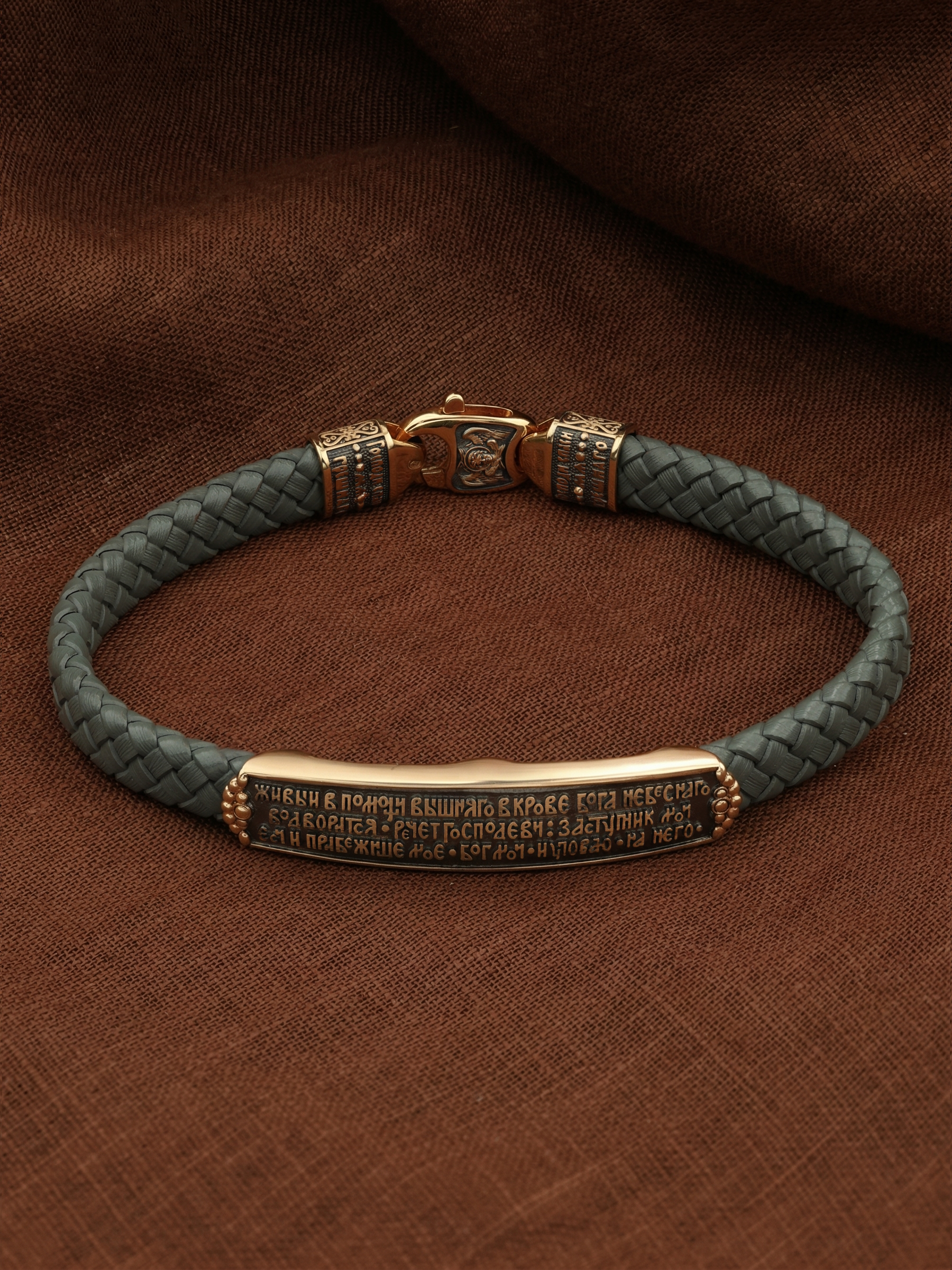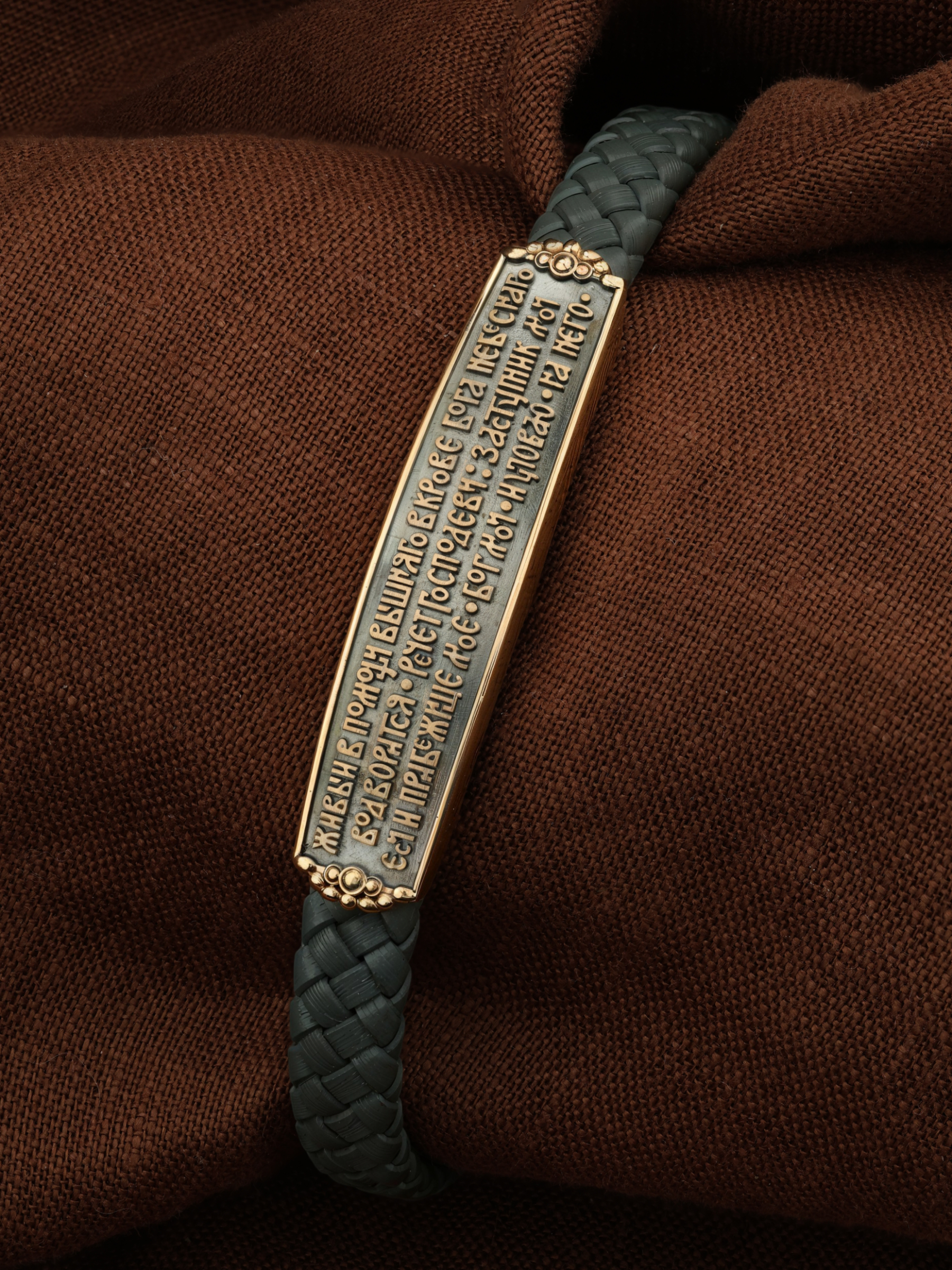 На основном звене браслета написана молитва: «Живый в помощи Вышняго, в крове Бога Небеснаго водворится. Речет Господеви: Заступник мой еси и Прибежище мое, Бог мой, и уповаю на Него.»
