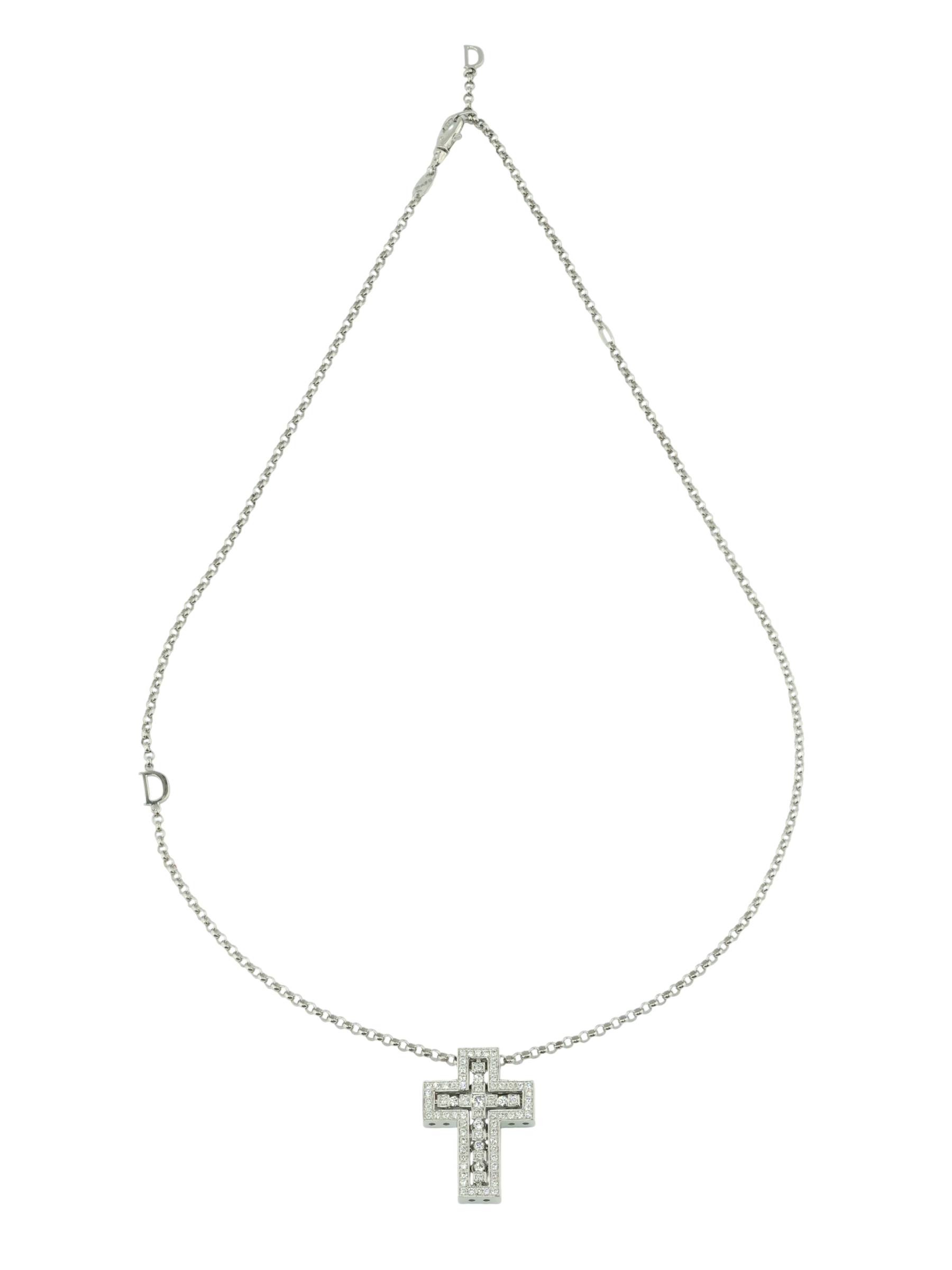 Геометрически выверенный дизайн подчеркивает холодный блеск белого золота, который идеально сочетается с роскошным сиянием камней. В оформлении изделия использованы 75 бриллиантов круглой формы с белым цветом вставок. Тщательно отобранные камни образуют завораживающий узор, создавая выразительную игру света при каждом движении. Лаконичная, но эффектная форма креста делает его универсальным украшением, способным стать центральным акцентом вашего стиля.
