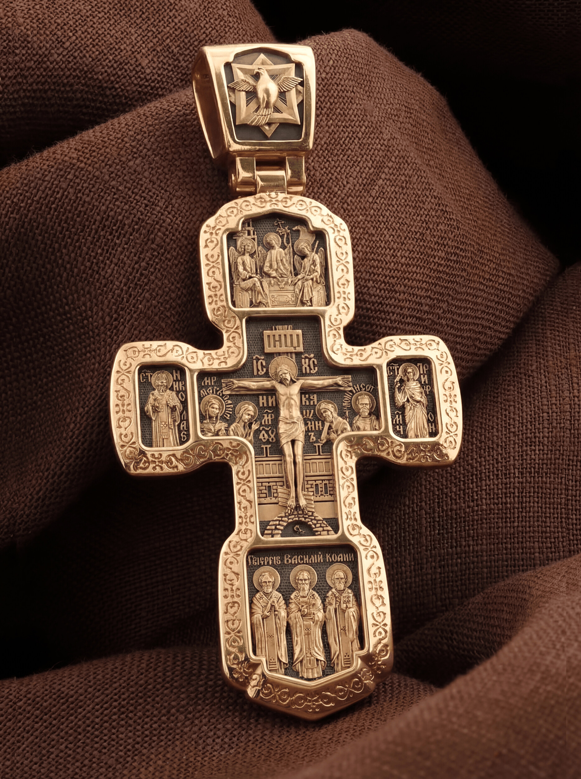 Внизу изображены три святителя, творцы Божественной Литургии. В центре — святой Василий Великий, справа — святой Иоанн Златоуст, а слева — святой Григорий Богослов. В центральной части оборотной стороны Креста изображена икона Божией Матери «Всецарица» или «Пантанасса». Чудотворная икона была написана в XVII веке и находится на Святой Горе Афон. Икона совершила множество чудесных исцелений. Пречистая Богородица наставляет на праведный путь, помогает укрепить веру, найти утешение. По бокам изображены прп. Сергий Радонежский и святитель Спиридон Триумфунский. Сверху и снизу помещены изображения Ангела-Хранителя. На кулонном кольце помещено изображение Спаса Нерукотворного. Ему придается победное и защитное значение.