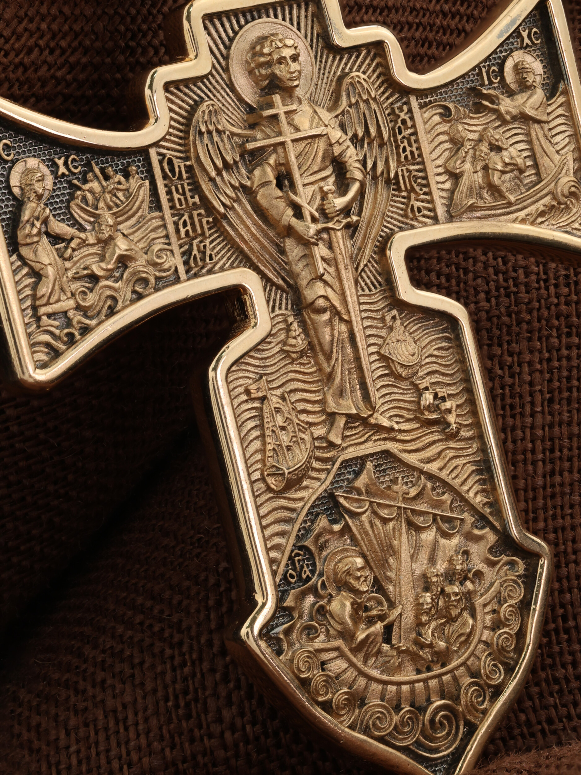Оборот Морского креста весь посвящен охранению и спасению путешествующих по морю. В центре — могучая фигура Ангела Хранителя с крестом и мечом. Он стоит на волнах. Это образ Ангела Хранителя, стража душ человеческих как на море, так и в буре житейских страстей и искушений.