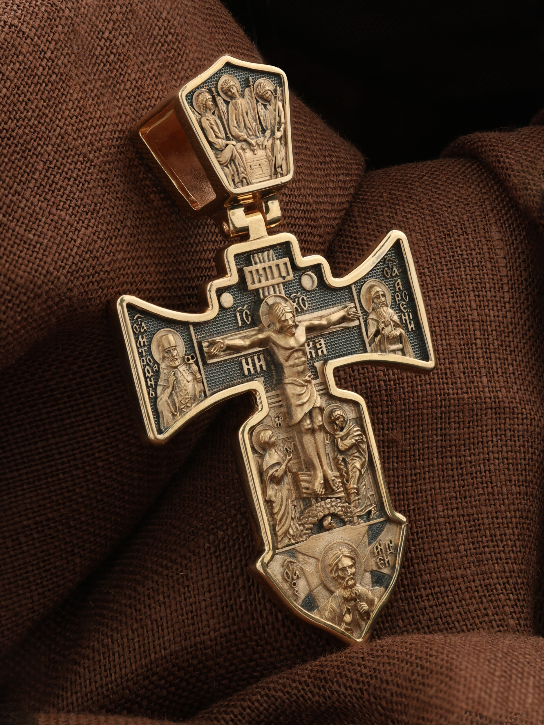 На лицевой стороне креста изображено Распятие Господа Иисуса Христа.