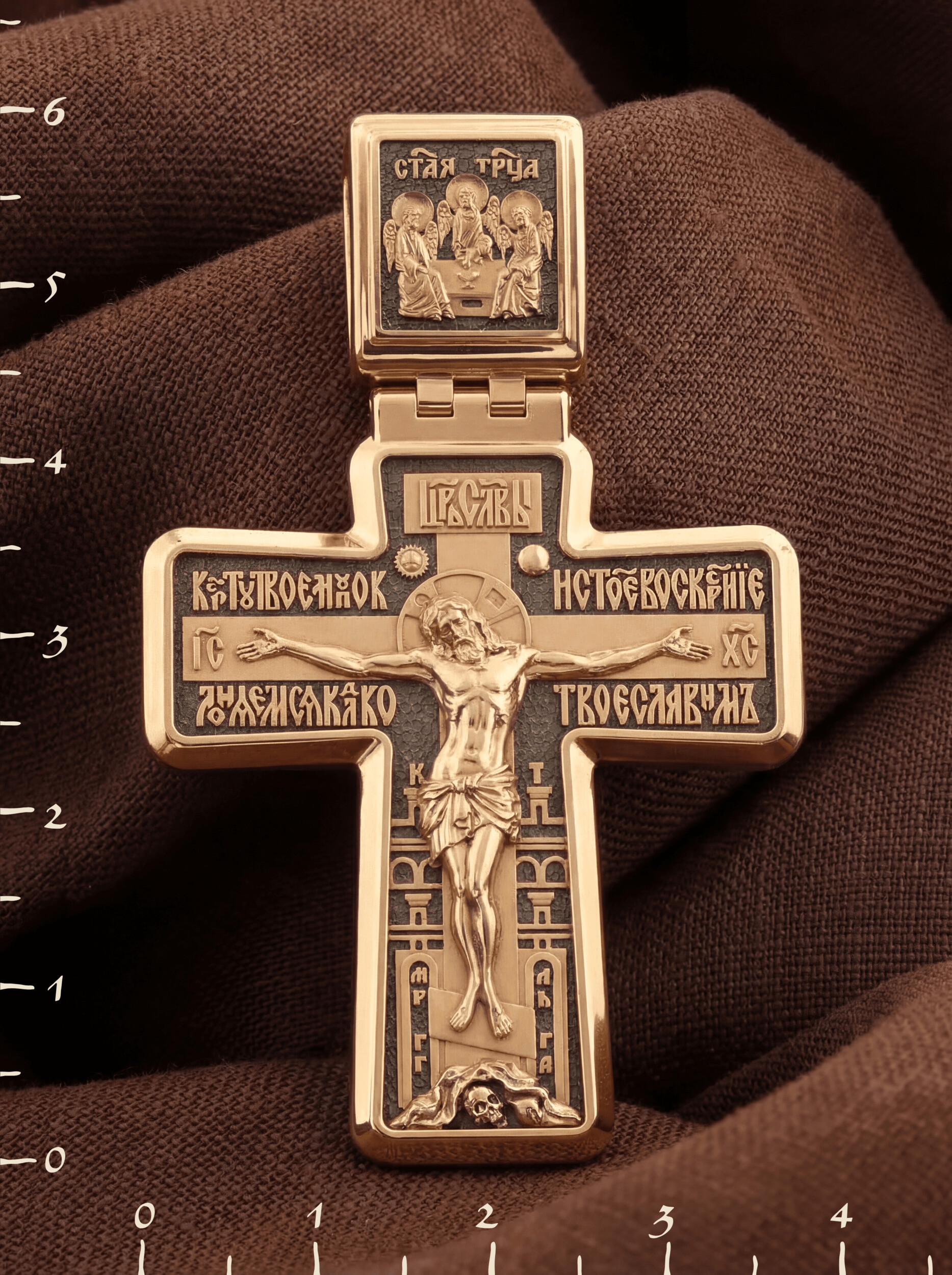 На лицевой стороне креста изображено Распятие Иисуса Христа. Позади Его изображена иерусалимская стена, знак того, что Господь был распят вне стен города. Но вместе с тем стена знаменует и Небесный Иерусалим, путь в который открылся для человечества через Голгофу: «МЛРБ», «Место Лобное Рай Бысть» — написано у ее основания. Рядом с Его образом помещены слова «Царь Славы». Эти слова характеризуют Господа, как Великого Архиерея, победителя смерти. Верхняя перекладина символизирует титло — табличку, на которой, согласно Евангелию, было начертано: «Иисус Назорей Царь Иудейский» (IНЦI). Также Распятие сопровождается надписями, олицетворяющими Христа. Это святое имя Христа «IC» (Иисус) «ХС» (Христос), а так же написан тропарь Животворящему Кресту: «Кресту Твоему поклоняемся, Владыко, и святое воскресение Твое славим». Распятие стоит на горе камней, символизирующих Голгофу, в основании которой различается череп. Это голова Адама. На кулонном кольце помещено изображение Святой Троицы.