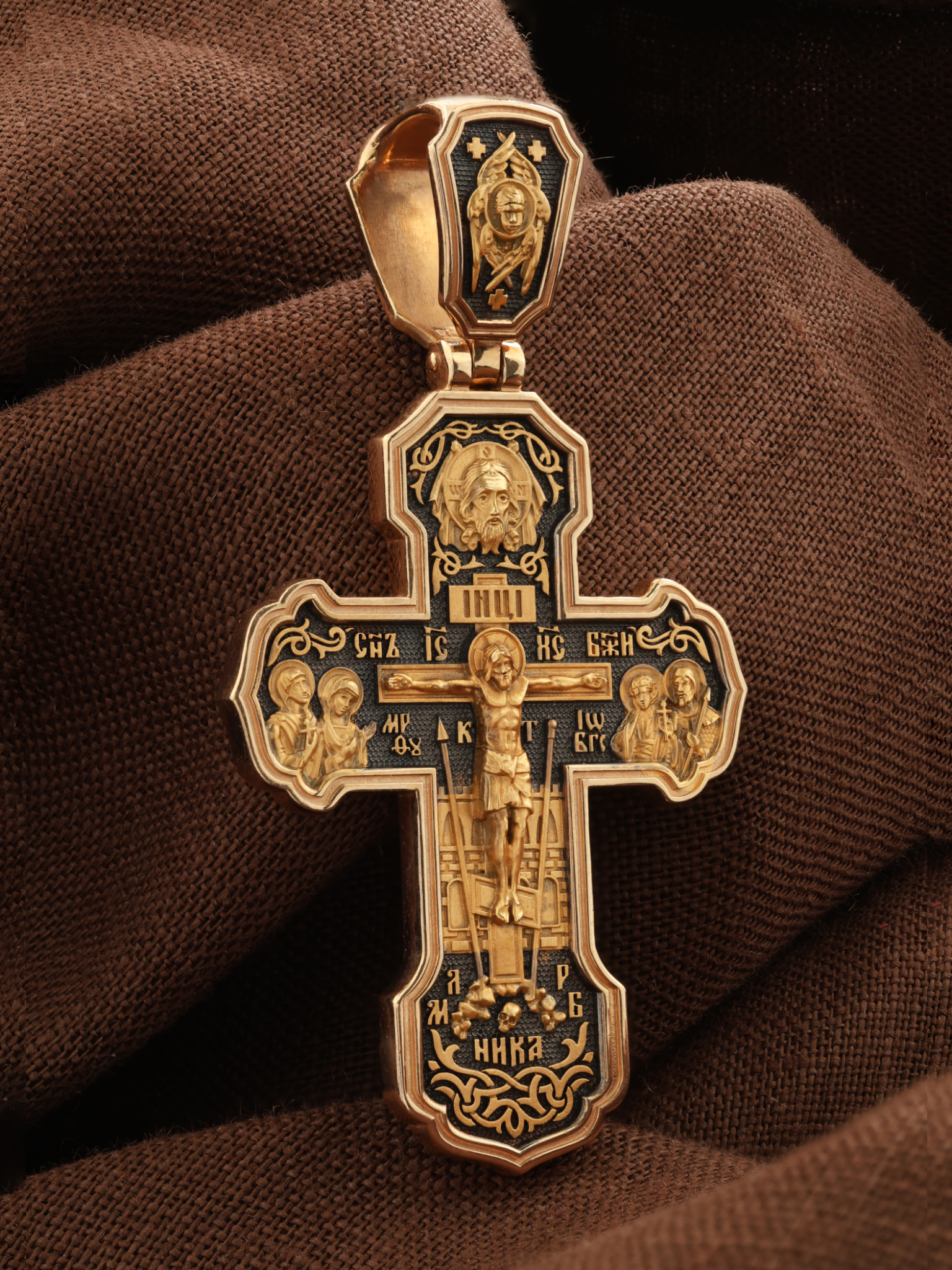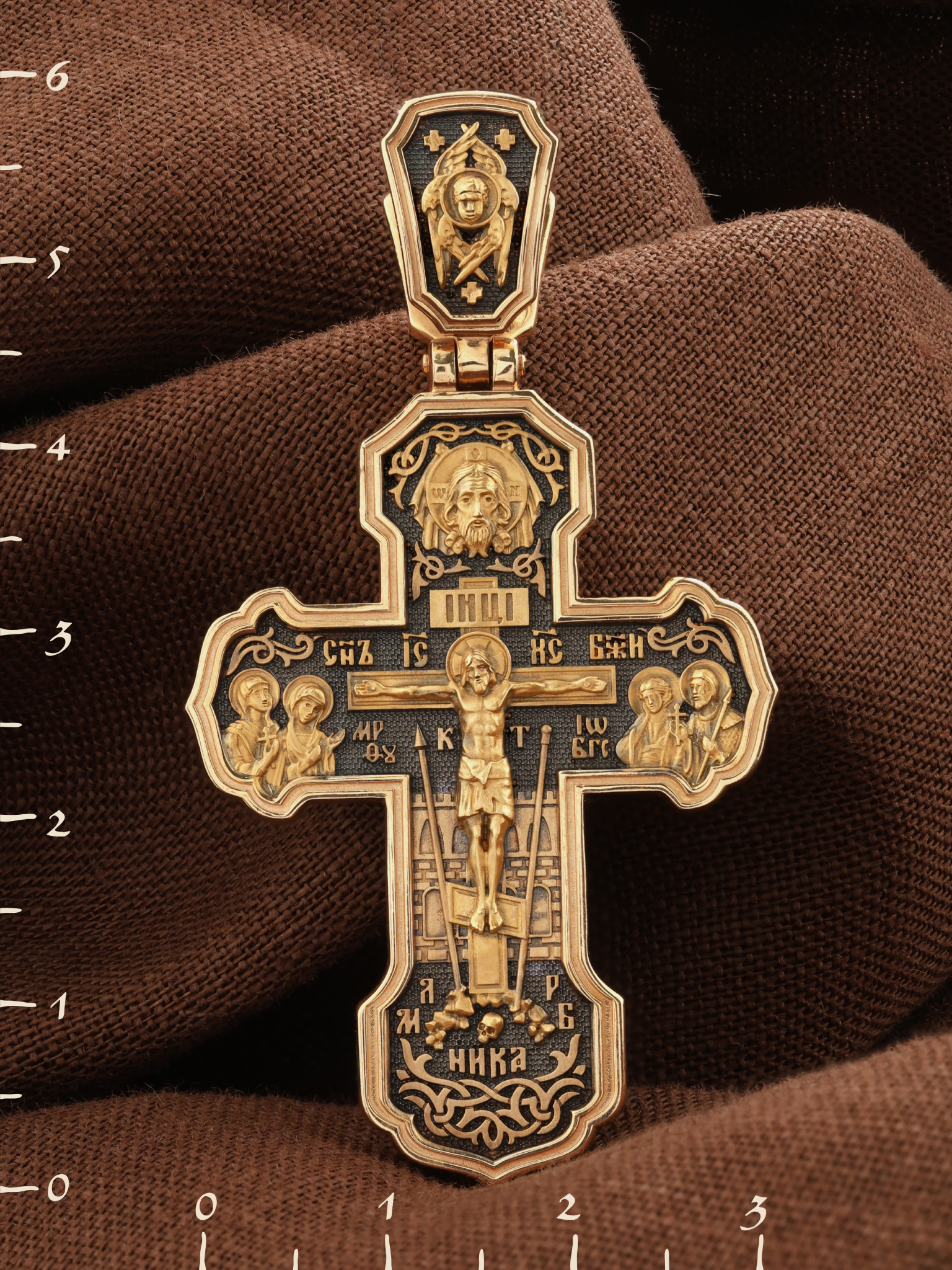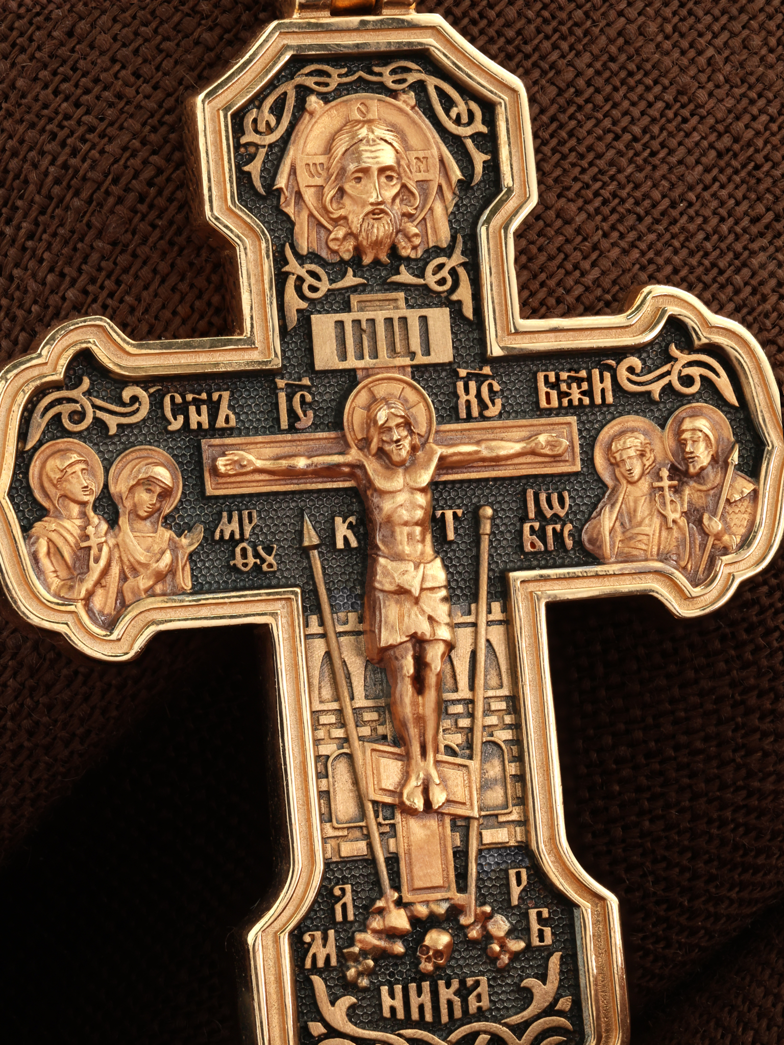 На лицевой стороне креста изображено Распятие Господа и Спасителя нашего Иисуса Христа. Крест- символ спасения и искупления рода человеческого, знамение победы над смертью и адом. Иисус Христос, как искупительная жертва освобождения человечества от власти греха, умер крестной смертью и в третий день воскрес. На верхней табличке, выше головы Иисуса, расположена надпись, составленная Понтием Пилатом — «IНЦI». Она означает «Иисус Назорей, Царь Иудейский». Надпись «IС» « ХС» означает Иисус Христос и помещается на разных сторонах поперечной (большой) перекладины креста. Рядом расположена надпись «Сын Божий». Выше Распятия изображен Нерукотворный образ Господа и Спасителя нашего Иисуса Христа. Слева от Распятия — Пресвятая Богородица и святая мироносица Мария Магдалина с крестом в руке. Справа — апостол и евангелист Иоанн Богослов, один из ближайших учеников Иисуса Христа и сотник Лонгин с крестом в правой руке и копьем — в левой. За крестом высится Иерусалимская стена. Крест стоит на горе камней, символизирующих Голгофу. В ее основании различается череп — это голова Адама. Вдоль креста изображены копие сотника Лонгина и трость с губкой и буквы «К» и «Т». Надпись «МЛРБ» — «место лобное рай бысть» означает, что место лобное стало раем и помещаются в нижней части креста. Рядом — слово «НИКА», что означает «победитель». На православном кресте Христос не умирает, а свободно простирает руки, ладони Иисуса открыты, будто он хочет обнять все человечество, даря им свою любовь и открывая путь к вечной жизни. На кулонном кольце изображен шестикрылый Серафим.