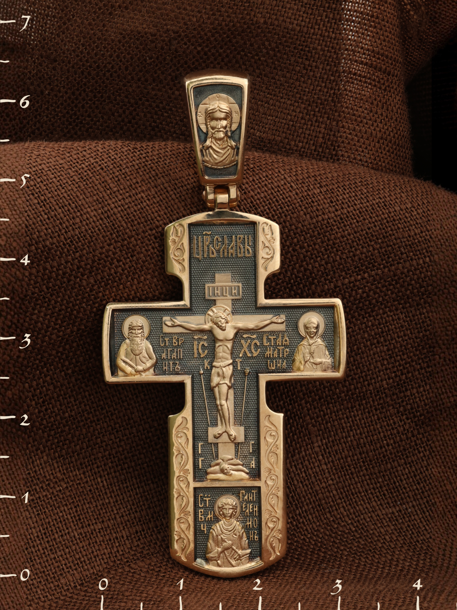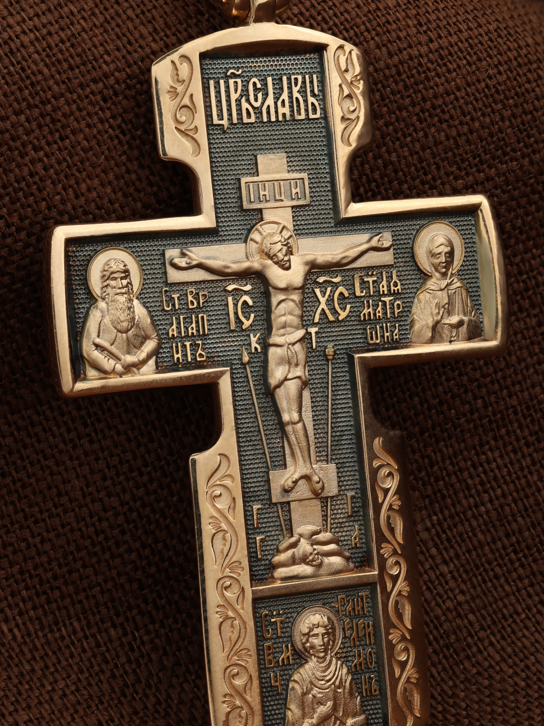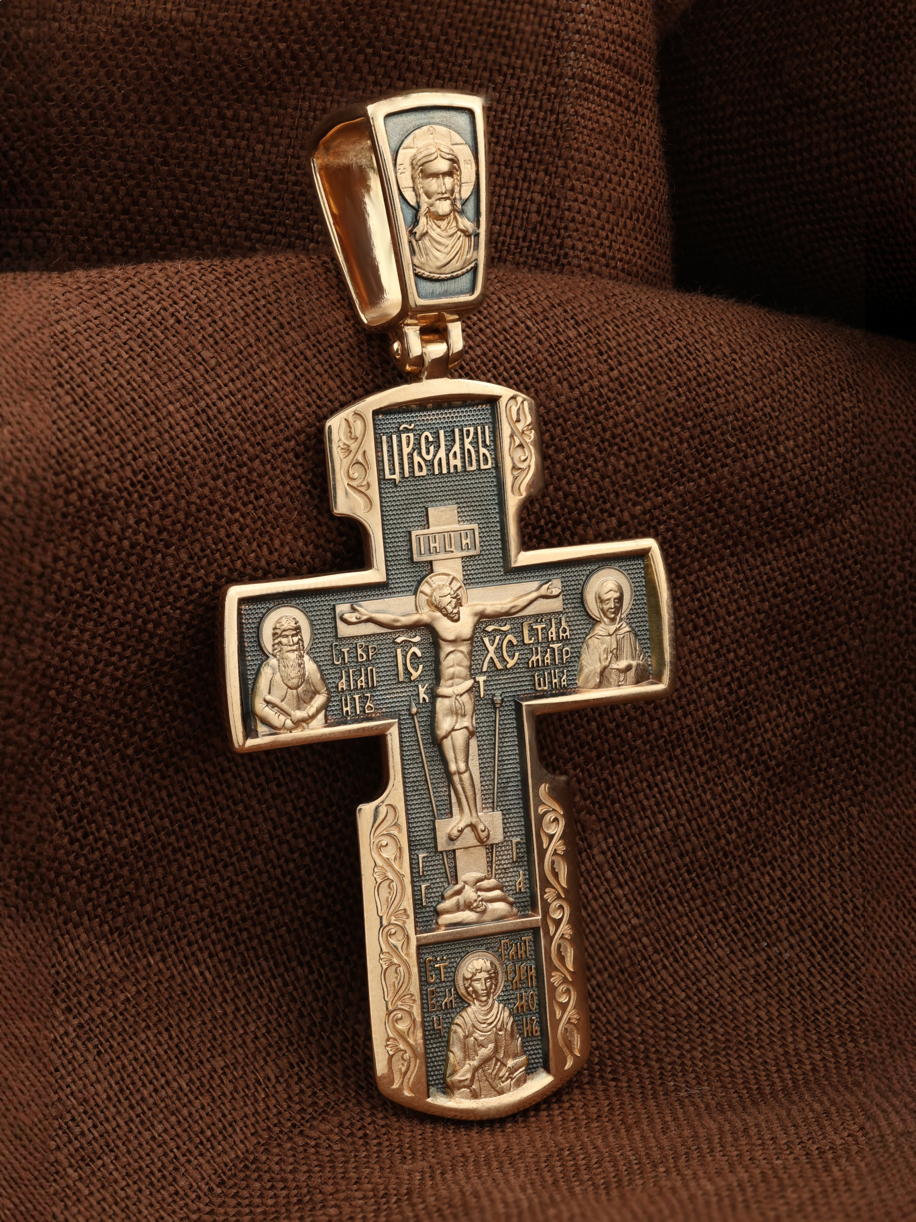 На лицевой стороне креста изображено Распятие Иисуса Христа на Голгофском Кресте. Над титлом видим слова «ЦРЬ СЛВЫ» — Царь Славы. Верхняя перекладина символизирует собой табличку с надписью «IHЦI» — Иисус Назарянин Царь Иудейский. Над перекладиной пишется сокращенно имя Спасителя «IC XC» — Иисус Христос, ниже перекладины добавляется: «НИКА» (греч. — Победитель). Возвышение, на котором стоит Крест, символизирует гору Голгофу, на которой произошло Распятие. У подножия Креста изображают прах Адама, обозначенный черепом.. Справа от Распятия помещен образ прославленной святой блаженной Матроны. «Матронушка», — ласково называют эту святую православные за удивительную любовь и помощь, которую она подает всем нуждающимся в ее поддержке. Слева — икона прп. Агапита. Этот святой жил в пещерах Киево-Печерского монастыря в XI веке и бескорыстно врачевал мирян и монахов.