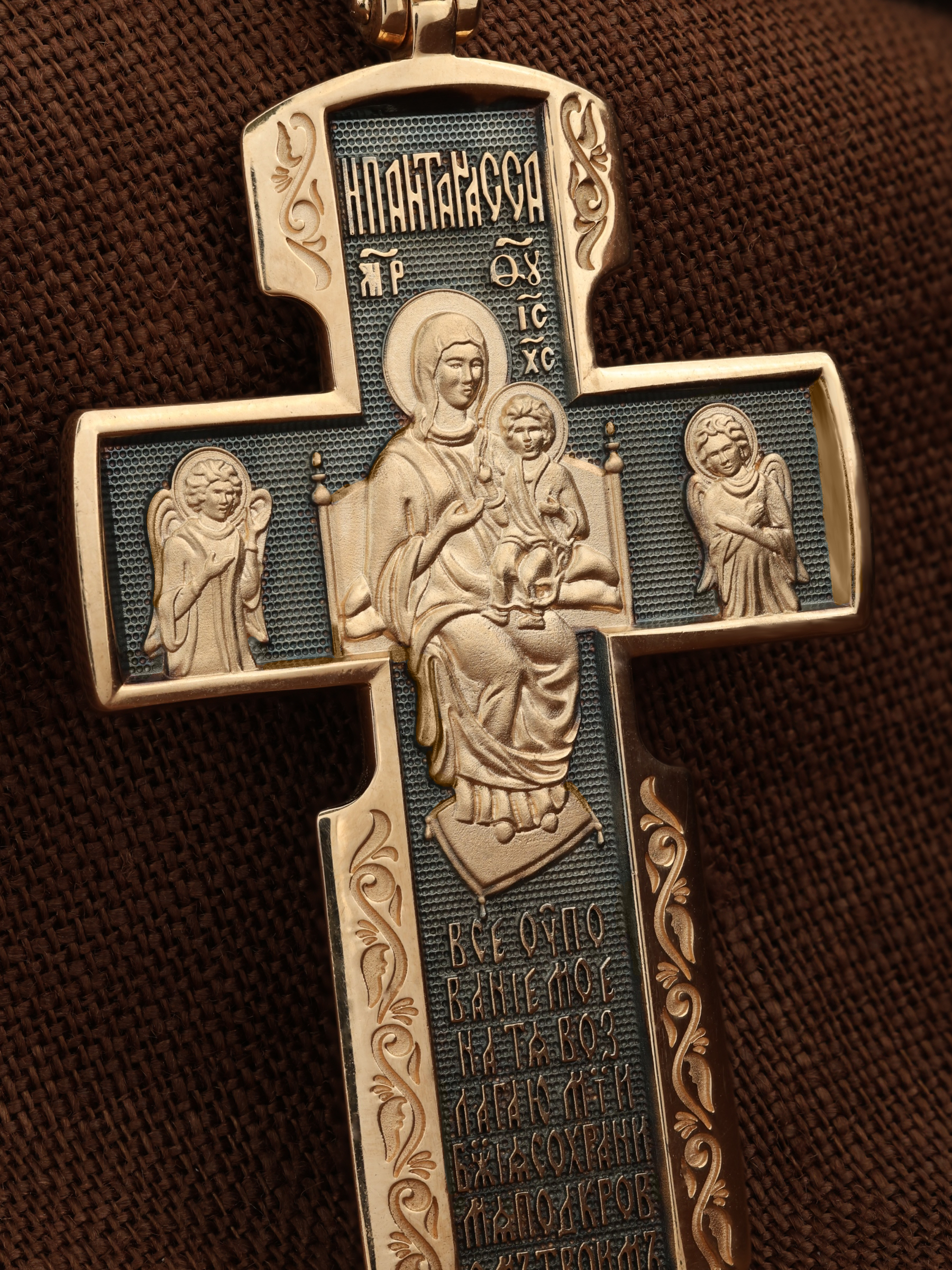 Внизу креста написана молитва обращенная к Божией Матери «Все упование мое на Тя возлагаю, Мати Божия, сохрани мя под кровом Твоим».