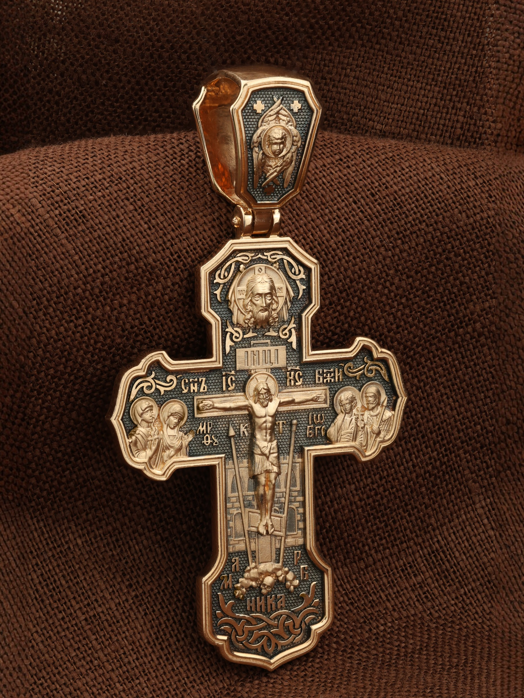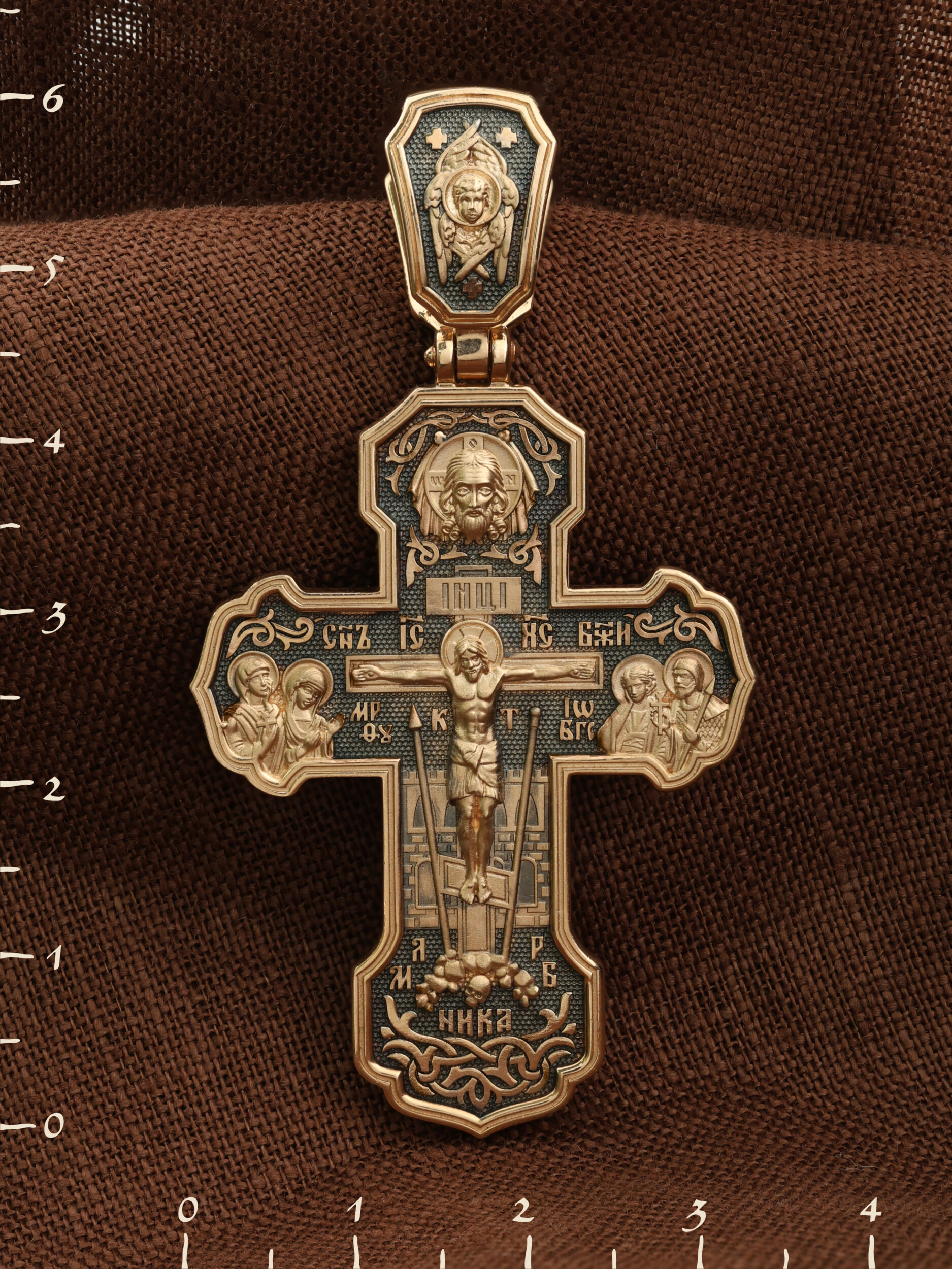 На лицевой стороне креста изображено Распятие Господа и Спасителя нашего Иисуса Христа. Крест- символ спасения и искупления рода человеческого, знамение победы над смертью и адом. Иисус Христос, как искупительная жертва освобождения человечества от власти греха, умер крестной смертью и в третий день воскрес. На верхней табличке, выше головы Иисуса, расположена надпись, составленная Понтием Пилатом — «IНЦI». Она означает «Иисус Назорей, Царь Иудейский». Надпись «IС» « ХС» означает Иисус Христос и помещается на разных сторонах поперечной (большой) перекладины креста. Рядом расположена надпись «Сын Божий». Выше Распятия изображен Нерукотворный образ Господа и Спасителя нашего Иисуса Христа. Слева от Распятия — Пресвятая Богородица и святая мироносица Мария Магдалина с крестом в руке. Справа — апостол и евангелист Иоанн Богослов, один из ближайших учеников Иисуса Христа и сотник Лонгин с крестом в правой руке и копьем — в левой. За крестом высится Иерусалимская стена. Крест стоит на горе камней, символизирующих Голгофу. В ее основании различается череп — это голова Адама. Вдоль креста изображены копие сотника Лонгина и трость с губкой и буквы «К» и «Т». Надпись «МЛРБ» — «место лобное рай бысть» означает, что место лобное стало раем и помещаются в нижней части креста. Рядом — слово «НИКА», что означает «победитель». На православном кресте Христос не умирает, а свободно простирает руки, ладони Иисуса открыты, будто он хочет обнять все человечество, даря им свою любовь и открывая путь к вечной жизни. На кулонном кольце изображен шестикрылый Серафим.