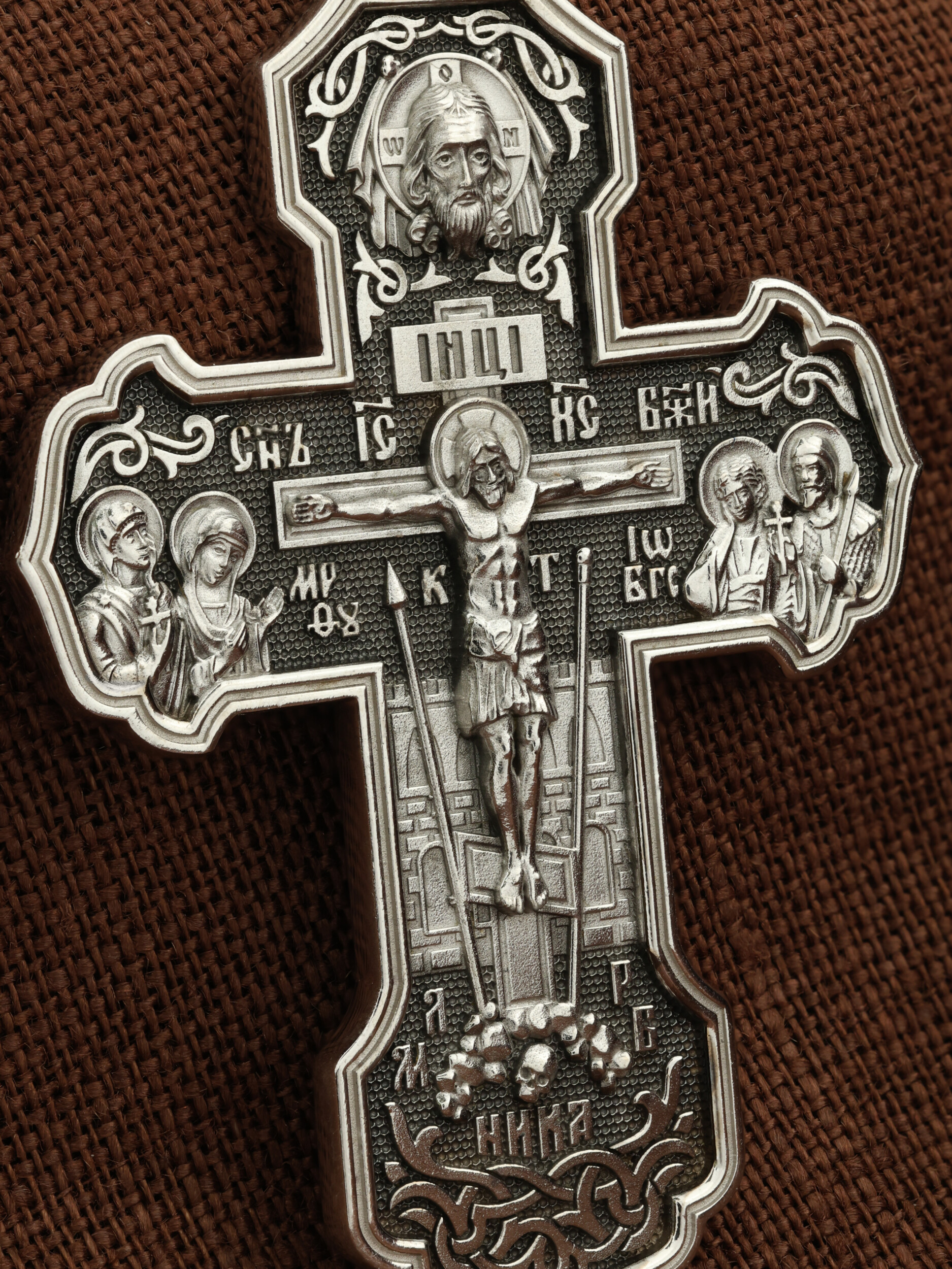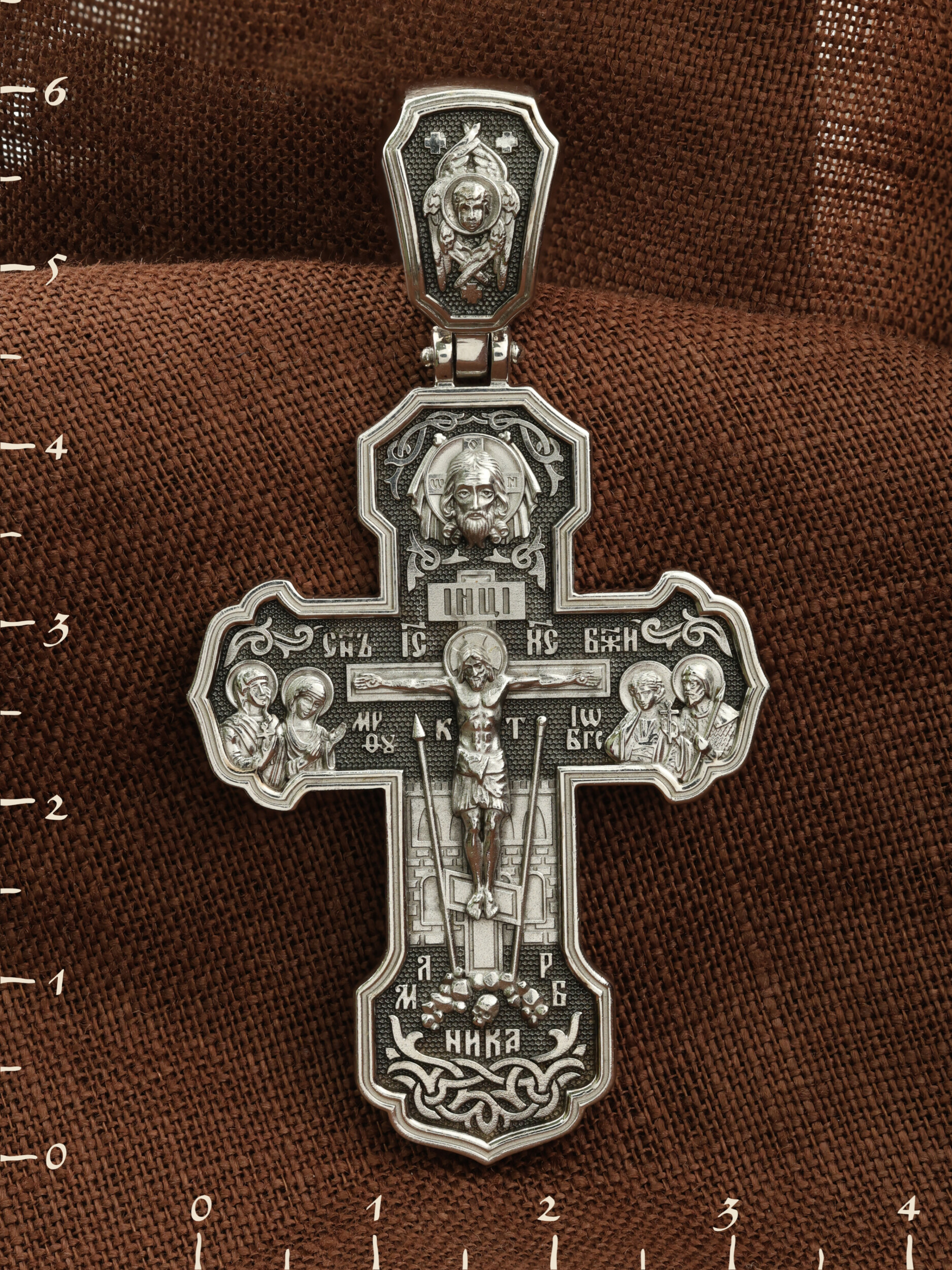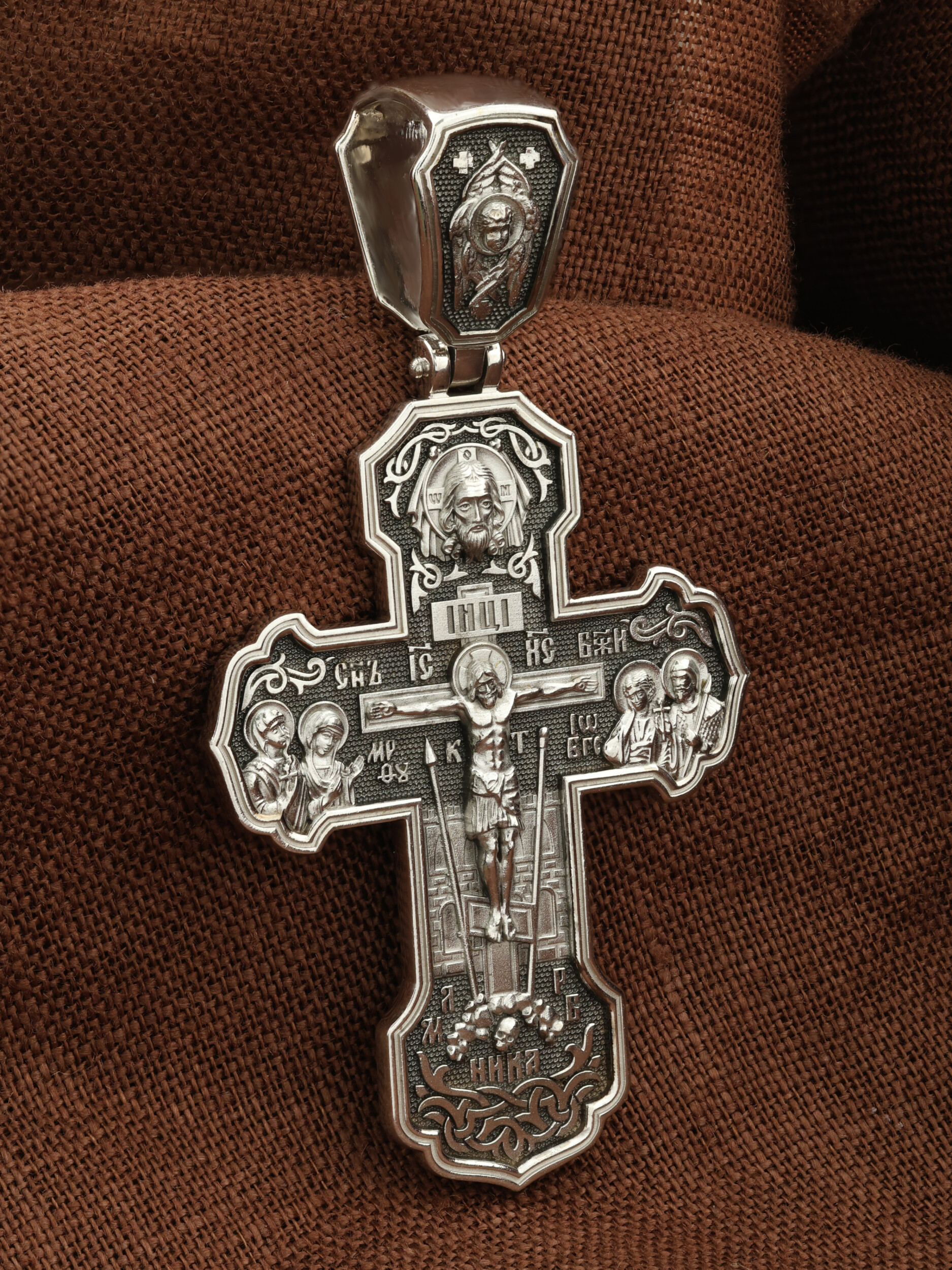 На лицевой стороне креста изображено Распятие Господа и Спасителя нашего Иисуса Христа. Крест- символ спасения и искупления рода человеческого, знамение победы над смертью и адом. Иисус Христос, как искупительная жертва освобождения человечества от власти греха, умер крестной смертью и в третий день воскрес. На верхней табличке, выше головы Иисуса, расположена надпись, составленная Понтием Пилатом — «IНЦI». Она означает «Иисус Назорей, Царь Иудейский». Надпись «IС» « ХС» означает Иисус Христос и помещается на разных сторонах поперечной (большой) перекладины креста. Рядом расположена надпись «Сын Божий». Выше Распятия изображен Нерукотворный образ Господа и Спасителя нашего Иисуса Христа. Слева от Распятия — Пресвятая Богородица и святая мироносица Мария Магдалина с крестом в руке. Справа — апостол и евангелист Иоанн Богослов, один из ближайших учеников Иисуса Христа и сотник Лонгин с крестом в правой руке и копьем — в левой. За крестом высится Иерусалимская стена. Крест стоит на горе камней, символизирующих Голгофу. В ее основании различается череп — это голова Адама. Вдоль креста изображены копие сотника Лонгина и трость с губкой и буквы «К» и «Т». Надпись «МЛРБ» — «место лобное рай бысть» означает, что место лобное стало раем и помещаются в нижней части креста. Рядом — слово «НИКА», что означает «победитель». На православном кресте Христос не умирает, а свободно простирает руки, ладони Иисуса открыты, будто он хочет обнять все человечество, даря им свою любовь и открывая путь к вечной жизни. На кулонном кольце изображен шестикрылый Серафим.