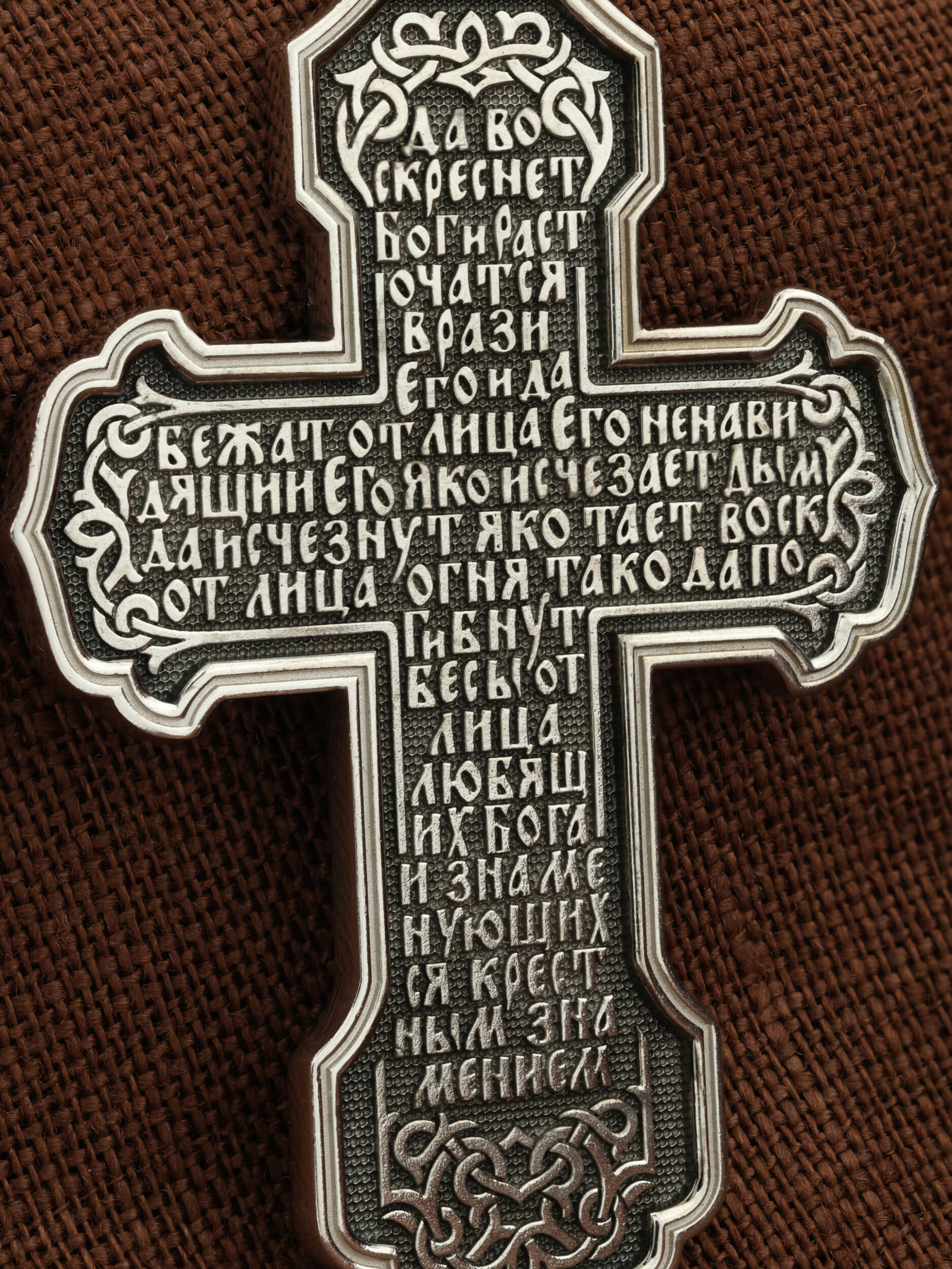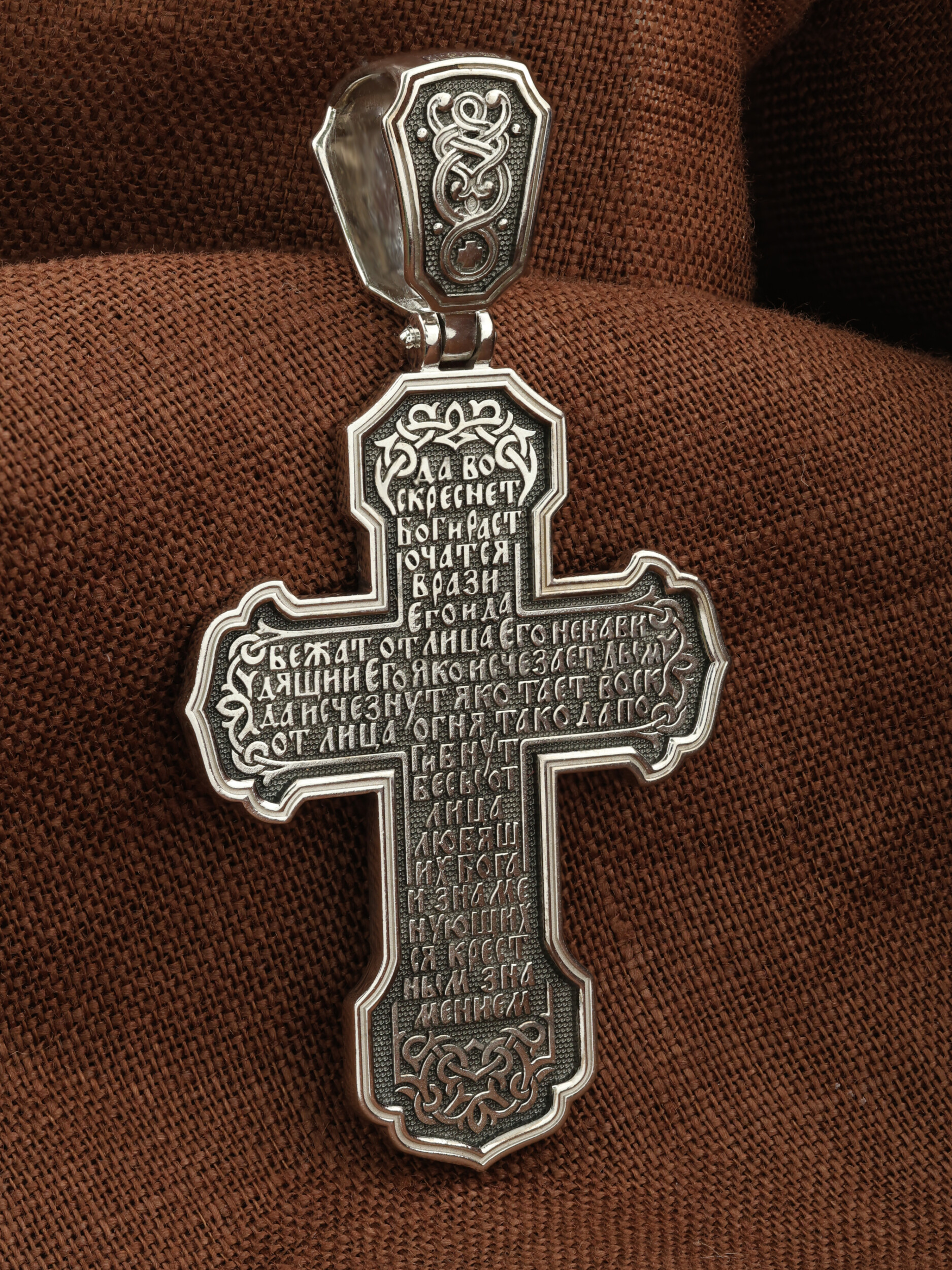 На оборотной стороне креста написана молитва Честному Кресту Господню: «Да воскреснет Бог, и расточатся врази Его, и да бежат от лица Его ненавидящии Его. Яко исчезает дым, да исчезнут; яко тает воск от лица огня, тако да погибнут беси от лица любящих Бога и знаменующихся крестным знамением…».