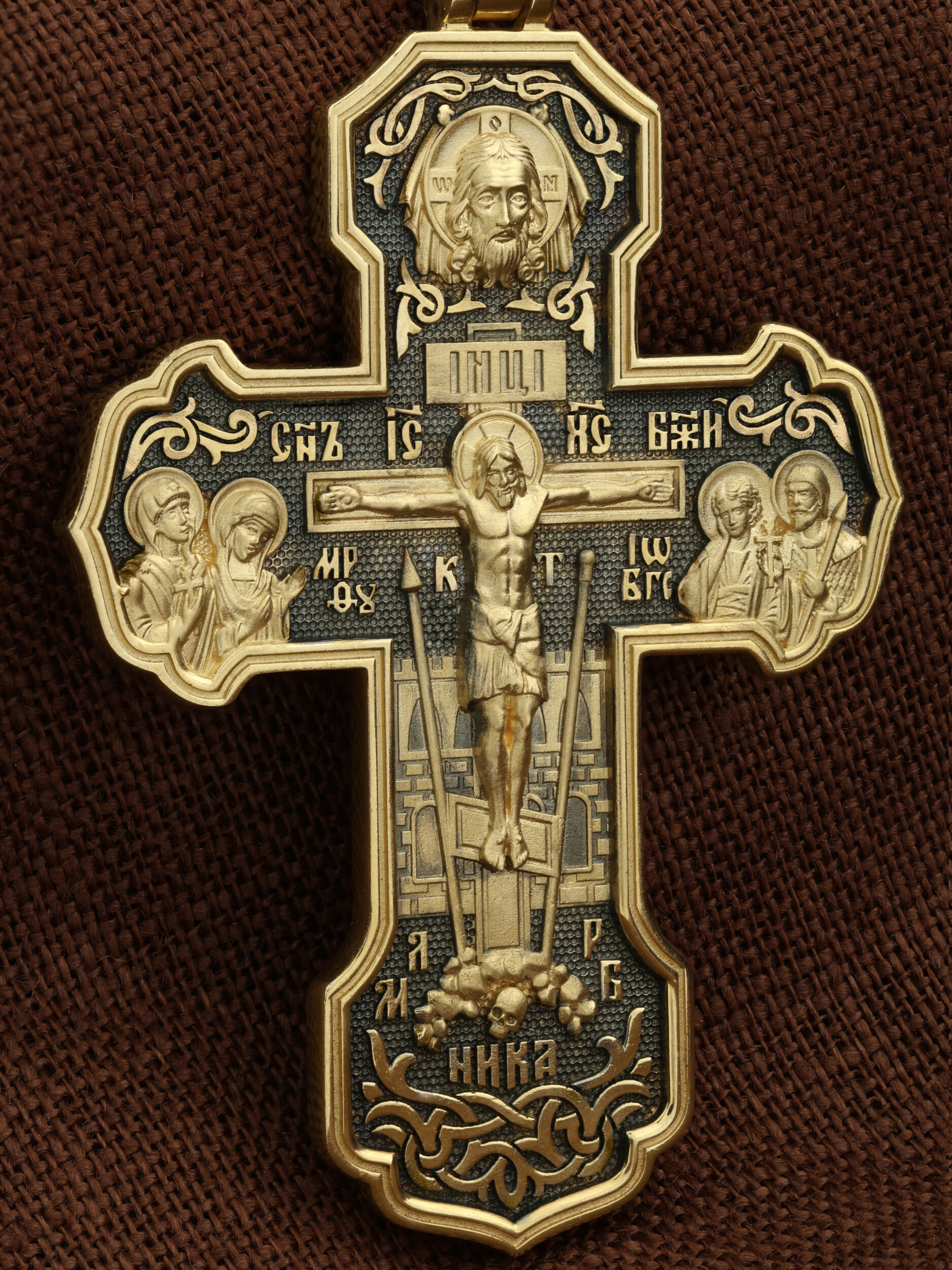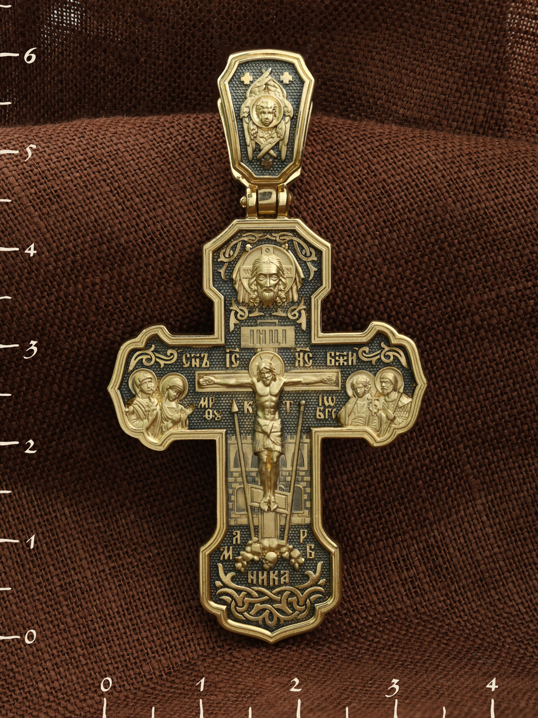 На лицевой стороне креста изображено Распятие Господа и Спасителя нашего Иисуса Христа. Крест- символ спасения и искупления рода человеческого, знамение победы над смертью и адом. Иисус Христос, как искупительная жертва освобождения человечества от власти греха, умер крестной смертью и в третий день воскрес. На верхней табличке, выше головы Иисуса, расположена надпись, составленная Понтием Пилатом — «IНЦI». Она означает «Иисус Назорей, Царь Иудейский». Надпись «IС» « ХС» означает Иисус Христос и помещается на разных сторонах поперечной (большой) перекладины креста. Рядом расположена надпись «Сын Божий». Выше Распятия изображен Нерукотворный образ Господа и Спасителя нашего Иисуса Христа. Слева от Распятия — Пресвятая Богородица и святая мироносица Мария Магдалина с крестом в руке. Справа — апостол и евангелист Иоанн Богослов, один из ближайших учеников Иисуса Христа и сотник Лонгин с крестом в правой руке и копьем — в левой. За крестом высится Иерусалимская стена. Крест стоит на горе камней, символизирующих Голгофу. В ее основании различается череп — это голова Адама. Вдоль креста изображены копие сотника Лонгина и трость с губкой и буквы «К» и «Т». Надпись «МЛРБ» — «место лобное рай бысть» означает, что место лобное стало раем и помещаются в нижней части креста. Рядом — слово «НИКА», что означает «победитель». На православном кресте Христос не умирает, а свободно простирает руки, ладони Иисуса открыты, будто он хочет обнять все человечество, даря им свою любовь и открывая путь к вечной жизни. На кулонном кольце изображен шестикрылый Серафим.