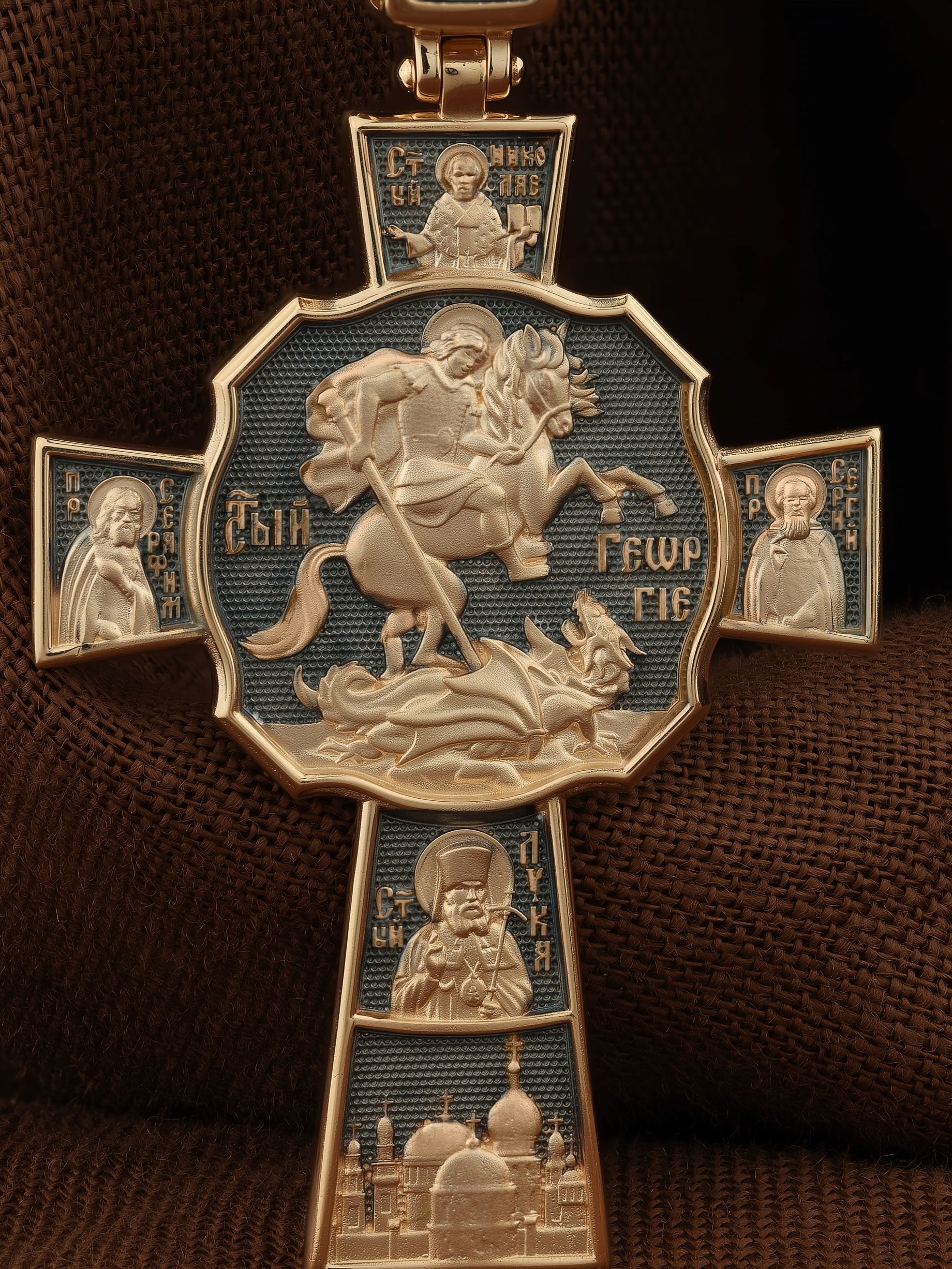 В центре оборотной стороне креста помещен образ Святого Великомученика Георгия Победоносца — одного из самых почитаемых и удивительных святых. На образке он изображен как воитель поражающий копьем огнедышащего змея. Змей символизирует собою сатанинские силы. Справа помещен образ Святого Преподобного Сергия, игумена Радонежского, чудотворца, слева — Преподобного Серафима Саровского, чудотвореца. Выше помещен образ Святителя Николая архиепископа Мир Ликийских, чудотвореца, ниже — образ святителя Луки (Войно-Ясенецкого), архиепископа Симферопольского и Крымского, исповедника и изображение Храма. На кулонном кольце изображен Спас Нерукотворный — образ Господа и Спасителя нашего Иисуса Христа, чудесно отпечатавшийся на плате, котором Христос вытер свой лик.