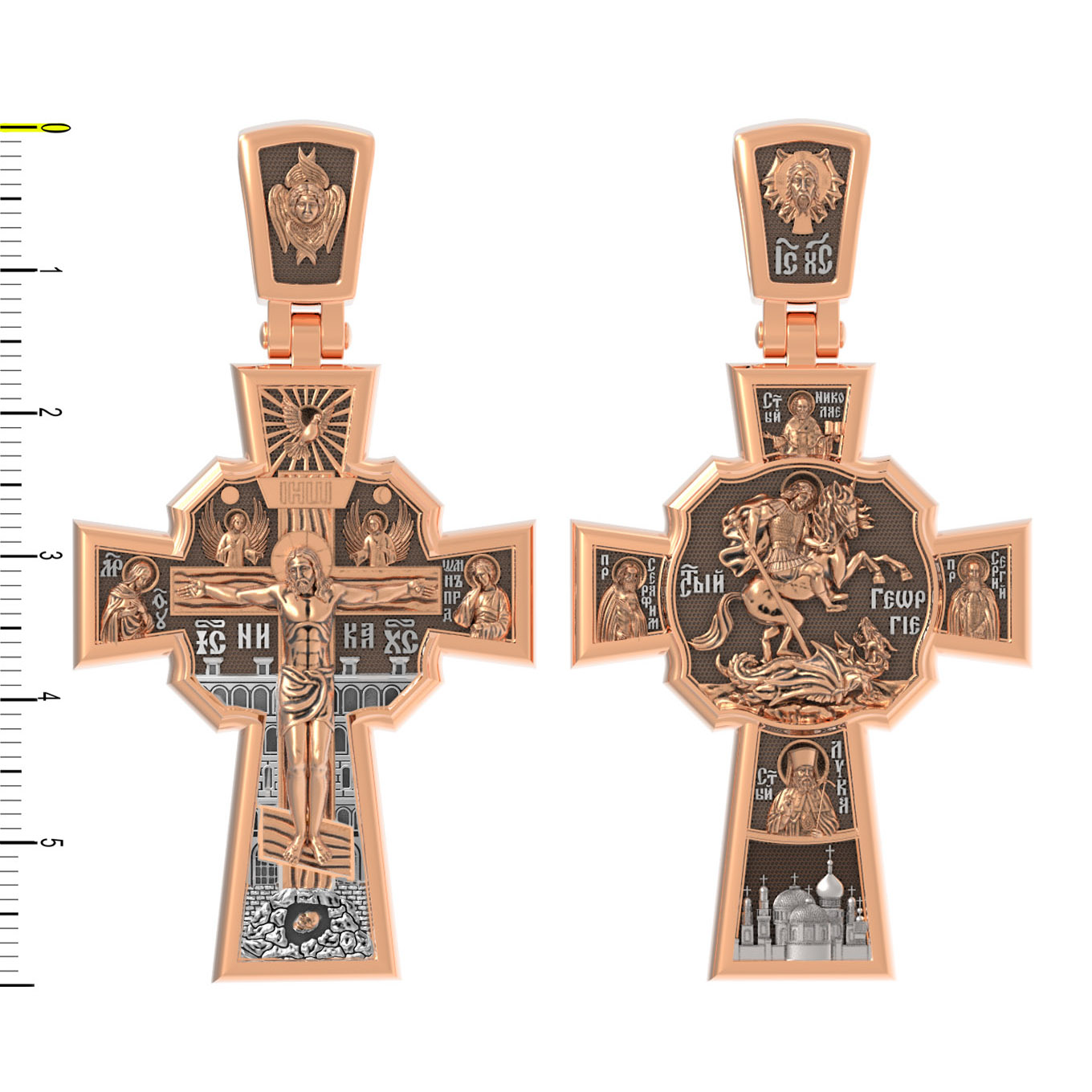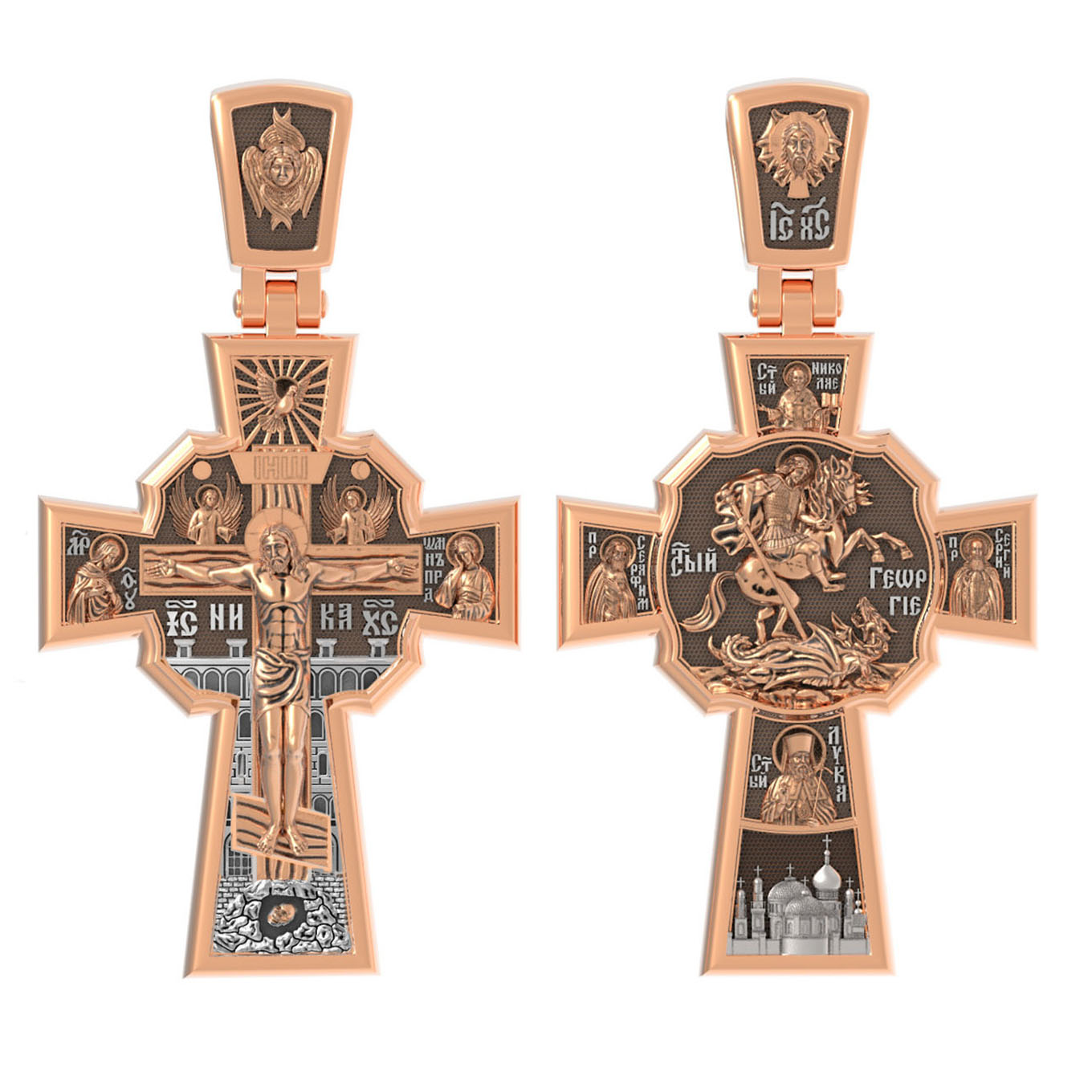В центре оборотной стороне креста помещен образ Святого Великомученика Георгия Победоносца — одного из самых почитаемых и удивительных святых. На образке он изображен как воитель поражающий копьем огнедышащего змея. Змей символизирует собою сатанинские силы. Справа помещен образ Святого Преподобного Сергия, игумена Радонежского, чудотворца, слева — Преподобного Серафима Саровского, чудотвореца. Выше помещен образ Святителя Николая архиепископа Мир Ликийских, чудотвореца, ниже — образ святителя Луки (Войно-Ясенецкого), архиепископа Симферопольского и Крымского, исповедника и изображение Храма. На кулонном кольце изображен Спас Нерукотворный — образ Господа и Спасителя нашего Иисуса Христа, чудесно отпечатавшийся на плате, котором Христос вытер свой лик.