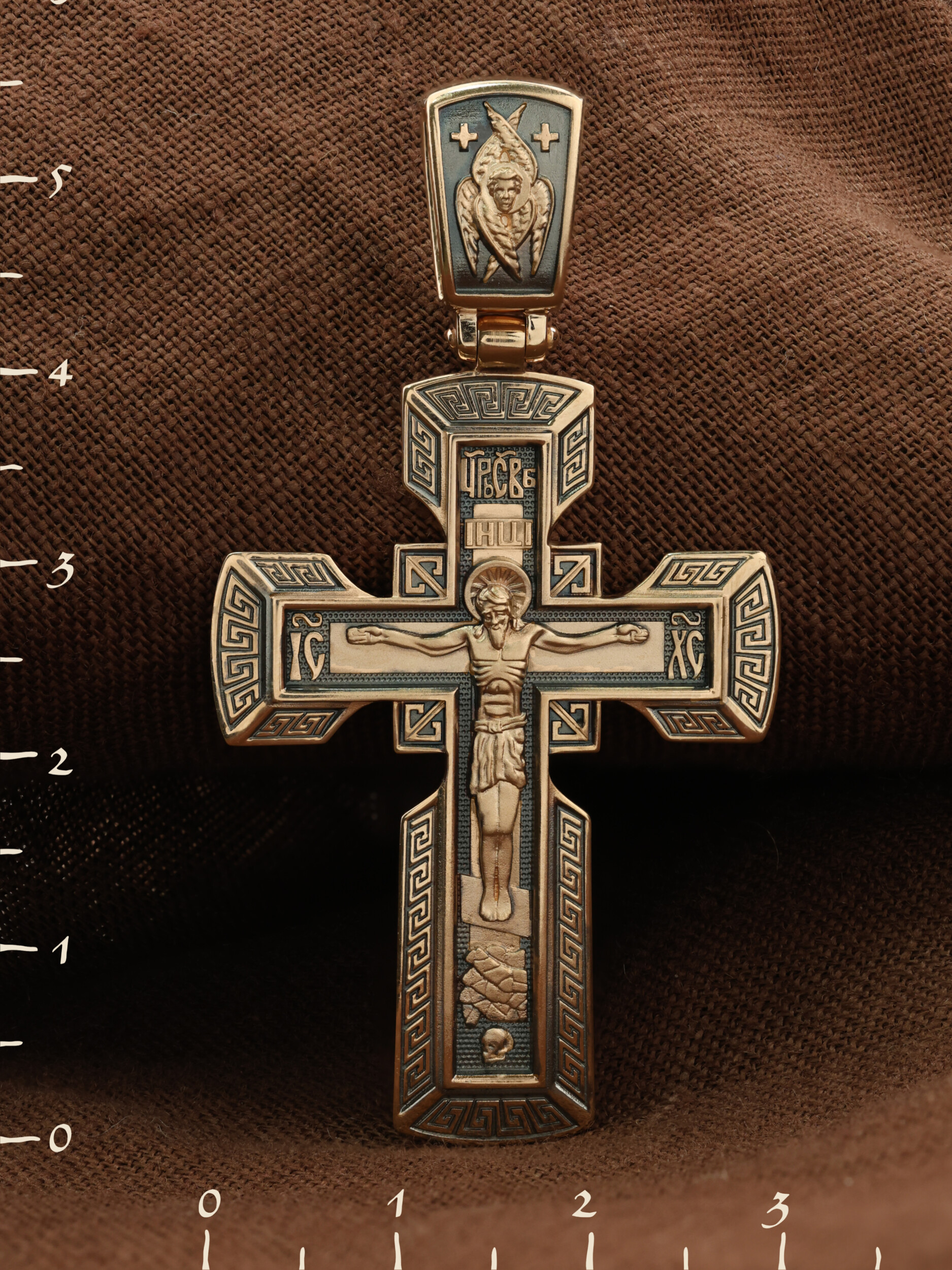 Рамка, украшенная византийским орнаментальным мотивом, обрамляет простой и очень традиционный нательный крест.