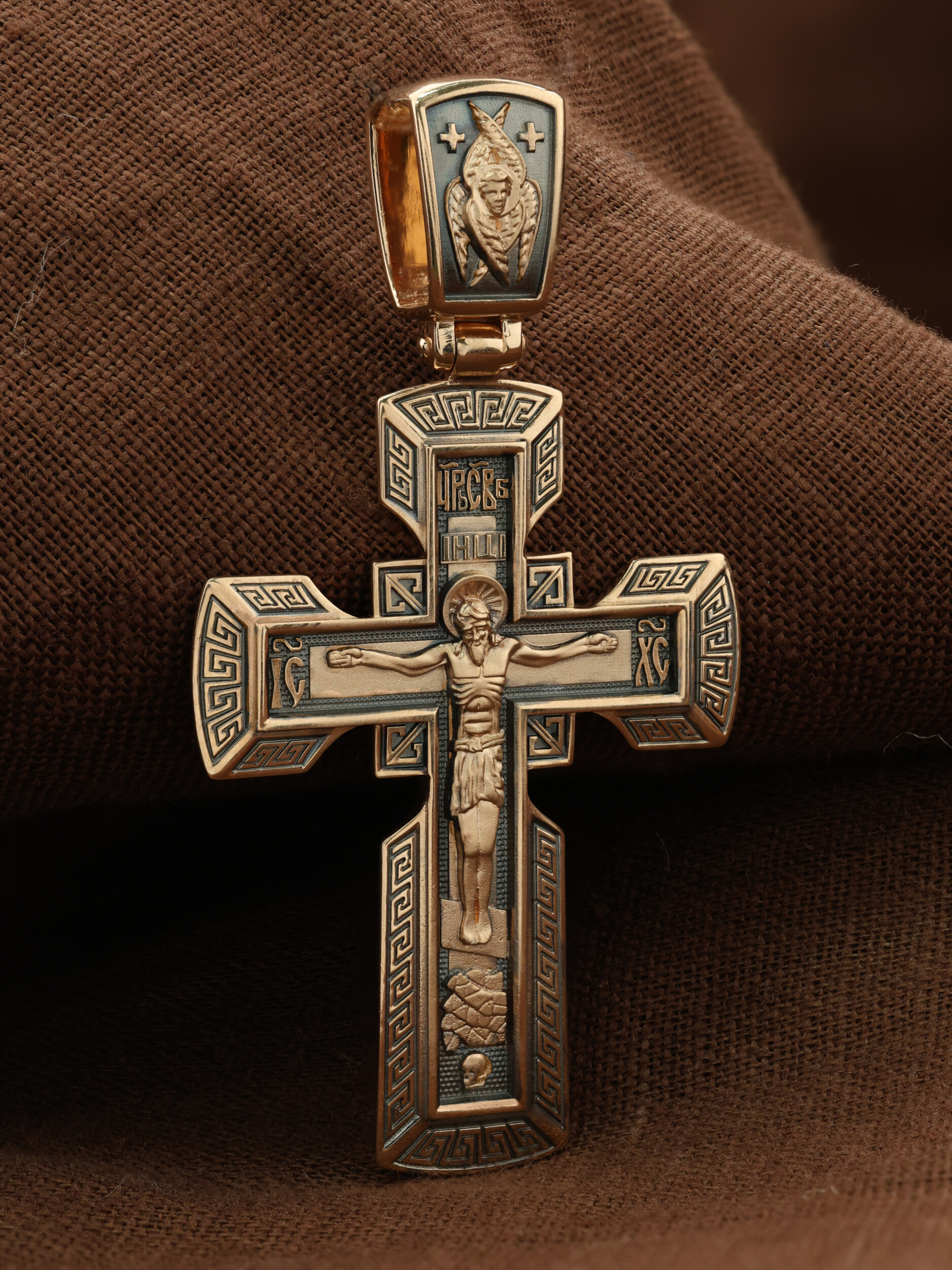 На его лицевой стороне изображено Распятие Господне на восьмиконечном Голгофском кресте. Над головой Спасителя на поперечной перекладине помещена надпись «IНЦI», которая является сокращенным выражением титла, установленного на Кресте Понтием Пилатом: «Иисус Назорей Царь Иудейский». На боковых оконечностях креста вписаны инициалы святого имени Христа «IС ХС». В верхней оконечности креста имеется монограмма «Царь Славы», которая гласит о том, что Христос — Великий Архиерей, Царь и Жертвенный Агнец, искупивший грехи мира. У подножия креста в виде каменистого пригорка изображена гора Голгофа с Главой Адамовой в пещере.