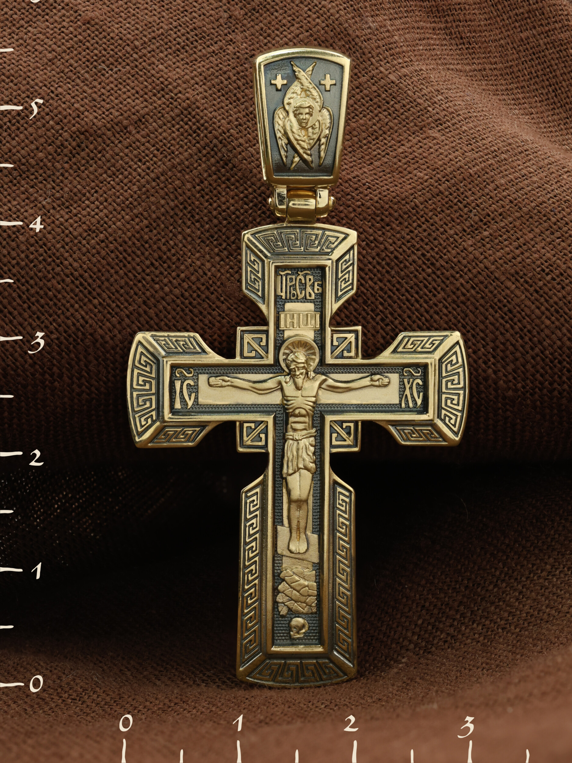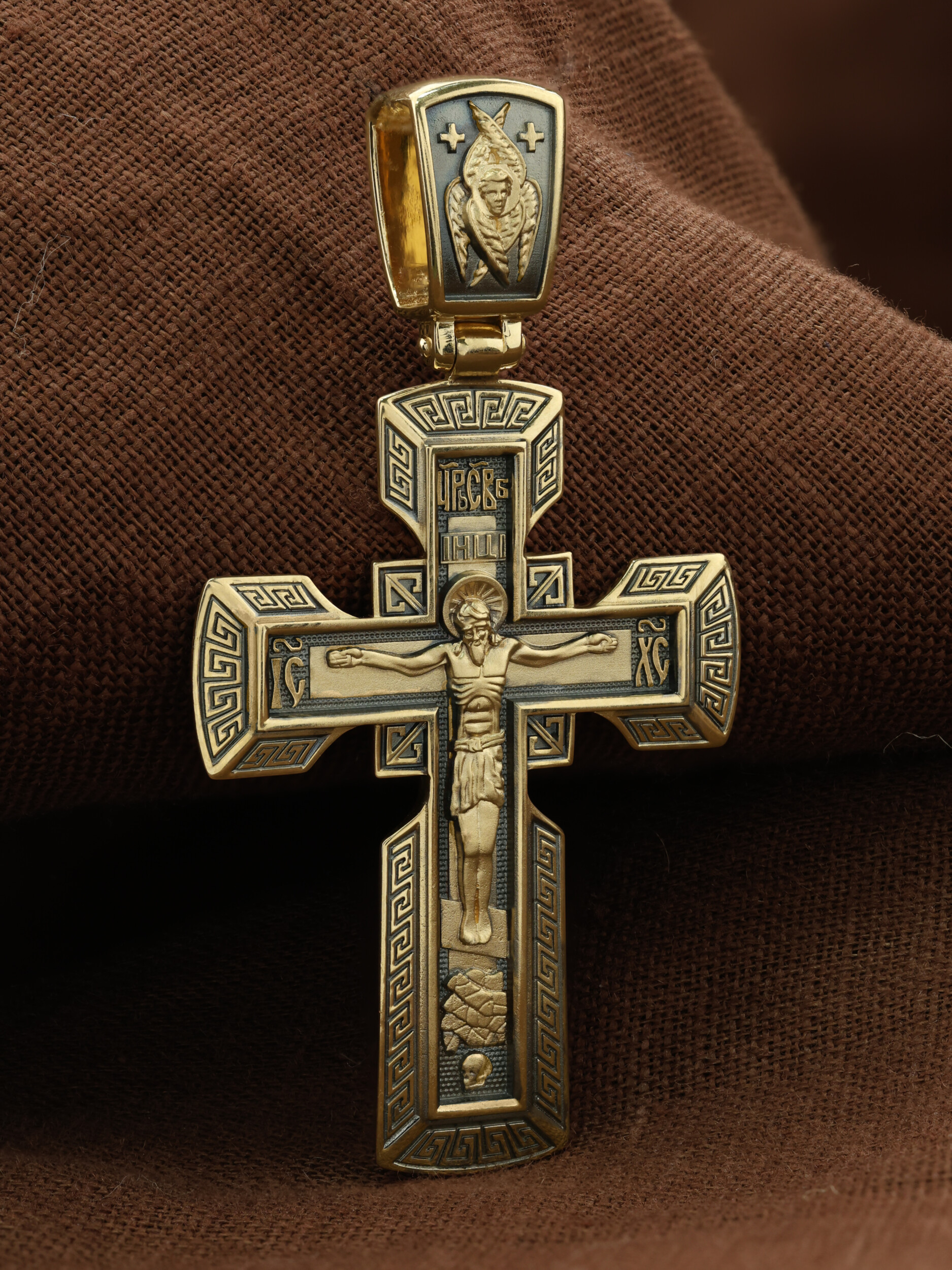 На его лицевой стороне изображено Распятие Господне на восьмиконечном Голгофском кресте. Над головой Спасителя на поперечной перекладине помещена надпись «IНЦI», которая является сокращенным выражением титла, установленного на Кресте Понтием Пилатом: «Иисус Назорей Царь Иудейский». На боковых оконечностях креста вписаны инициалы святого имени Христа «IС ХС». В верхней оконечности креста имеется монограмма «Царь Славы», которая гласит о том, что Христос — Великий Архиерей, Царь и Жертвенный Агнец, искупивший грехи мира. У подножия креста в виде каменистого пригорка изображена гора Голгофа с Главой Адамовой в пещере.