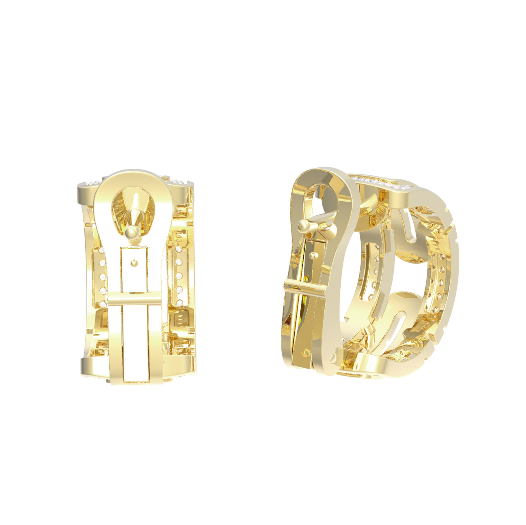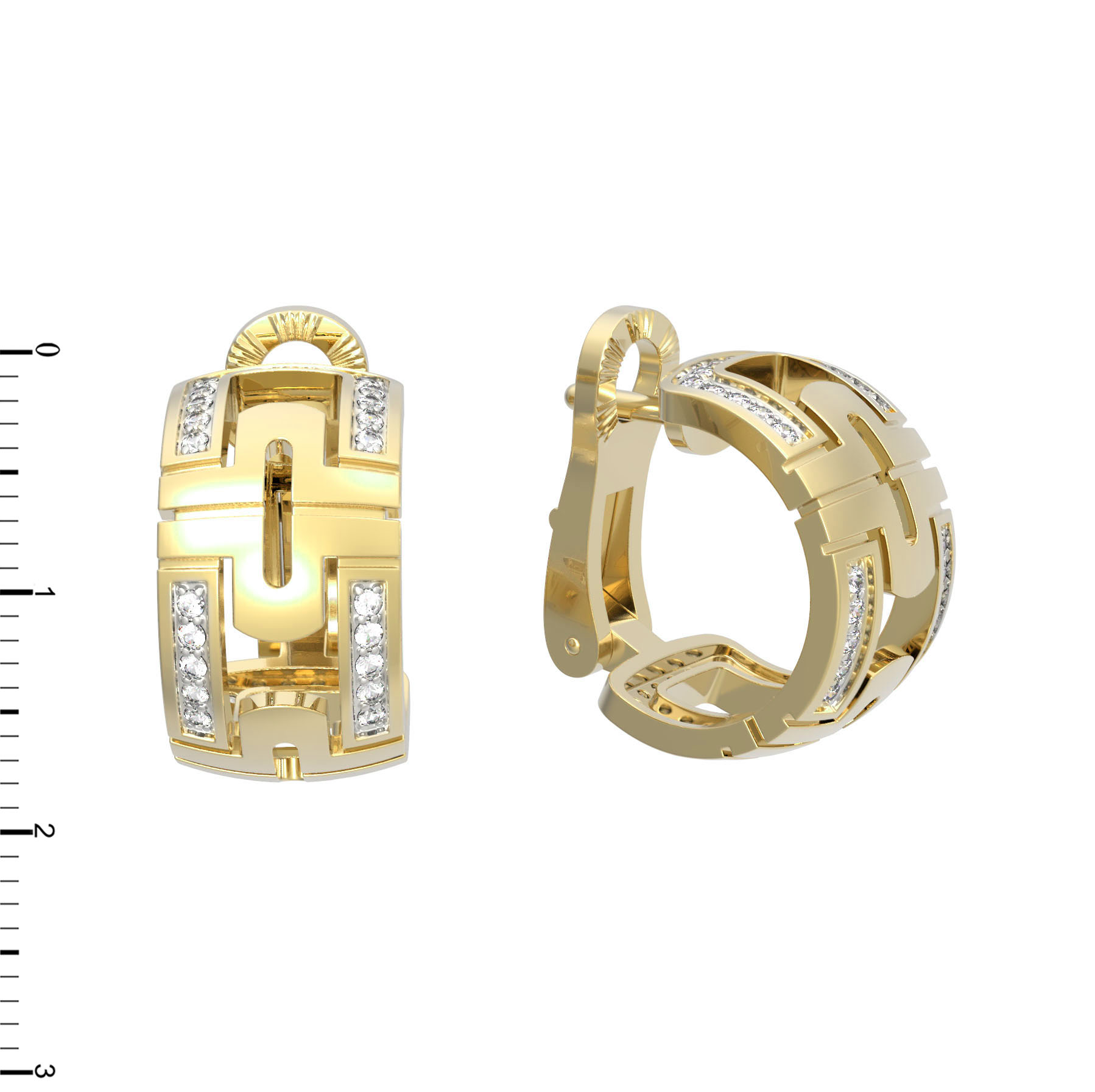 Особую ценность изделию придает богатая инкрустация: 76 бриллиантов круглой формы с чистым белым цветом вставок создают завораживающую игру света, эффектно контрастируя с теплым сиянием лимонного золота. Сложная архитектура формы напоминает элементы механизма, что подчеркивает динамичный характер украшения. Тщательная проработка деталей обеспечивает комфортную посадку и надежную фиксацию.