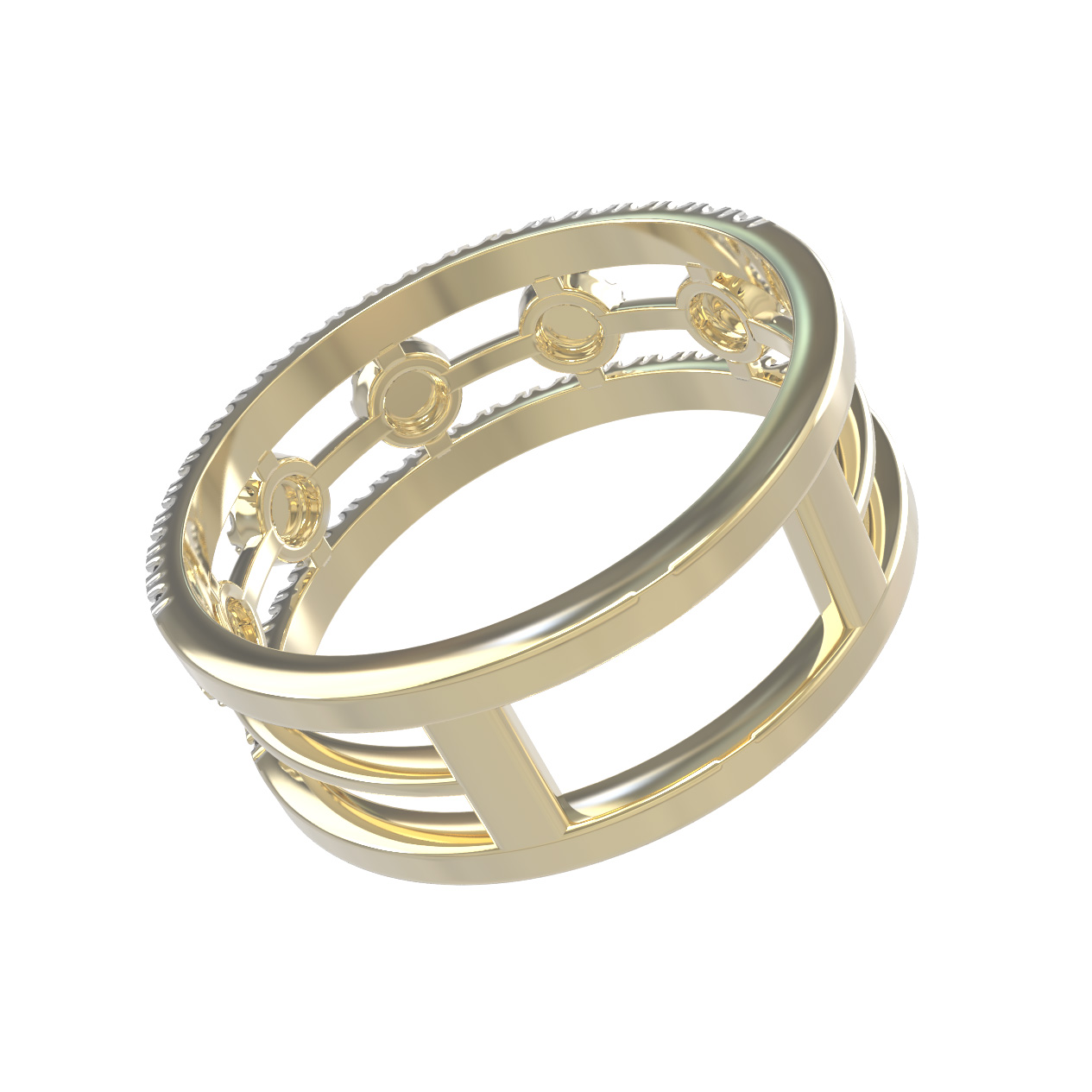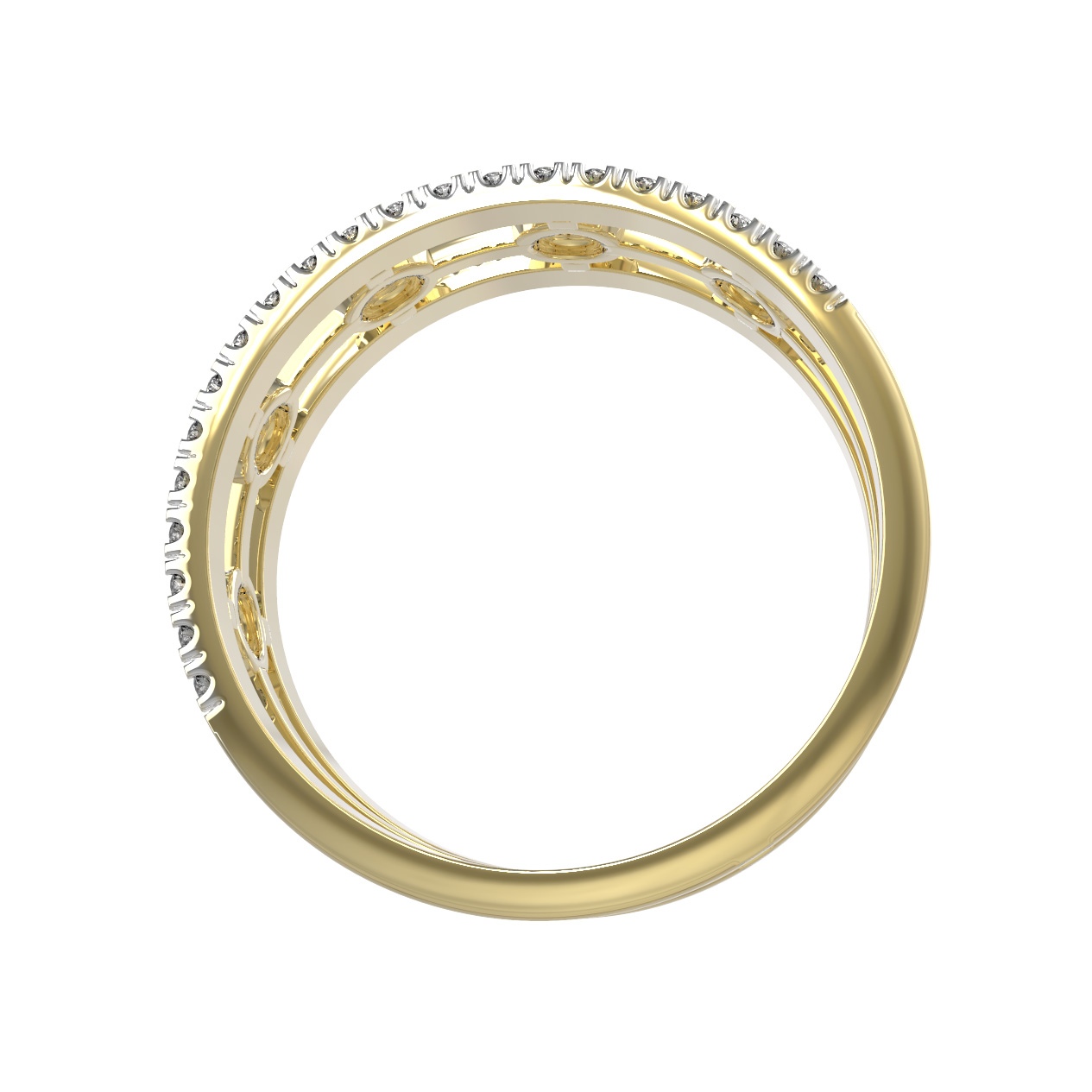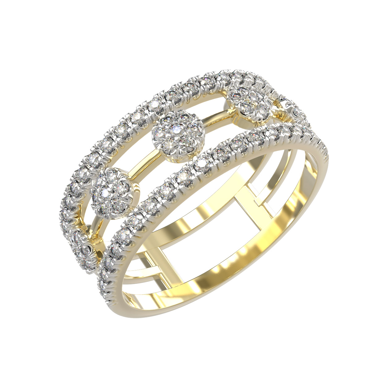 Роскошное кольцо из лимонного золота 585 пробы станет центральным акцентом вашего образа, подчеркивая статус и безупречный вкус. Дизайн изделия впечатляет своей сложностью и воздушностью: основу составляют два параллельных ободка, соединенных декоративными элементами, украшенными сияющими бриллиантами. Центральная часть изделия дополнена акцентными цветочными композициями, которые придают украшению особый шарм и изысканность.
