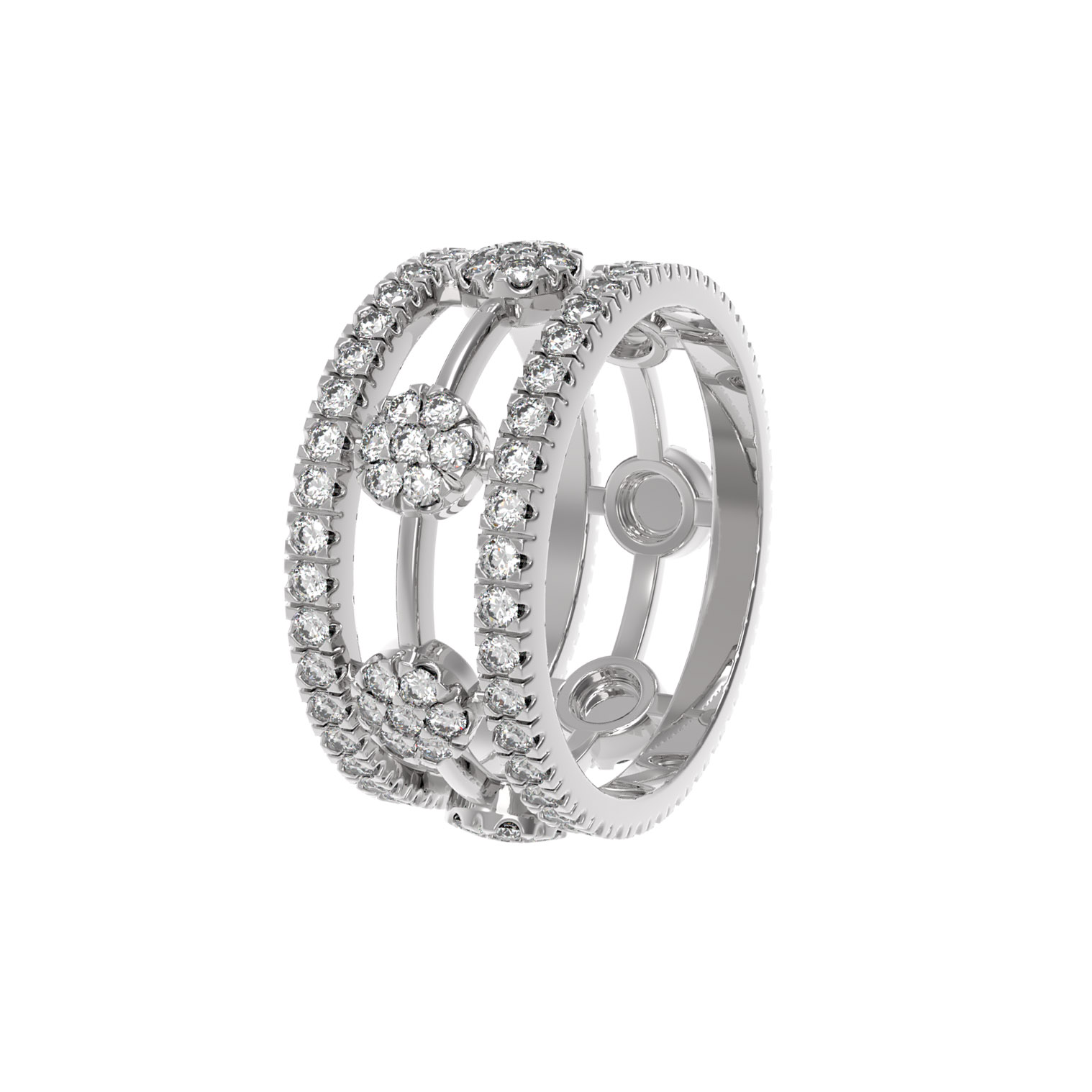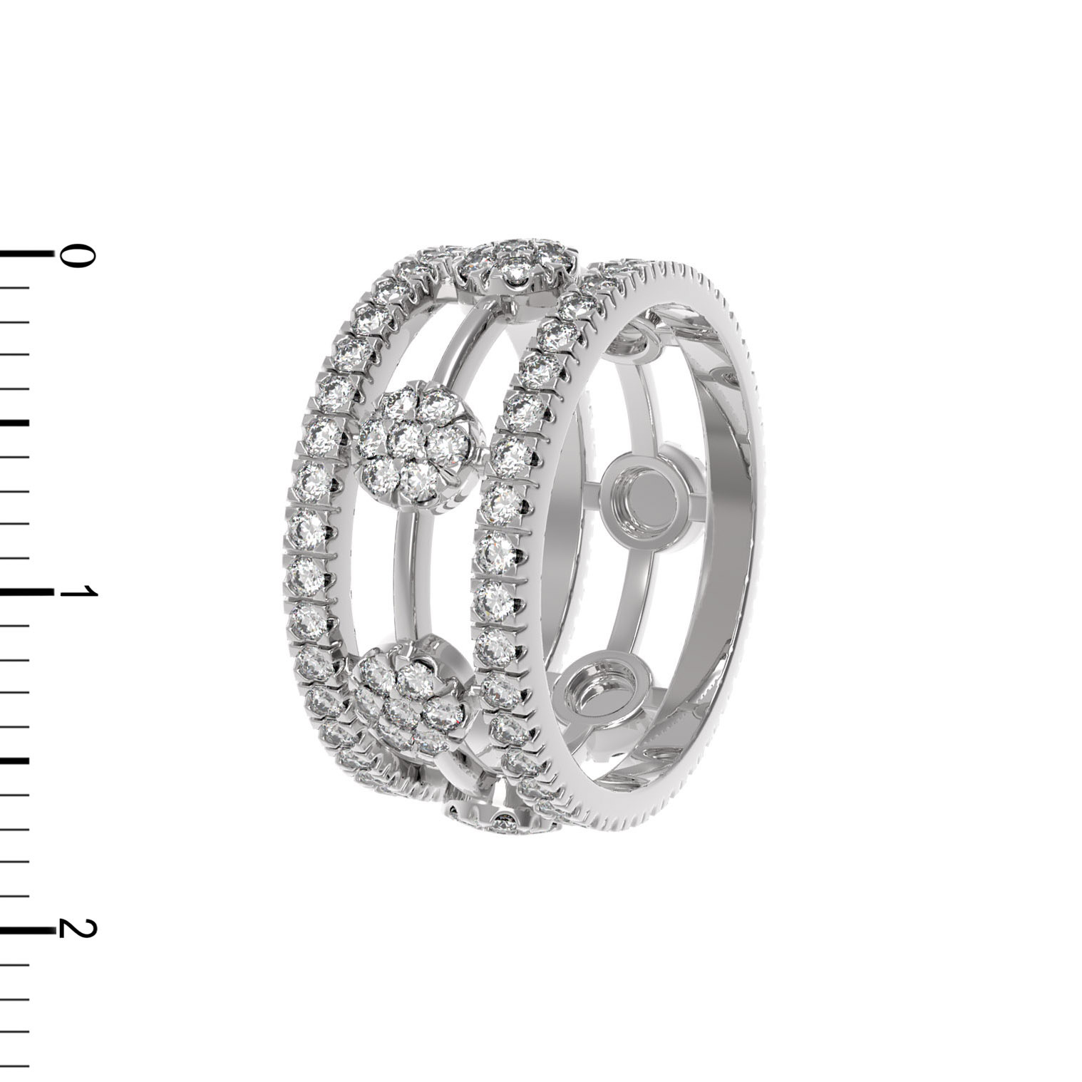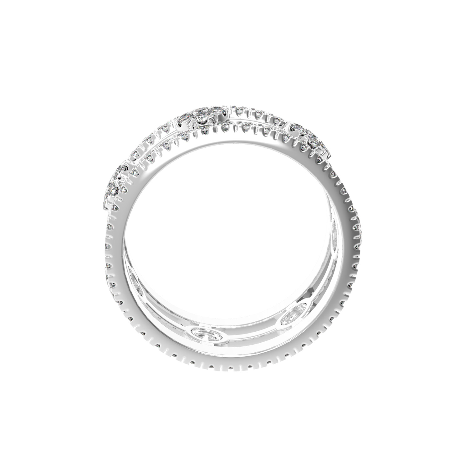 Особую ценность модели придает внушительная россыпь вставок: 127 бриллиантов с огранкой круг чаруют своей игрой света и безупречным белым цветом. Благородный холодный оттенок белого золота идеально сочетается с чистотой драгоценных камней, создавая гармоничный и завершенный образ. Сложная и детализированная конструкция кольца привлекает внимание к мастерству исполнения, где каждая деталь продумана до мелочей.
