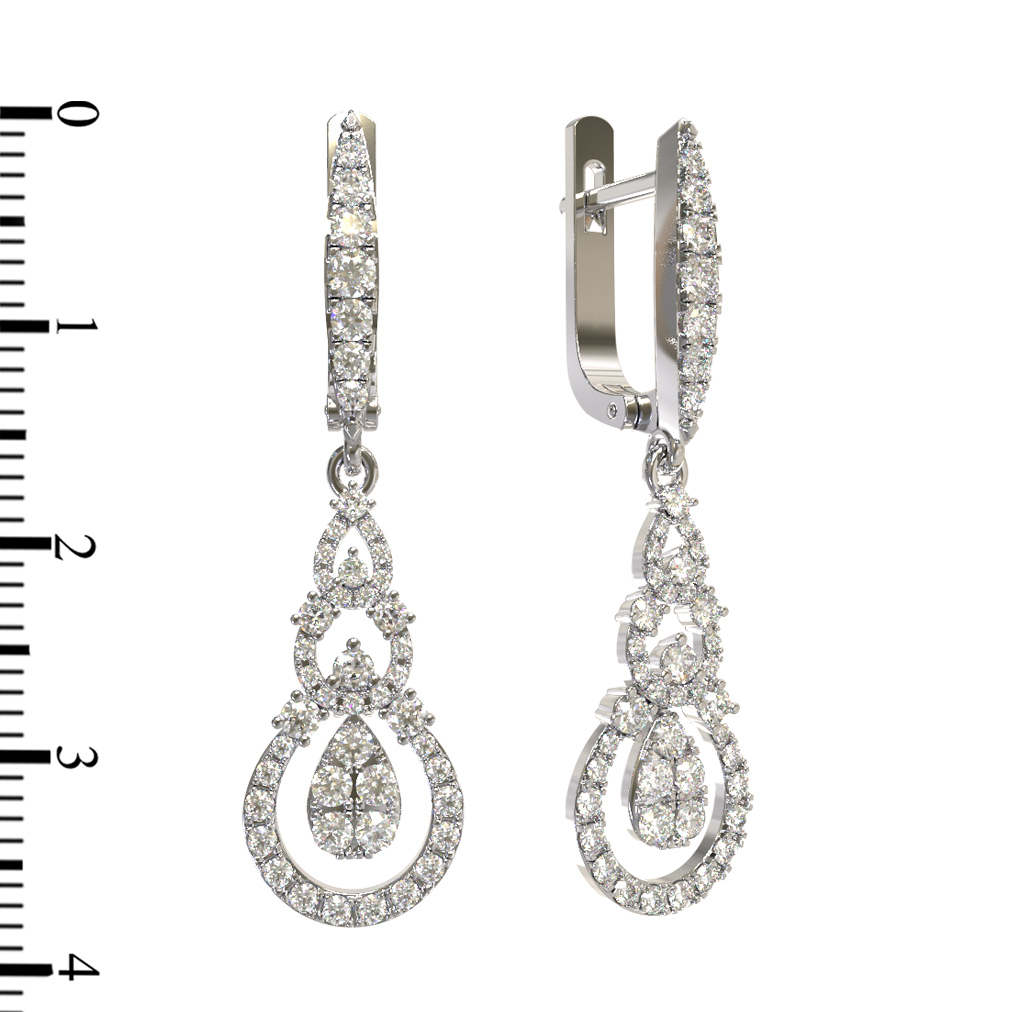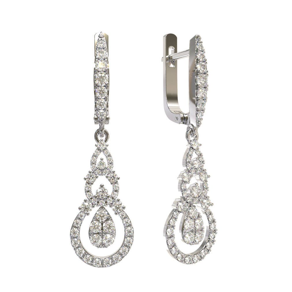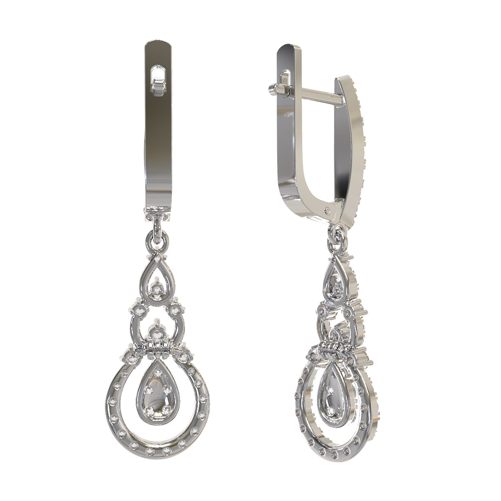 Дизайн модели продуман до мелочей: в качестве декоративных элементов использованы 96 бриллиантов круглой формы с белым цветом вставок. Камни расположены таким образом, чтобы максимально раскрыть игру света при каждом движении, создавая эффектное мерцание. Эти серьги созданы как для женщин, так и для мужчин, предпочитающих подчеркнуть свою индивидуальность качественными ювелирными изделиями. Сложная композиция вставок придает украшению объем и динамику.
