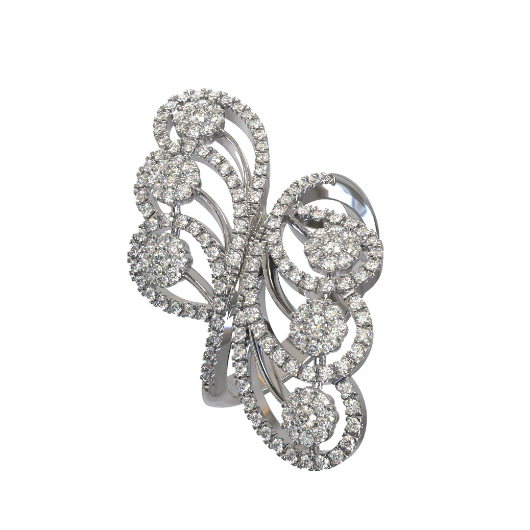 Основой кольца служит благородное белое золото 585 пробы, холодный блеск которого идеально сочетается с сиянием драгоценных камней. Роскошное украшение инкрустировано 166 бриллиантами круглой формы, которые дарят аксессуару неповторимый блеск при любом освещении. Белые вставки распределены по всей поверхности изделия, подчеркивая каждый изгиб металла и создавая гармоничную композицию.