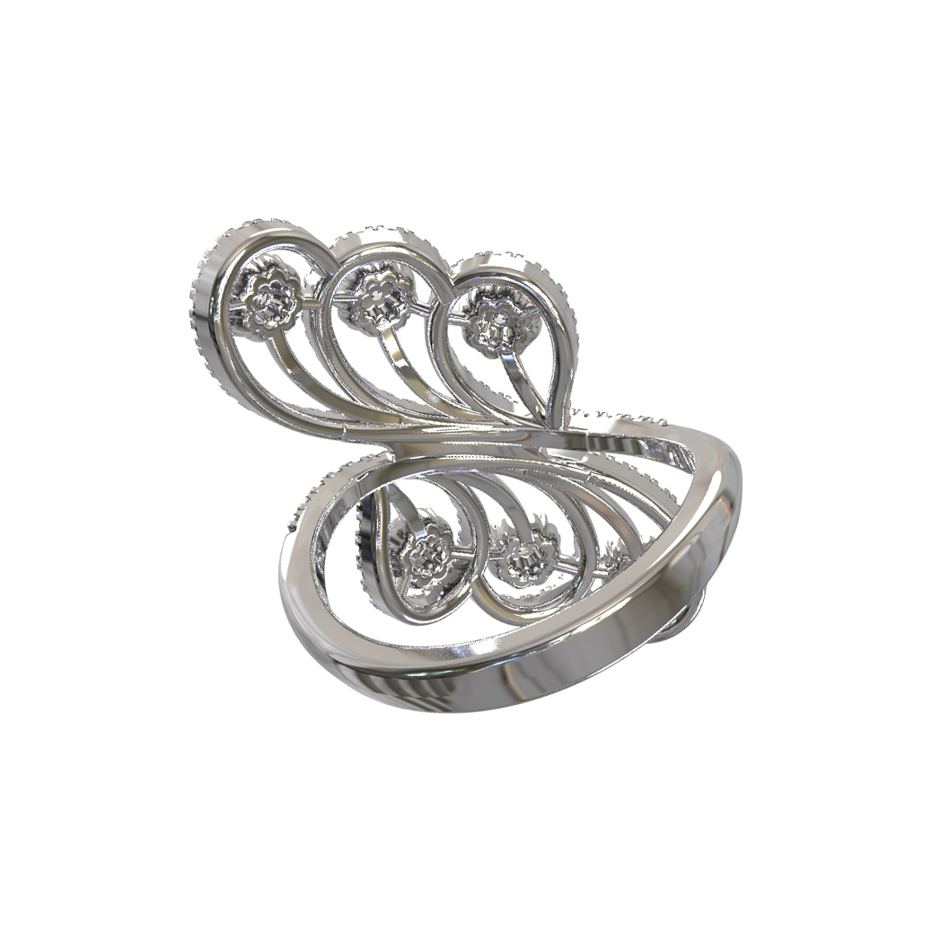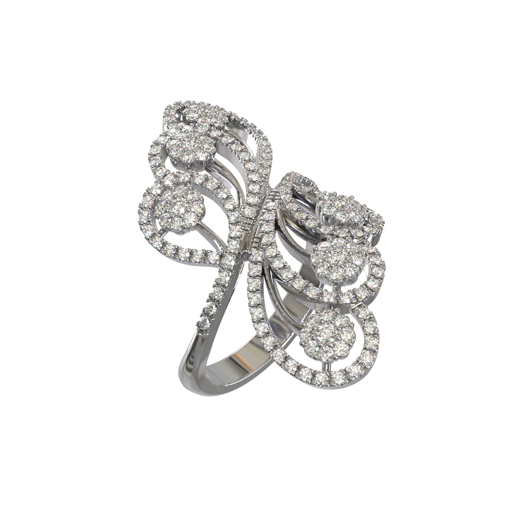Кольцо из белого золота с бриллиантами — это воплощение изысканности и утонченного стиля для ценителей ювелирного искусства. Изделие, представленное в коллекции De Luxe Бриллианты — Royal, сразу привлекает внимание своим сложным, филигранным дизайном. Изящные ажурные линии, напоминающие крылья или причудливые растительные мотивы, создают эффект легкости и воздушности, несмотря на статусность украшения.