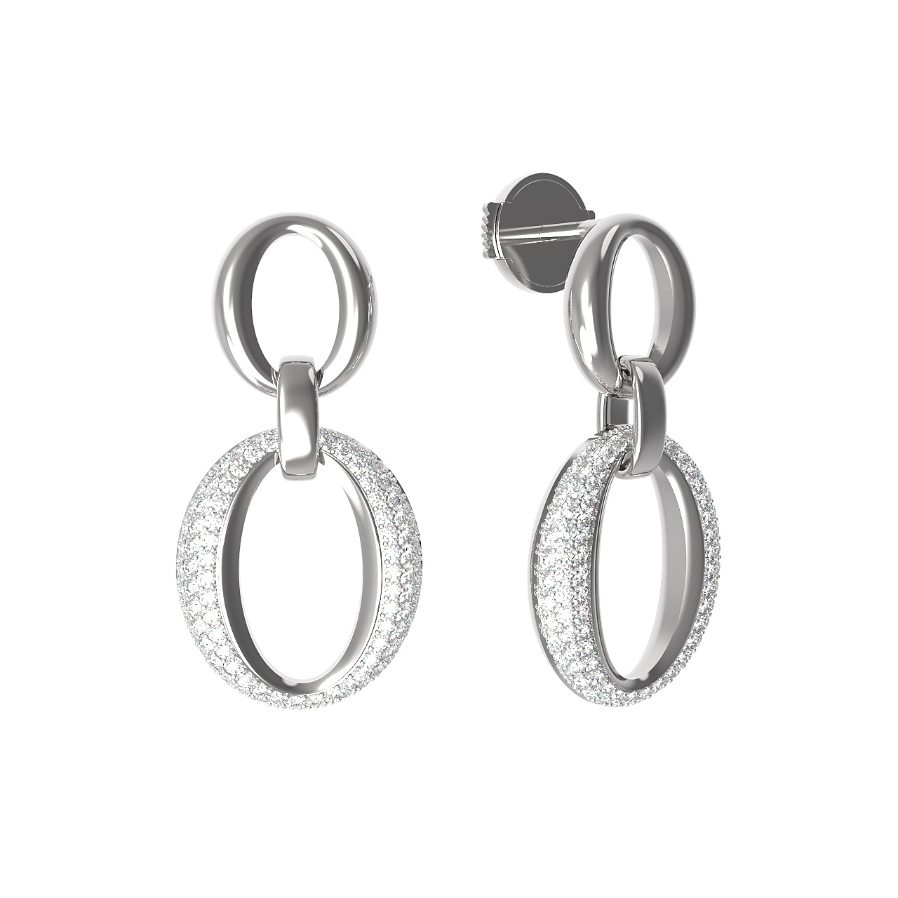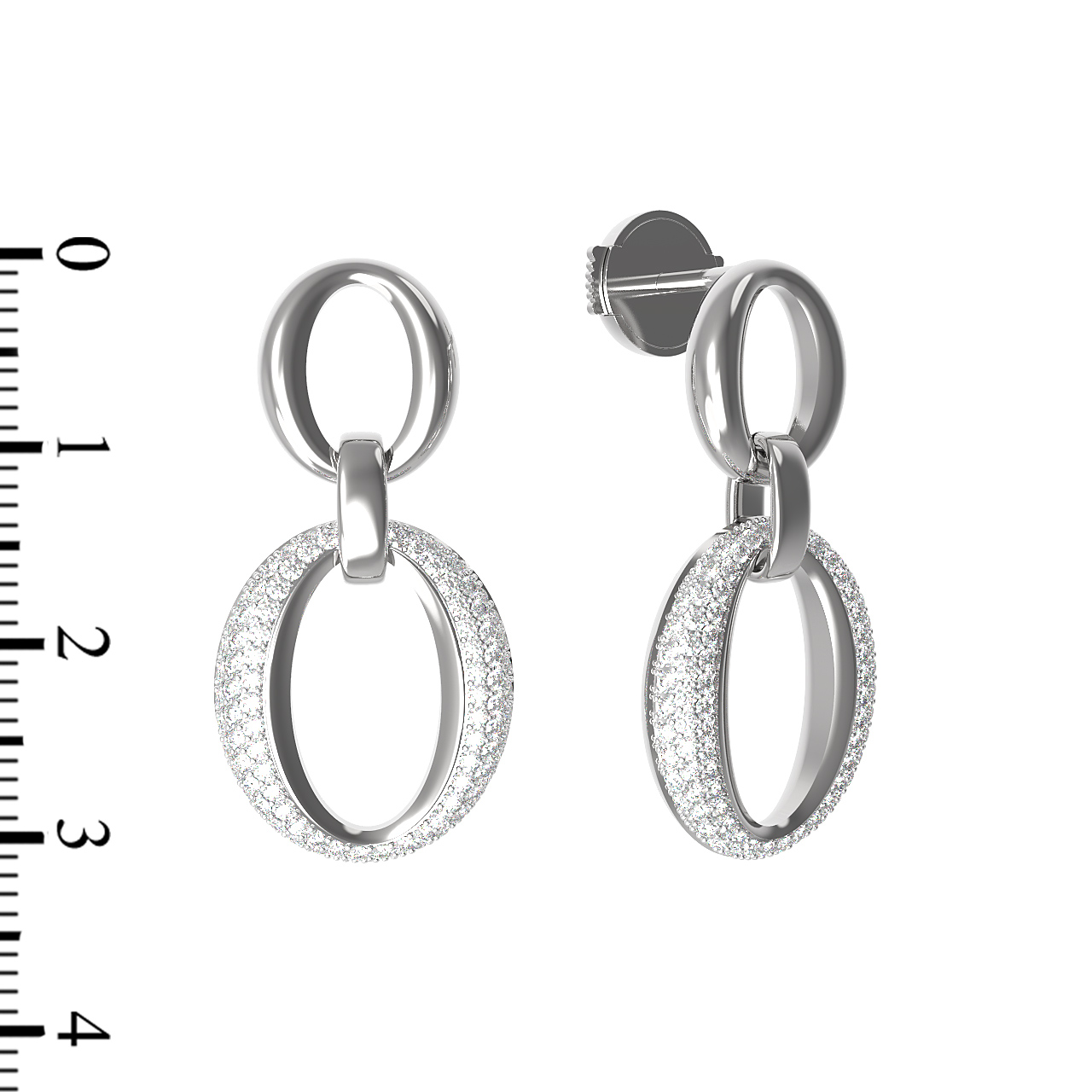 Серьги из белого золота 585 пробы из коллекции De Luxe Бриллианты — Royal — это воплощение современной элегантности и безупречного стиля. Ювелирное украшение выполнено в виде лаконичных овальных звеньев, где верхняя часть изделия подчеркивает благородный блеск полированного металла, а нижняя инкрустирована россыпью драгоценных камней. Для создания этого сияющего акцента мастера использовали 176 круглых бриллиантов с белым цветом вставок, которые создают завораживающий световой эффект при каждом движении.