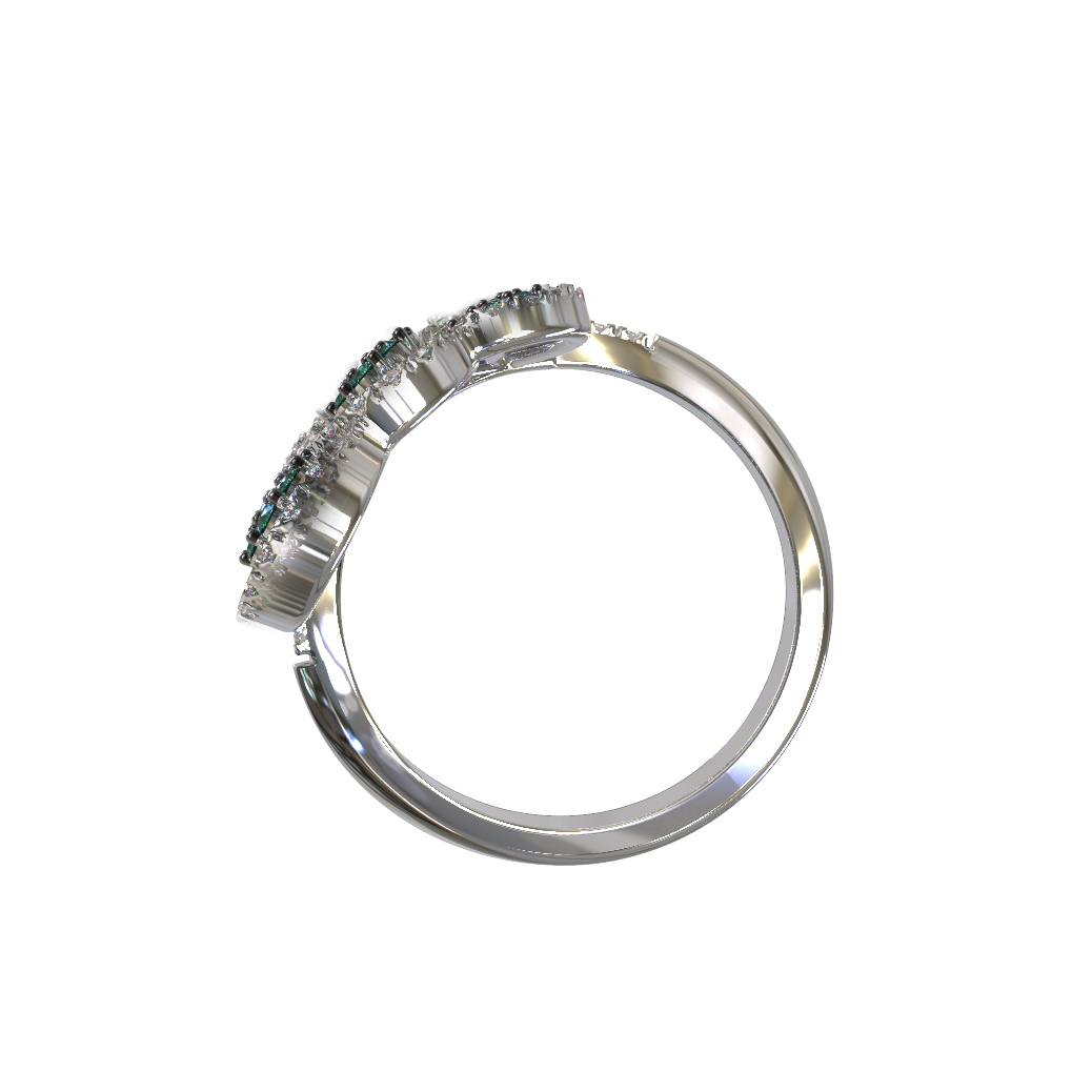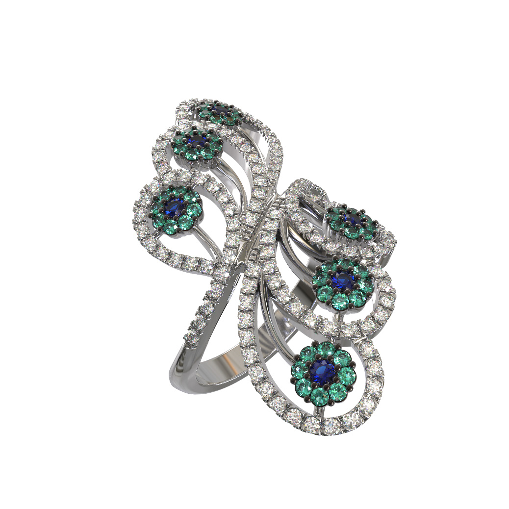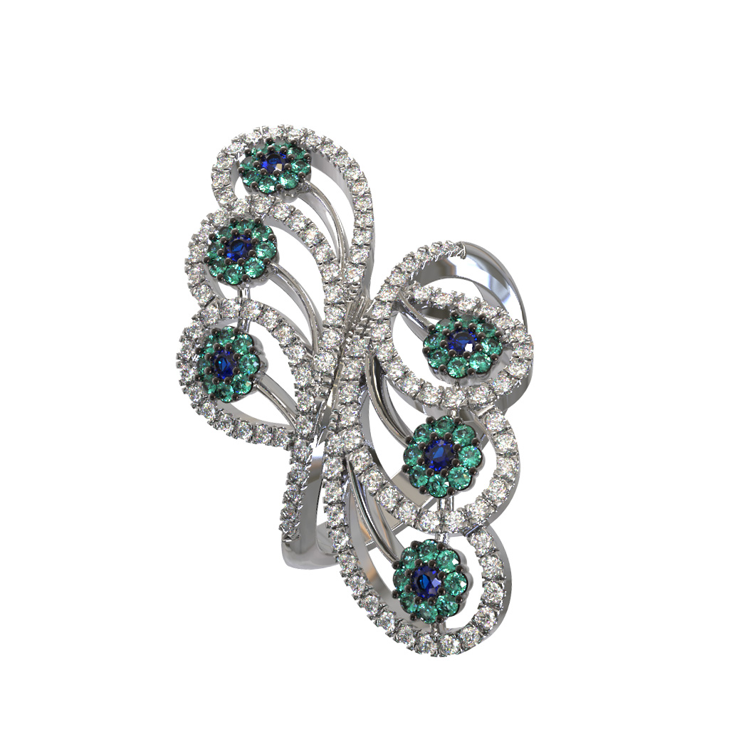 Кольцо из белого золота c бриллиантами, сапфиром и изумрудом