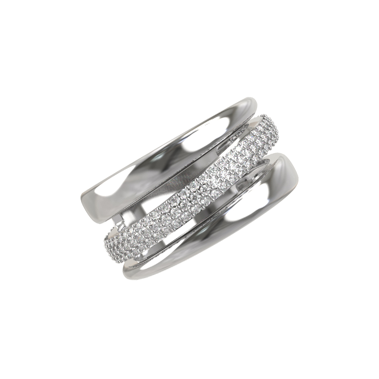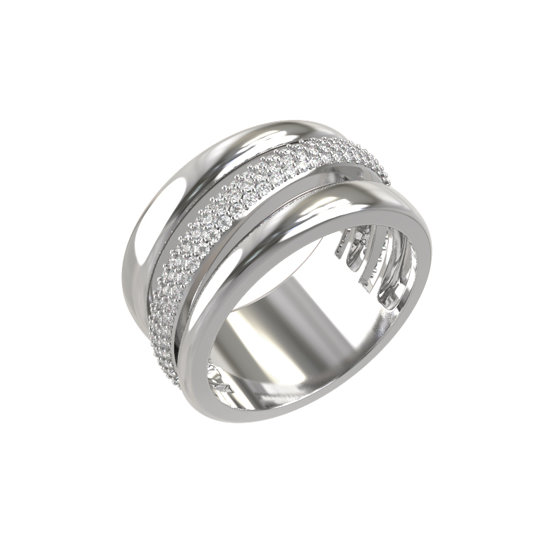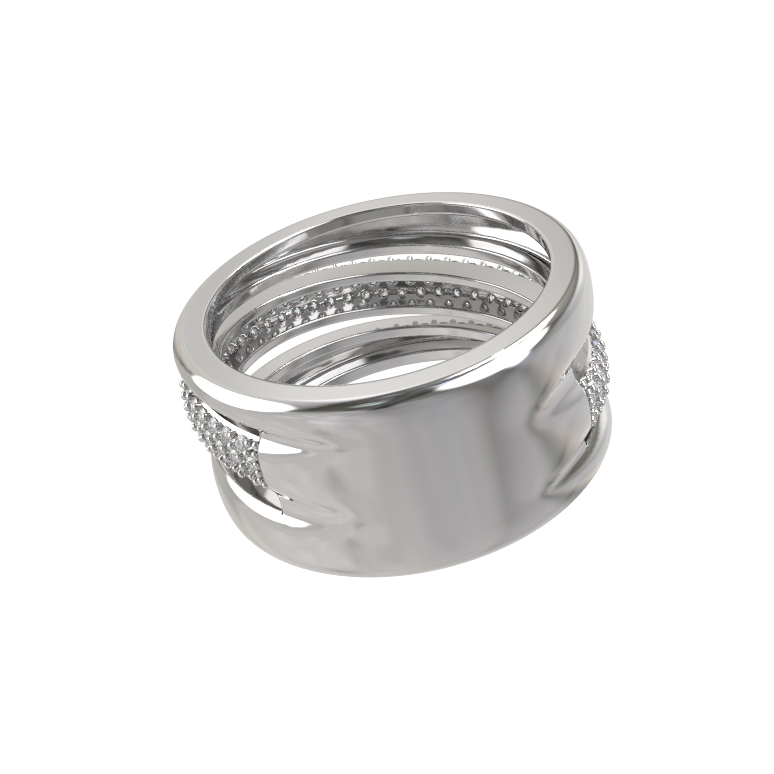 Центральную часть изделия украшает россыпь из 127 бриллиантов круглой огранки. Белые камни обладают ослепительным сиянием, которое эффектно контрастирует с холодным блеском белого золота. Сложная многослойная конструкция кольца создает объем и динамику, превращая украшение в настоящее произведение искусства. Тщательная полировка металла до зеркального блеска придает кольцу благородный вид, делая его идеальным дополнением к вечернему наряду или акцентным элементом делового стиля.