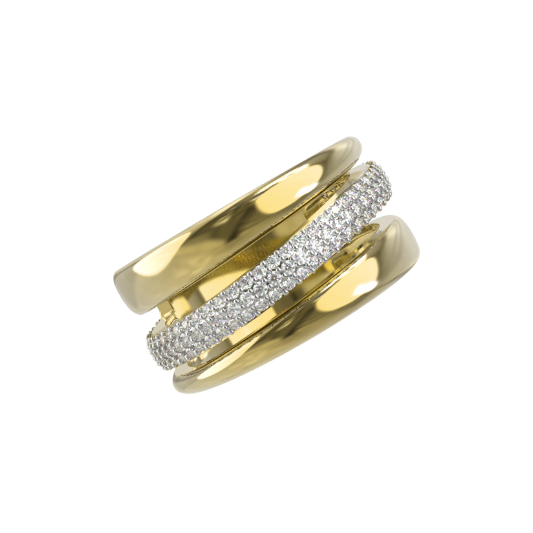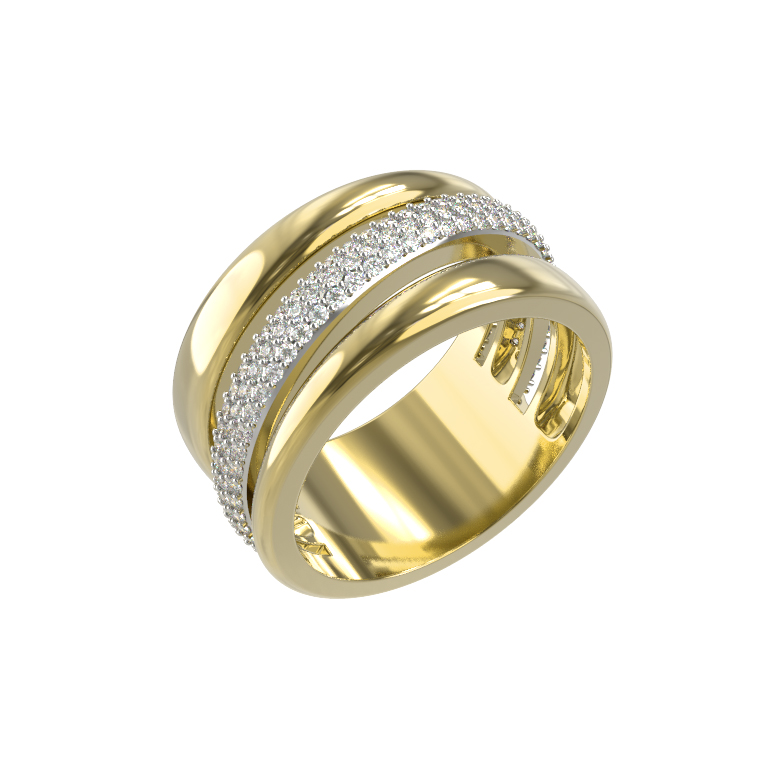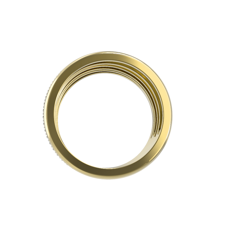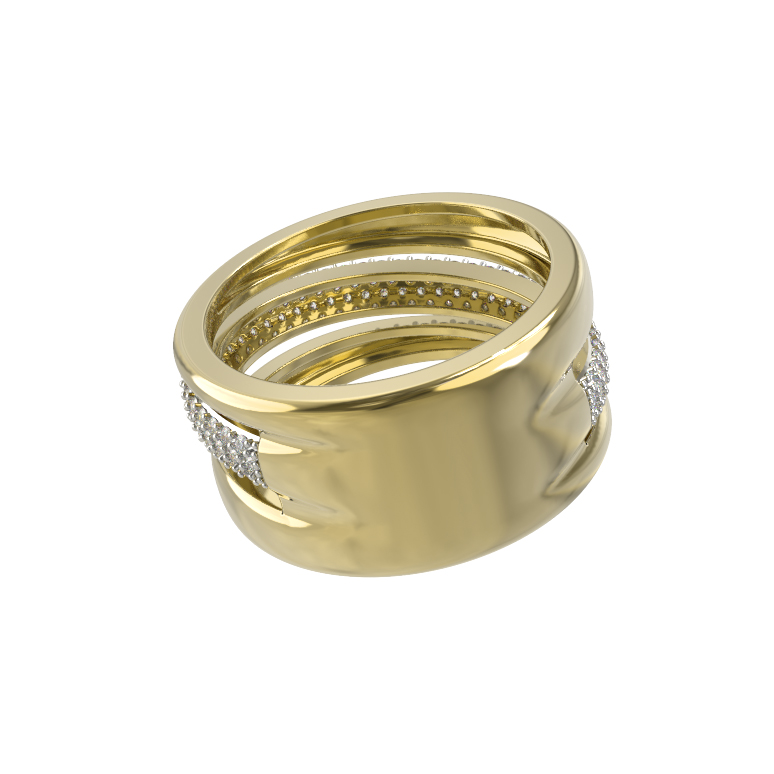 Особую роскошь изделию придает композиция из 127 бриллиантов круглой формы. Белый цвет вставок создает яркий контраст на фоне теплого лимонного оттенка металла, заставляя украшение буквально гореть на свету. Благодаря широкой форме и массивности, это кольцо одинаково органично смотрится как на женской, так и на мужской руке, подчеркивая уверенность и чувство вкуса владельца.