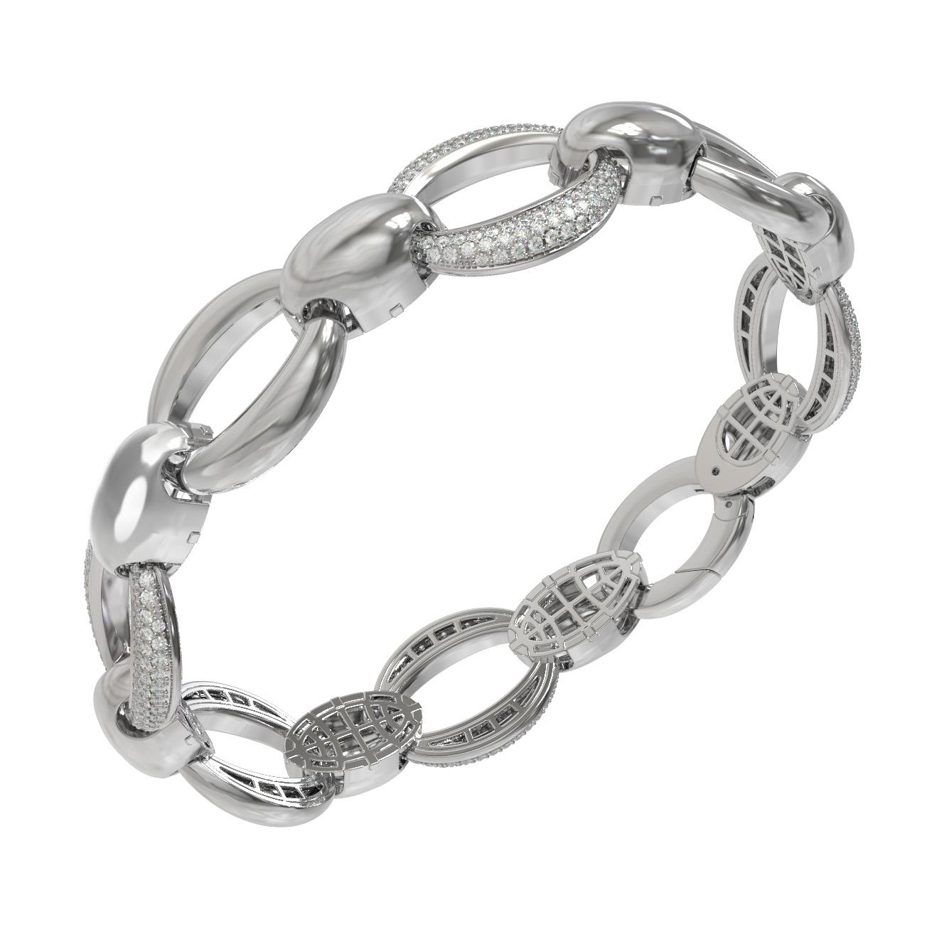 Роскошный браслет из белого золота 585 пробы станет центральным акцентом вашего образа, подчеркивая статус и безупречный вкус. Данное украшение из коллекции De Luxe Бриллианты — Royal выполнено в виде массивных, выразительных звеньев, которые гармонично сочетают в себе гладкий блеск металла и ослепительное сияние драгоценных камней. Особый шарм изделию придает богатая инкрустация: 304 бриллианта круглой формы с белым цветом вставок создают непрерывный световой поток, привлекающий внимание при каждом движении руки.