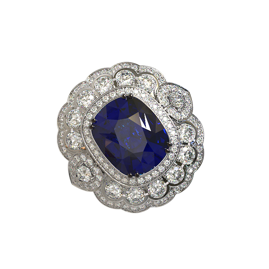 Роскошное кольцо из белого золота 585 пробы станет центральным акцентом вашего образа. Изделие из коллекции De Luxe Бриллианты — Classic завораживает своим дизайном: в центре композиции расположен крупный сапфир синего цвета огранки кушон, который создает глубокий и насыщенный контраст с благородным металлом. Величественный образ дополняют 151 вставка из бриллиантов круглой формы белого цвета, искусно обрамляющие центральный камень и создающие великолепное сияние при каждом движении.
