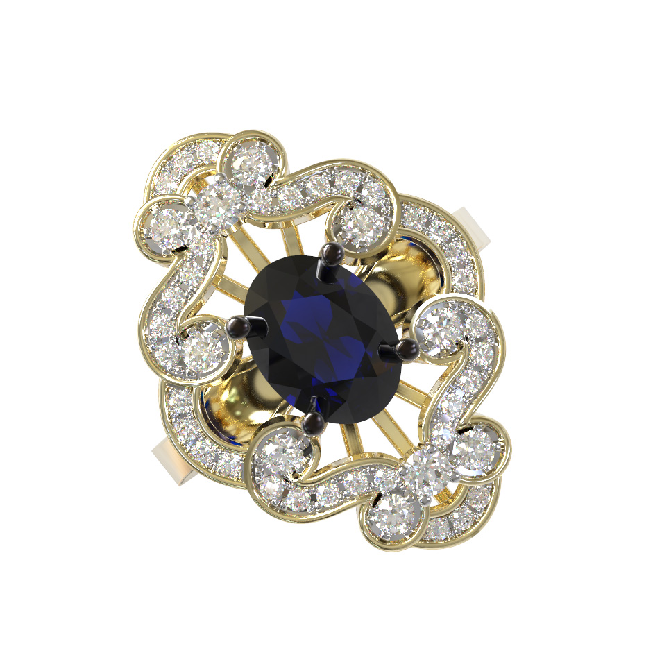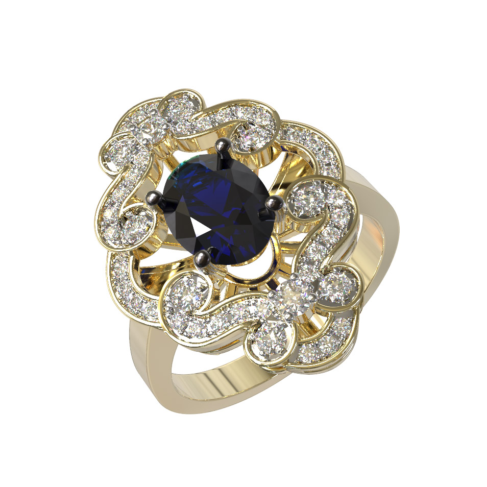Кольцо из лимонного золота 585 пробы из коллекции De Luxe Бриллианты — Classic — это воплощение изысканности и утонченного вкуса. Мастерски выполненное изделие притягивает взгляд своей сложной, ажурной формой и благородным сочетанием драгоценных металлов и камней. В центре композиции расположен роскошный сапфир овальной формы глубокого синего цвета, который служит главным акцентом украшения. Его насыщенный оттенок эффектно контрастирует с теплым сиянием лимонного золота и ослепительным блеском 45 бриллиантов круглой огранки белого цвета.