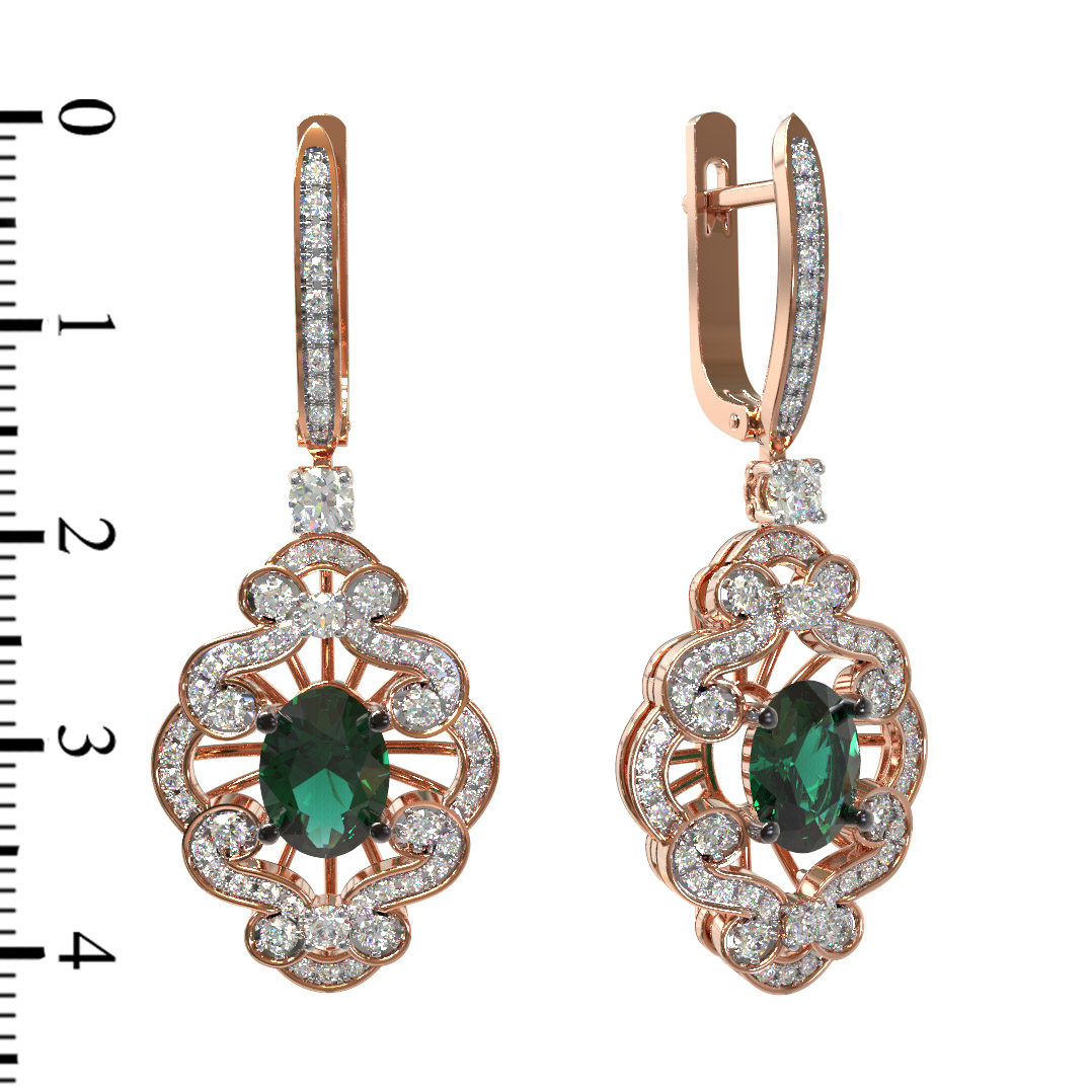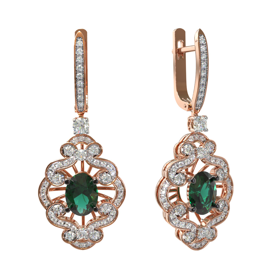 Центральным элементом композиции является выразительный изумруд овальной формы глубокого зеленого цвета, который притягивает взгляд своим насыщенным оттенком. Изысканность дизайна дополняют 110 вставок, среди которых преобладают сверкающие бриллианты круглой огранки белого цвета. Обилие драгоценных камней создает неповторимую игру света, превращая серьги в настоящий ювелирный шедевр.
