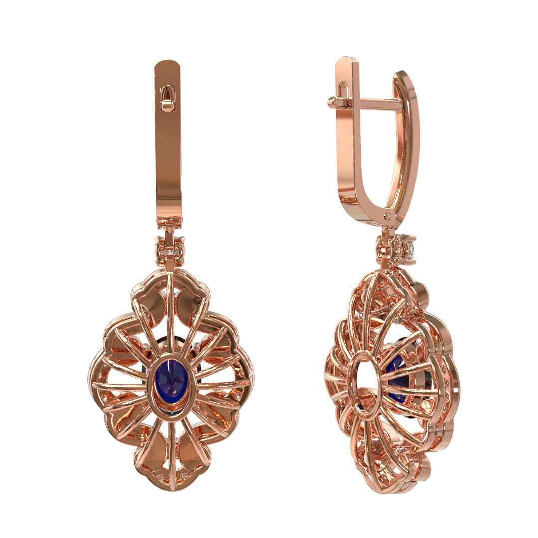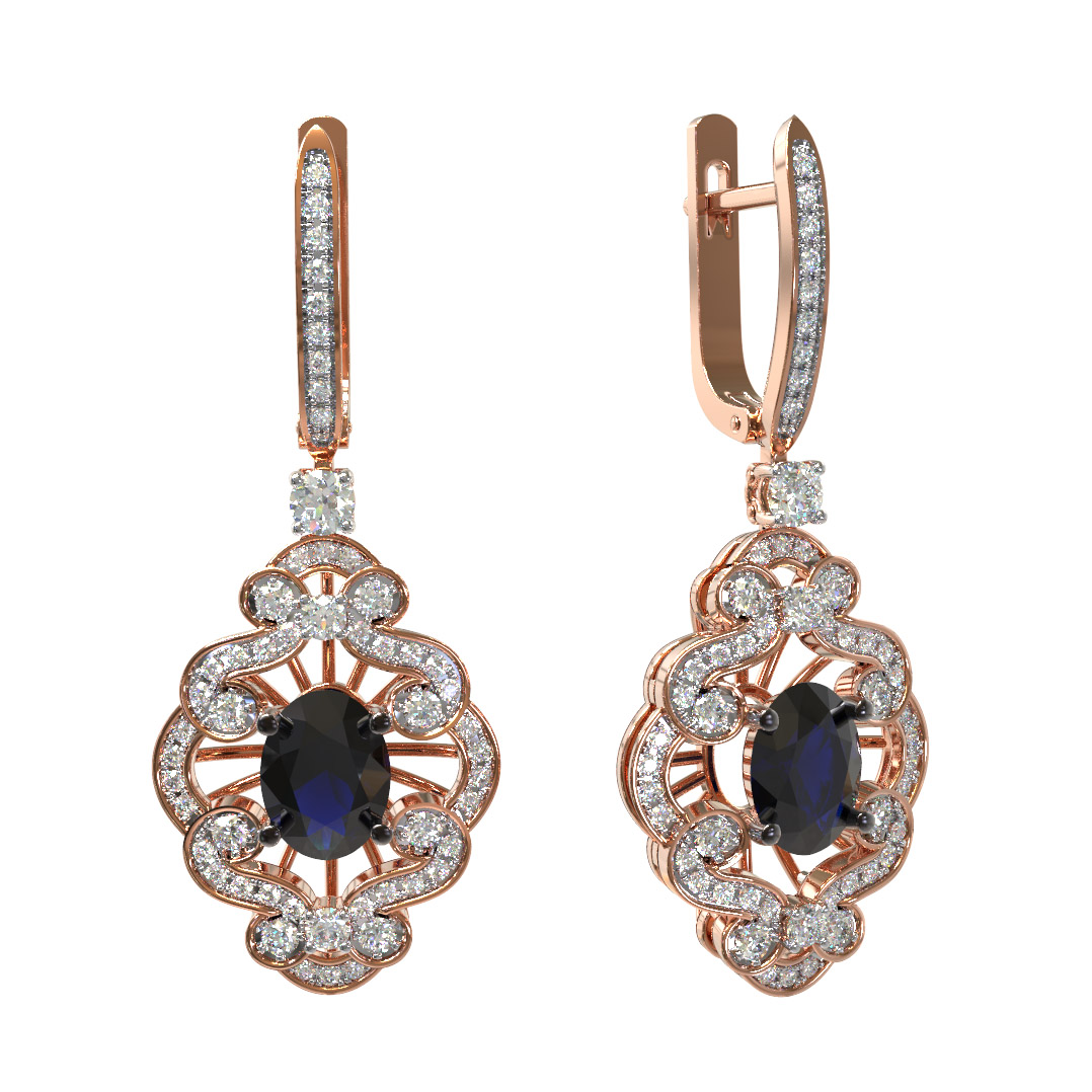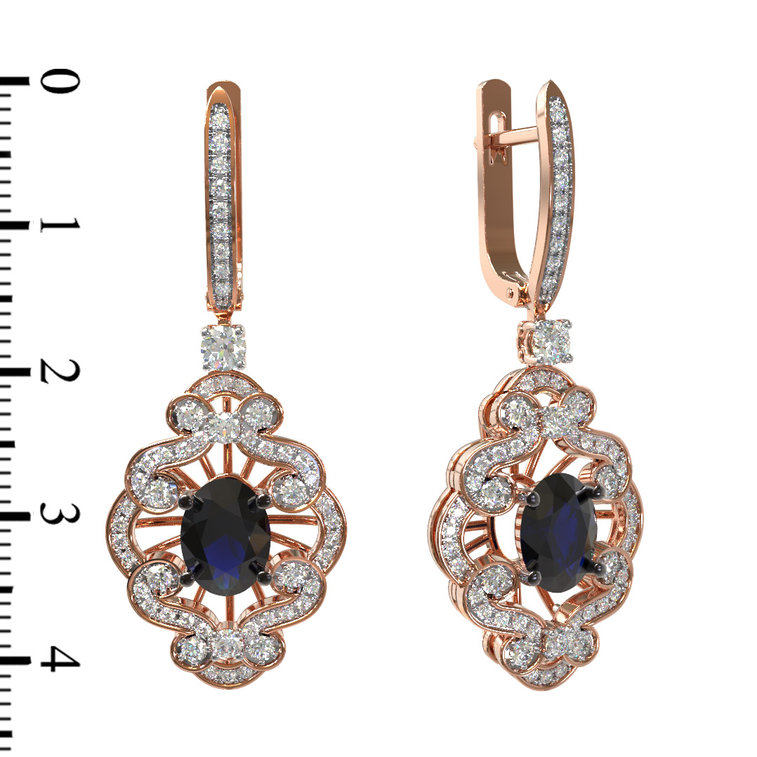 Центральным элементом композиции является выразительный сапфир синего цвета овальной формы, который завораживает своей насыщенностью. Его красоту идеально дополняет россыпь из 110 бриллиантов белого цвета круглой формы, украшающих не только изысканную оправу, но и надежный замок серег. Сложная ажурная форма изделия создает эффект легкости, несмотря на богатство отделки. Эти серьги созданы для тех, кто ценит статус и безупречное качество исполнения.
