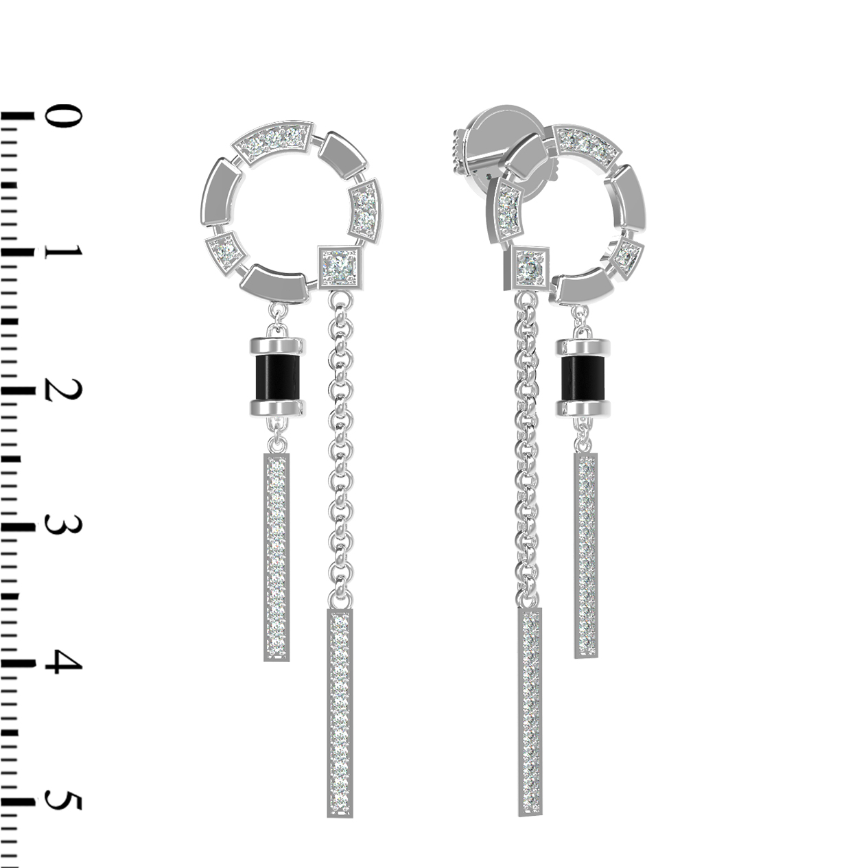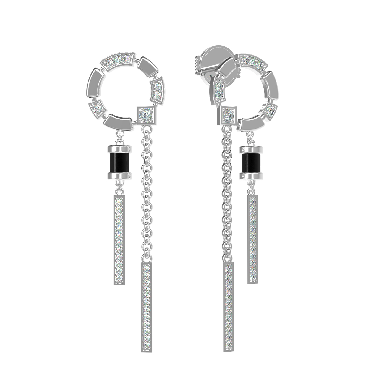 Главным акцентом дизайна стали вставки из оникса цилиндрической формы, которые привносят в изделие глубокий черный цвет, эффектно контрастирующий с белыми бриллиантами. Всего в серьгах использованы 64 вставки круглой и цилиндрической формы, искусно расположенные по всей конструкции. Бриллианты придают изделию роскошное мерцание, которое перекликается с лаконичной строгостью оникса.