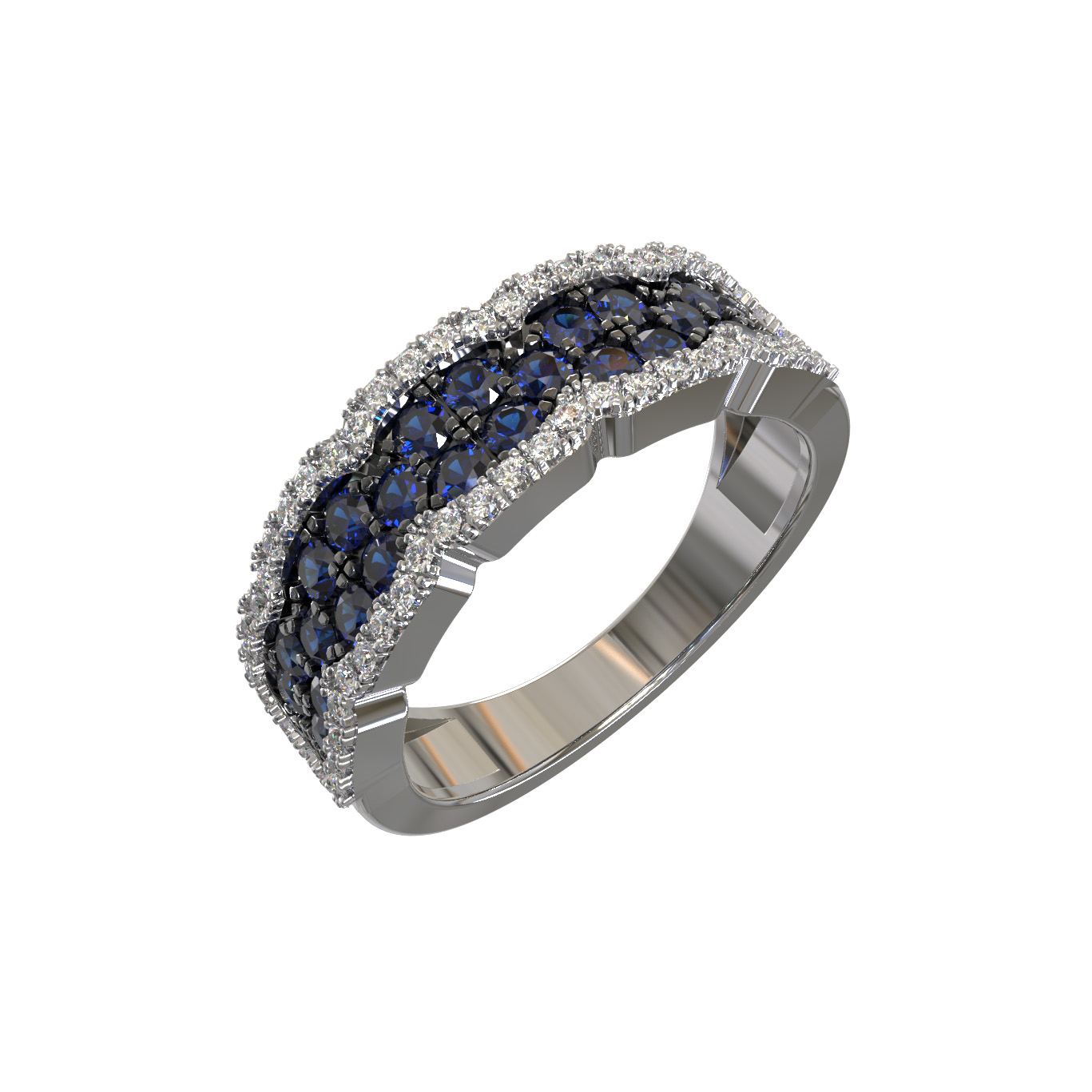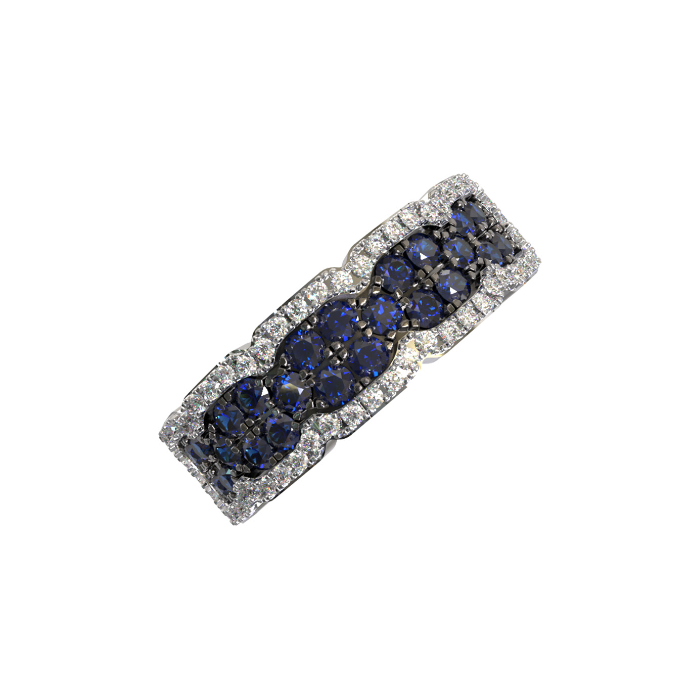 Композиция украшена 80 камнями круглой огранки, создающими великолепный контраст. В центре внимания — насыщенные синие сапфиры, которые обрамлены сверкающими белыми бриллиантами. Сочетание глубокого синего и чистого белого цветов подчеркивает статусность изделия. Это ювелирное украшение подойдет как для женщин, так и для мужчин, обладающих чувством стиля.