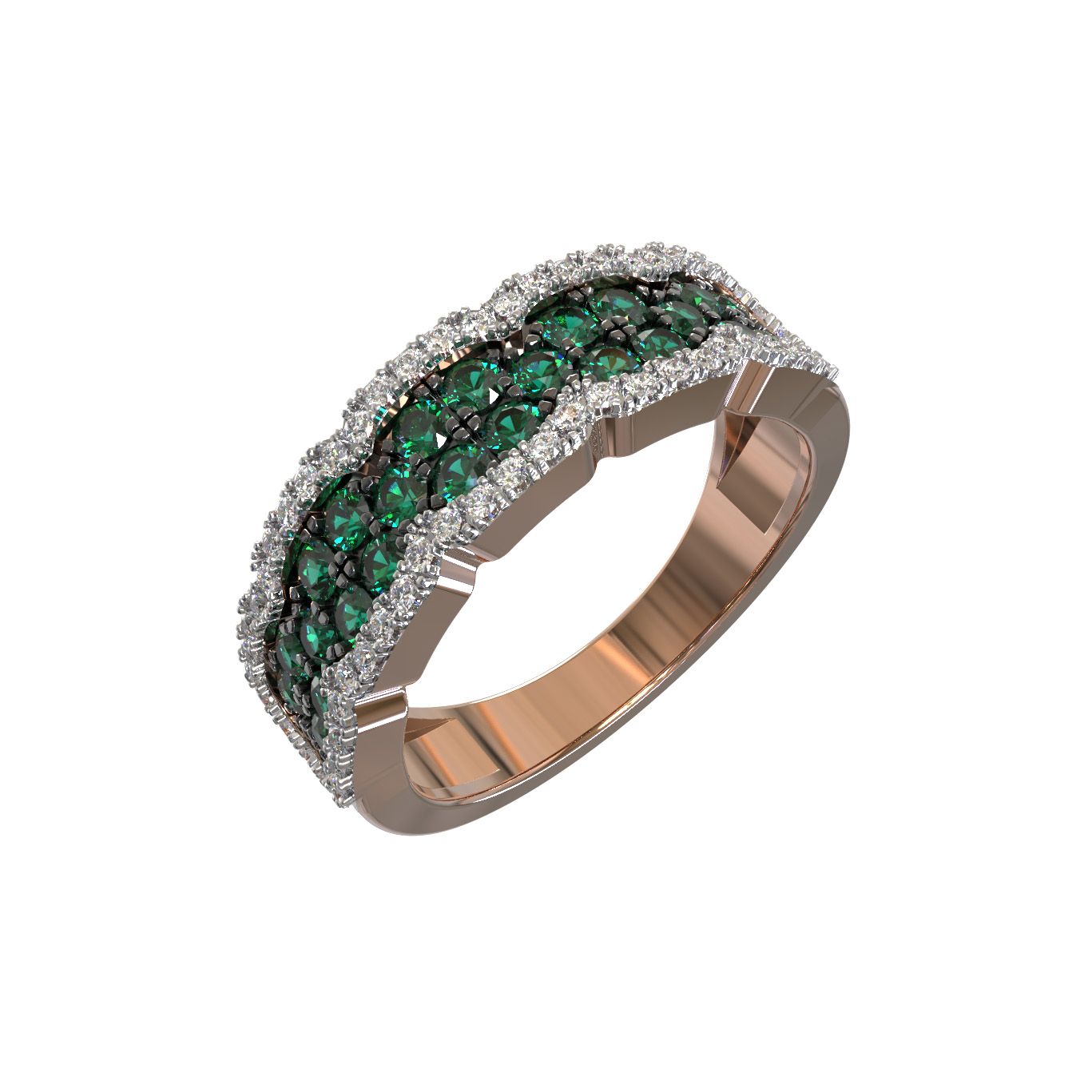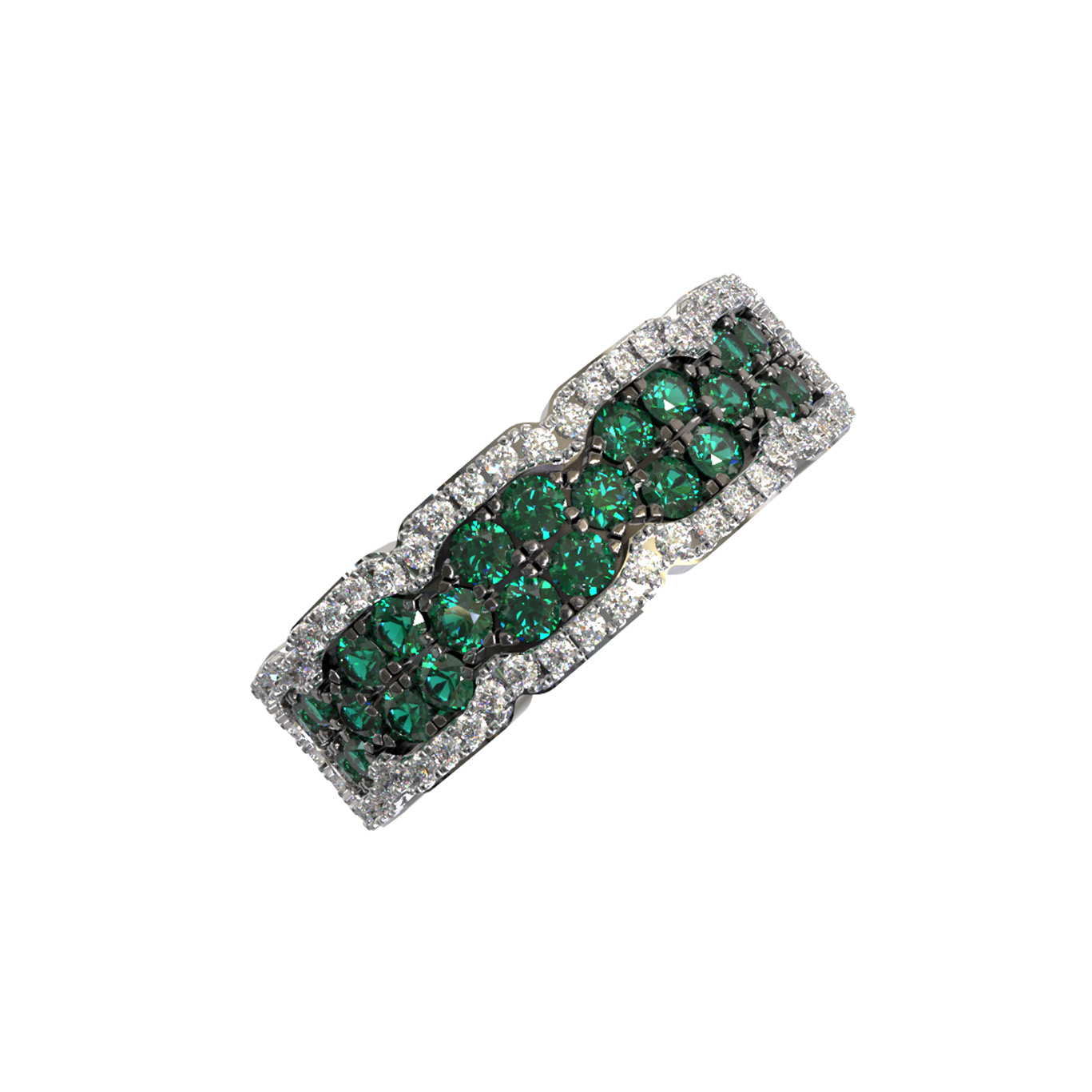 Великолепие кольца подчеркивается россыпью из 80 вставок, где круглые бриллианты белого цвета создают ослепительное обрамление, усиливающее сияние изумрудов. Использование качественных материалов и филигранная работа ювелиров делают это украшение выразительным дополнением любого стиля. Кольцо доступно в широкой размерной сетке от 15 до 23, что позволяет подобрать идеальную посадку для каждого пальца.