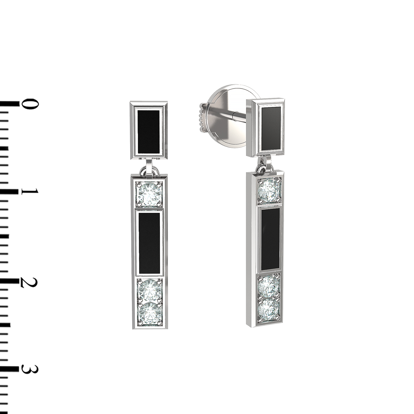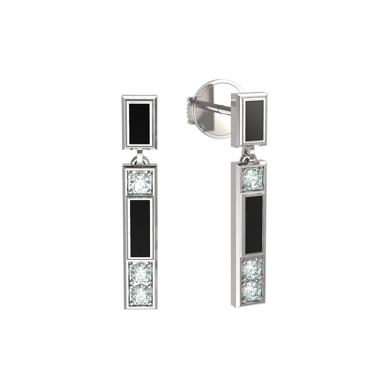В центре композиции — сочетание белых бриллиантов и черного оникса. Мастера использовали 10 вставок различных форм: классические круглые бриллианты гармонично соседствуют с прямоугольными элементами оникса. Такая игра фактур и форм делает эти серьги универсальным дополнением как для женского, так и для мужского гардероба. Белый цвет материала подчеркивает чистоту линий, а надежное крепление гарантирует комфорт при повседневном ношении.