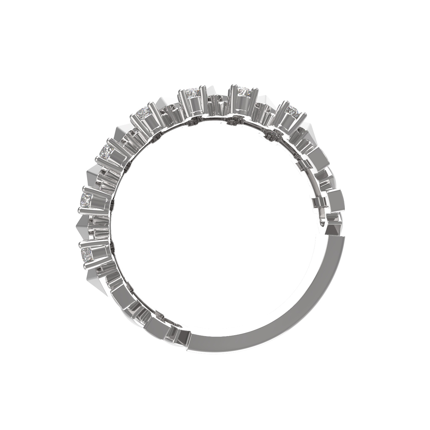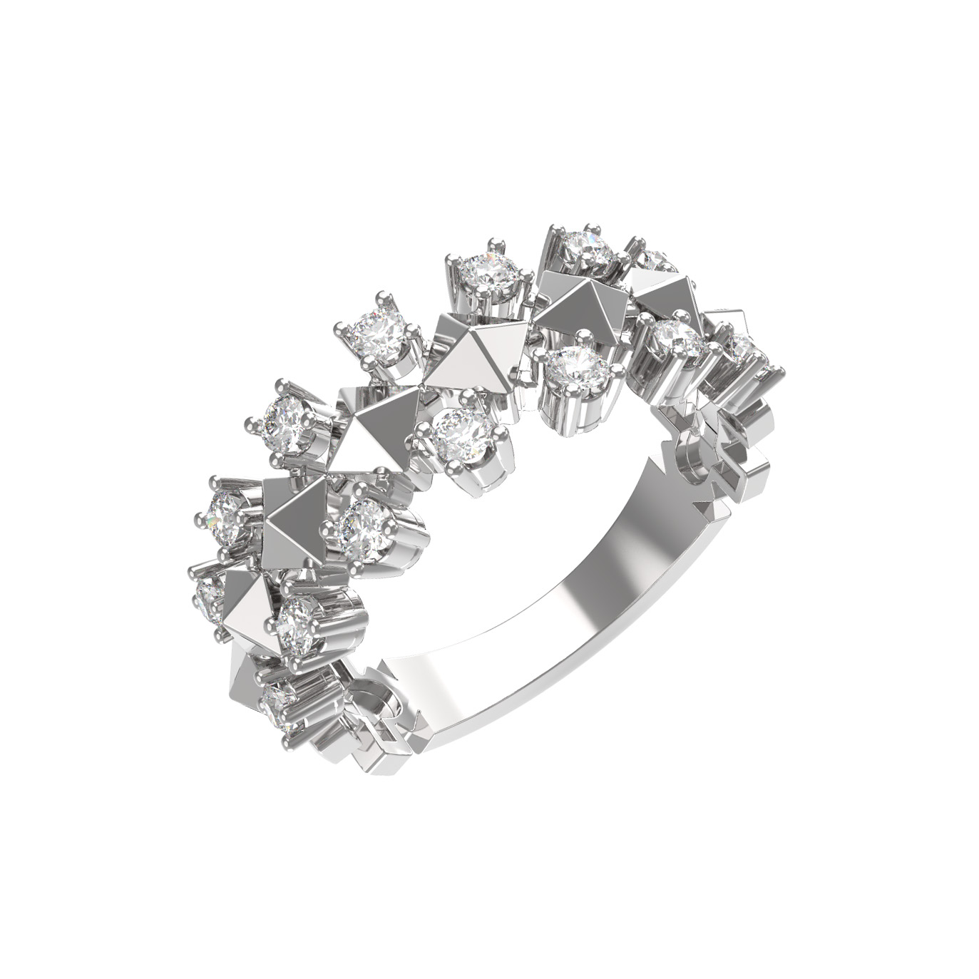 Кольцо из белого золота 585 пробы из коллекции De Luxe Бриллианты — Pyramids — это воплощение современной геометрии и утонченного блеска. Дизайн украшения строится на контрасте строгих линий и сияния драгоценных камней, что создает динамичный и запоминающийся образ. Центральный элемент декора — чередующиеся пирамидальные формы и круглые вставки, которые придают изделию архитектурную выразительность и глубину.
